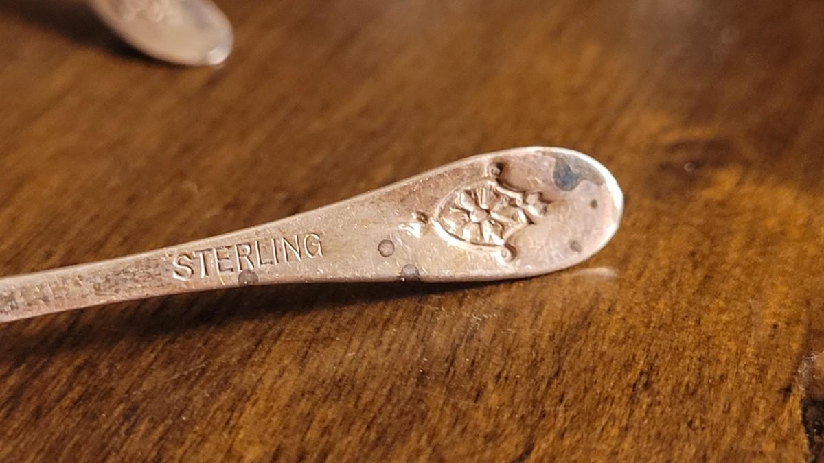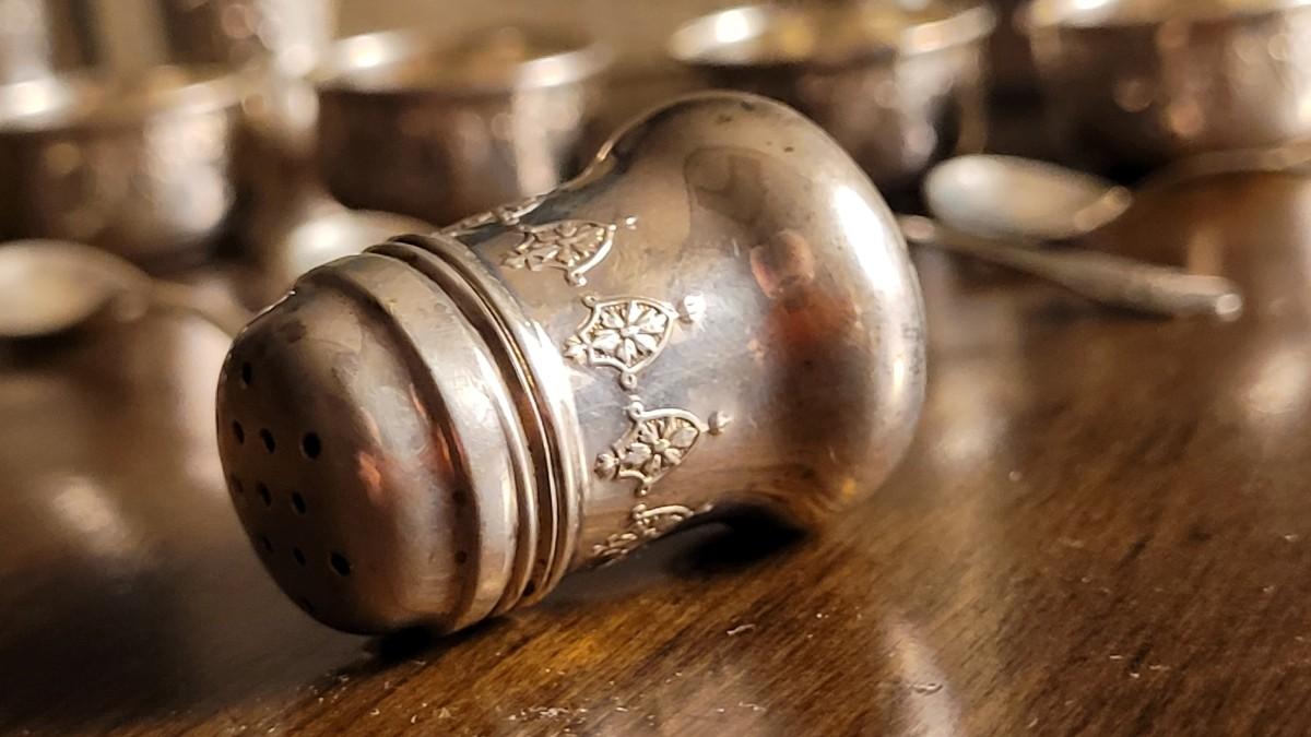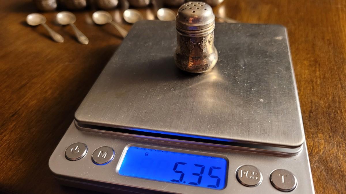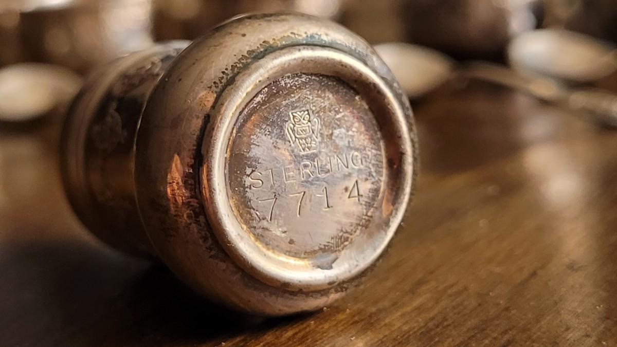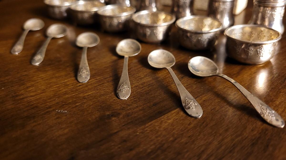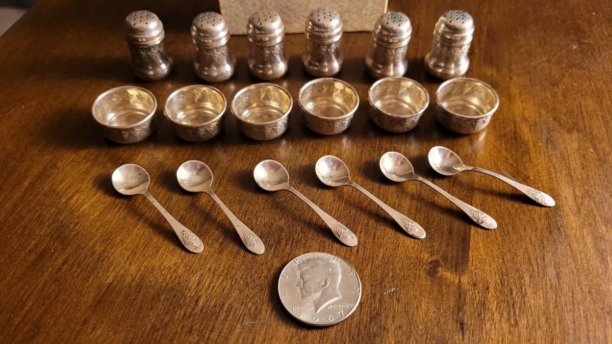 This lot features a darling and scarce 18 Piece Vintage Sterling Silver Children's Bowl/Spoon/Shaker Play Set. Each piece is in nice condition for age and all are individually stamped with a Sterling Silver mark. A Half Dollar has been inserted for scale in one of the photos (coin not included in auction).