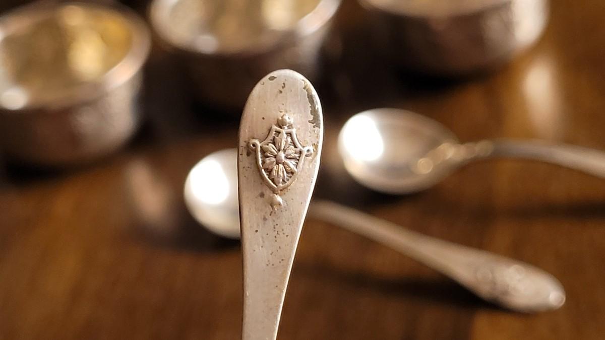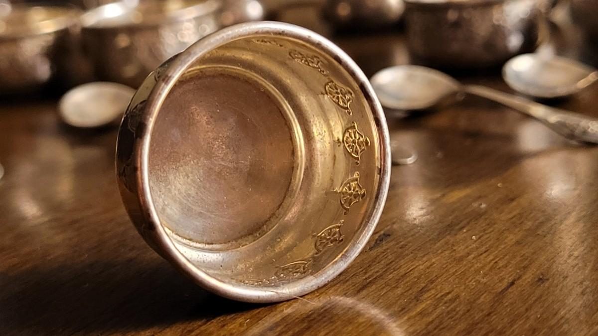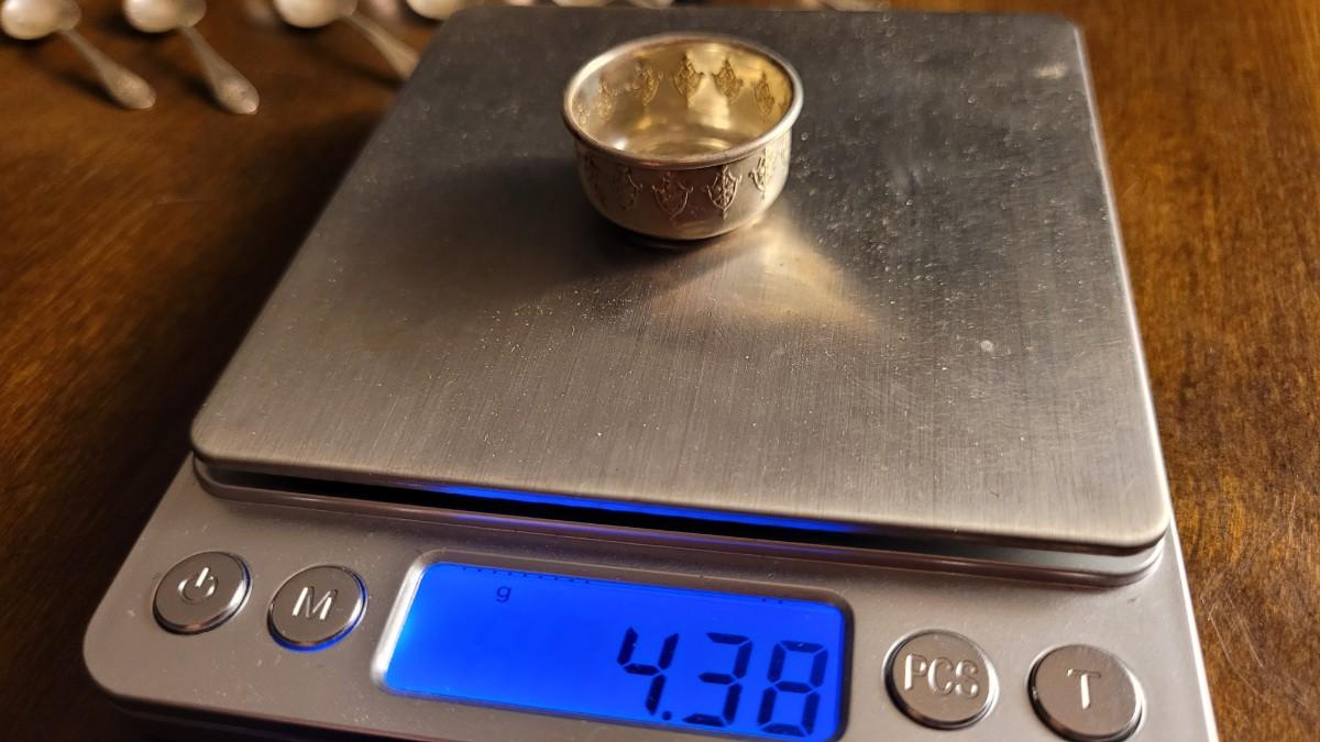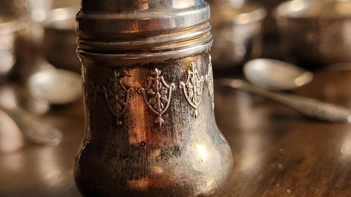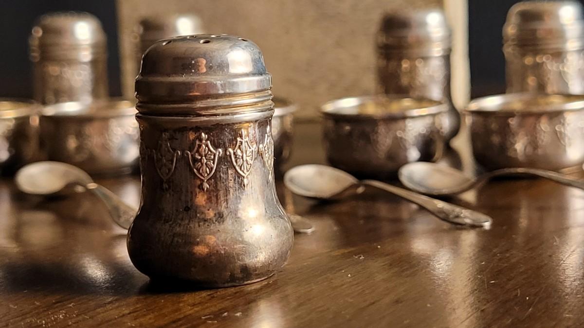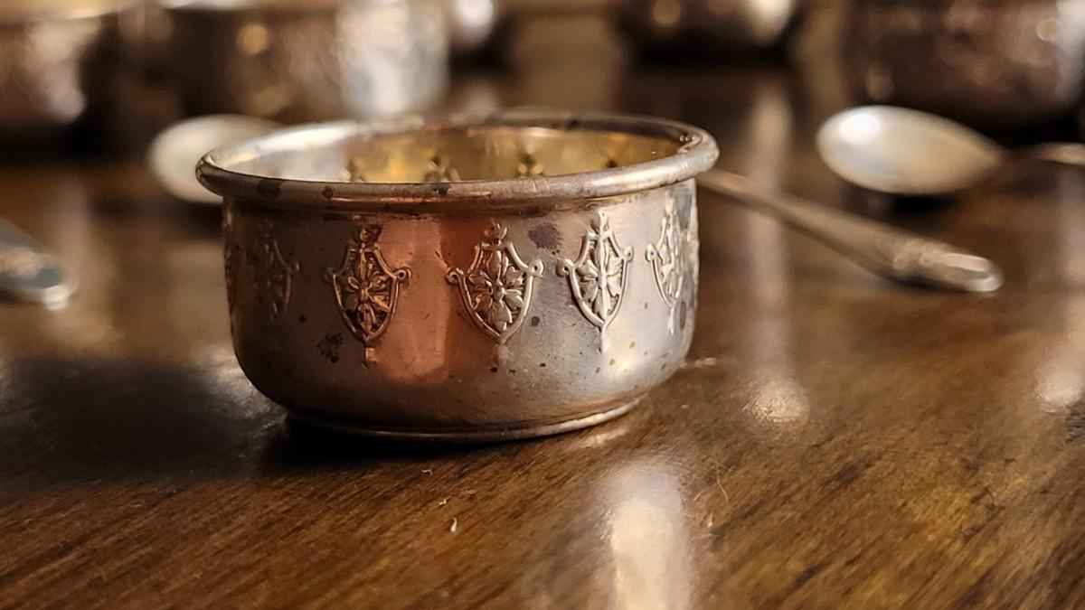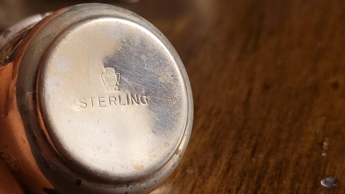 This lot features a darling and scarce 18 Piece Vintage Sterling Silver Children's Bowl/Spoon/Shaker Play Set. Each piece is in nice condition for age and all are individually stamped with a Sterling Silver mark. A Half Dollar has been inserted for scale in one of the photos (coin not included in auction).