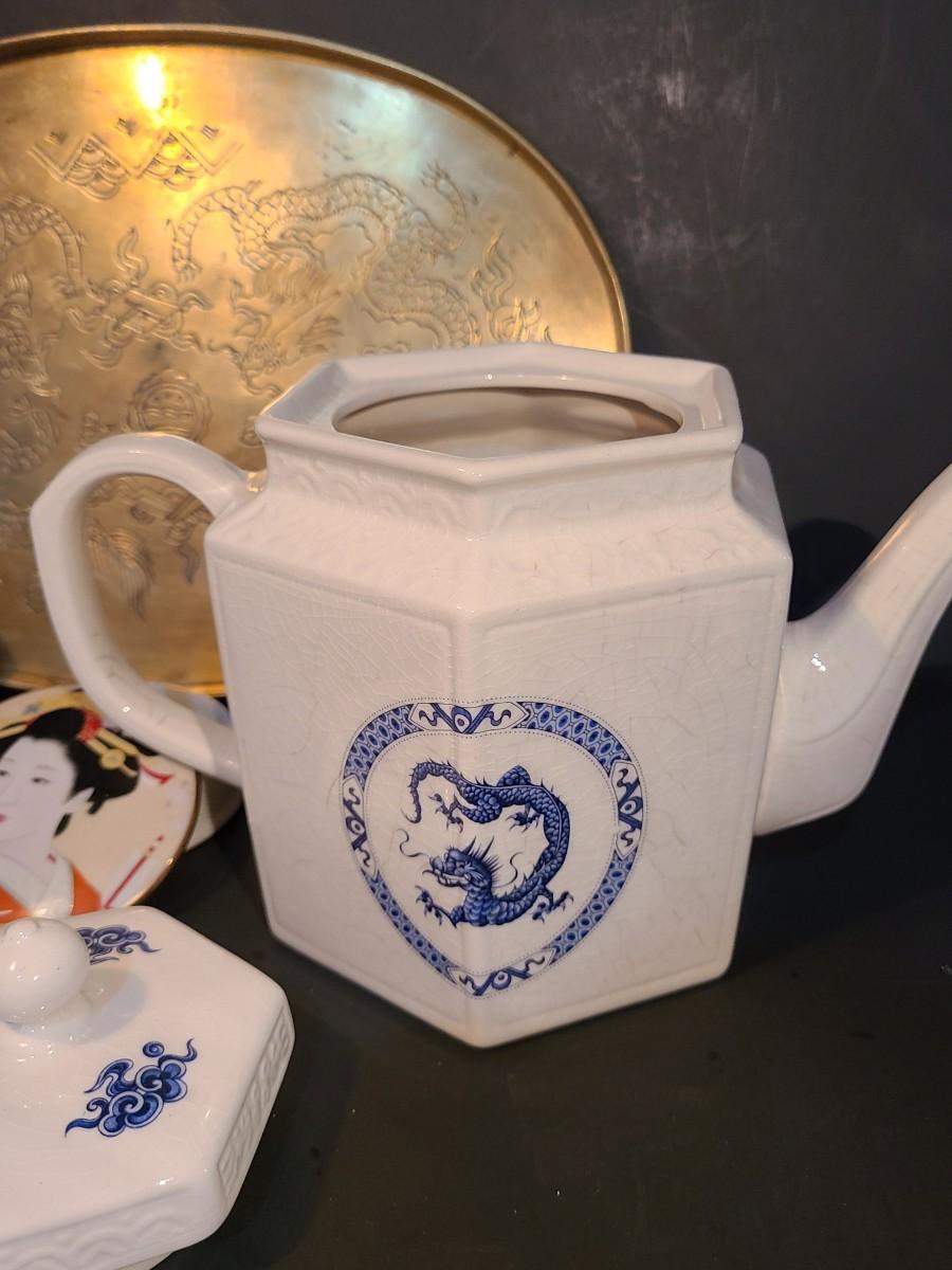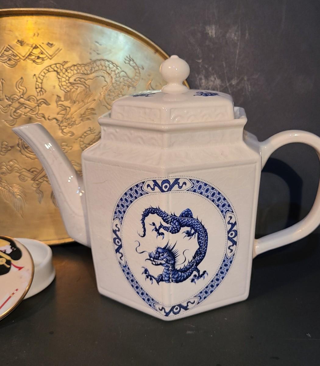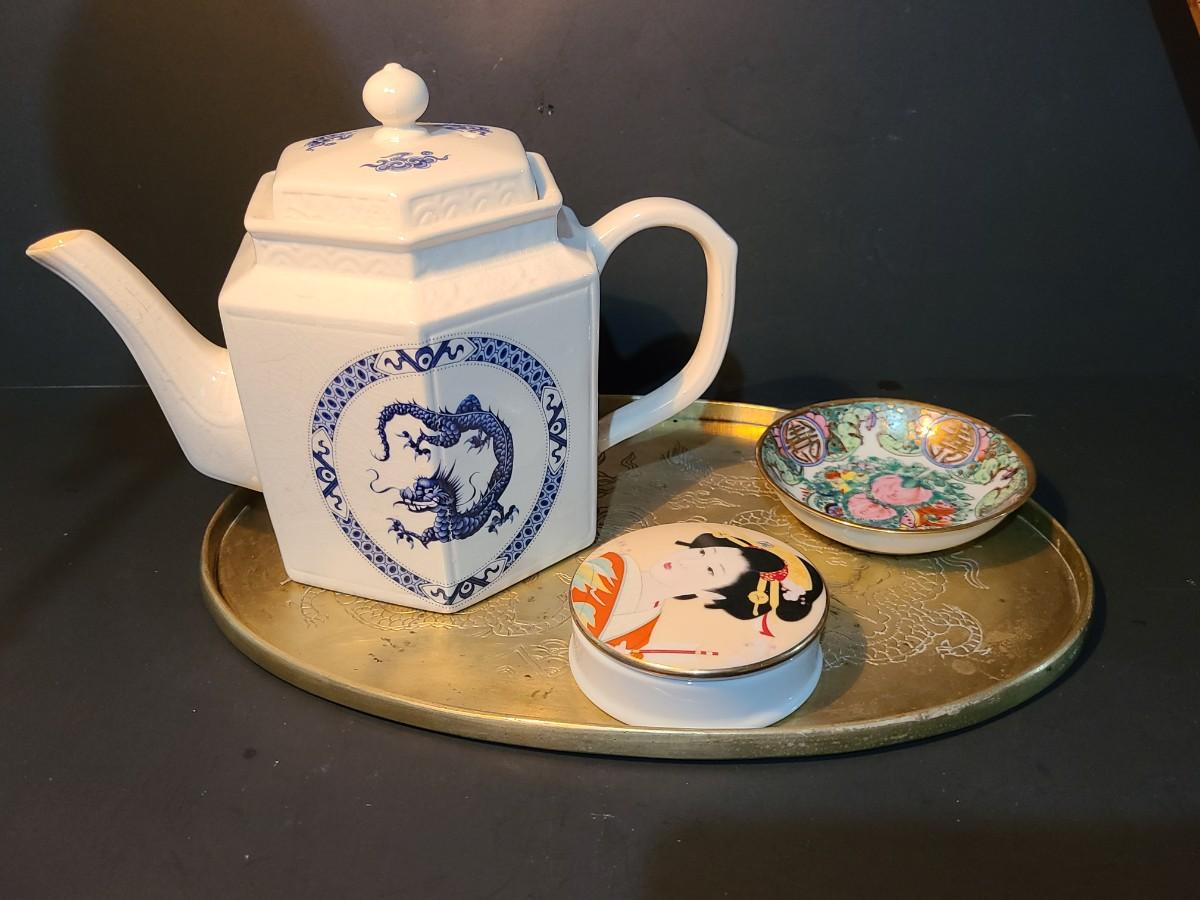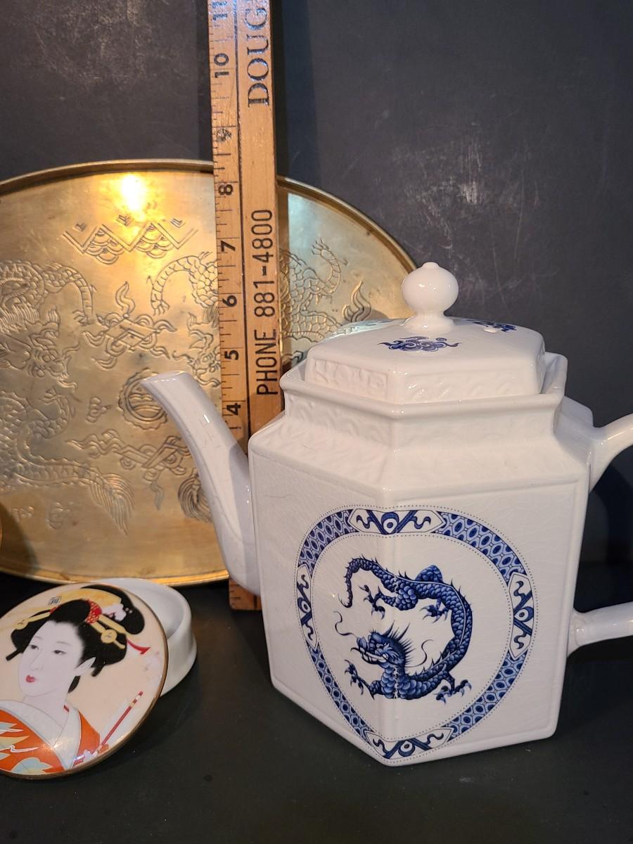 Vintage tray with dragons, solid brass, Staffordshire English teapot with dragons does have small fleabite chip on edge of pour, and trinket dishes. Please see all pictures for condition and measurements.