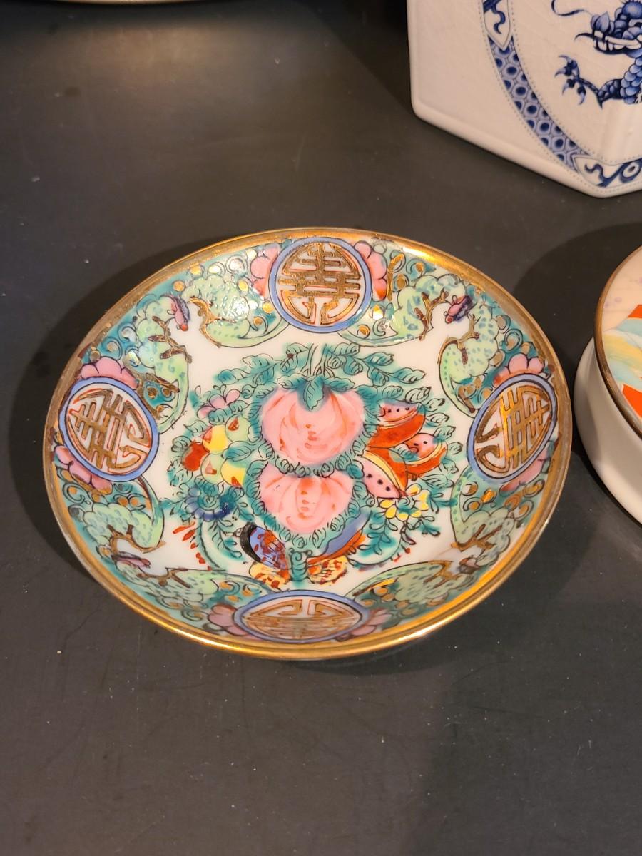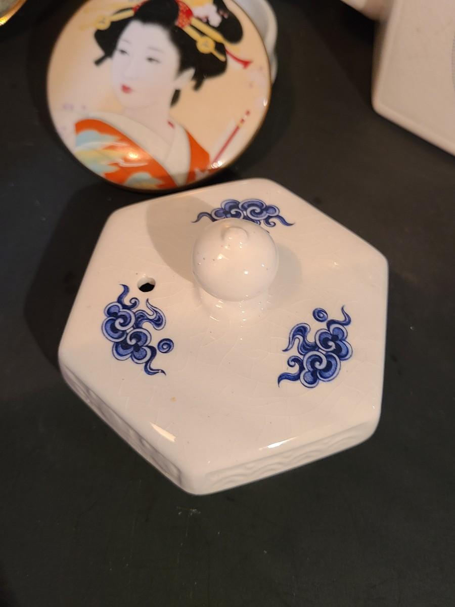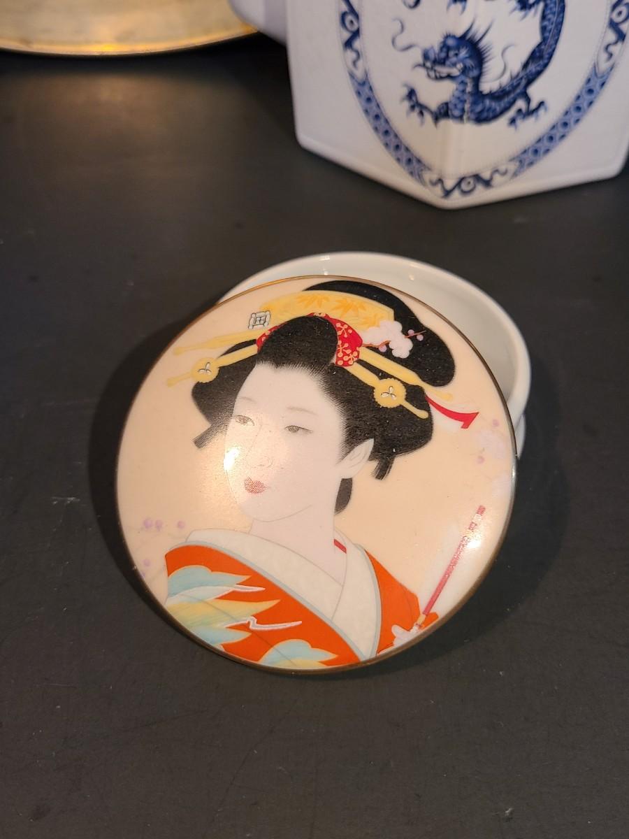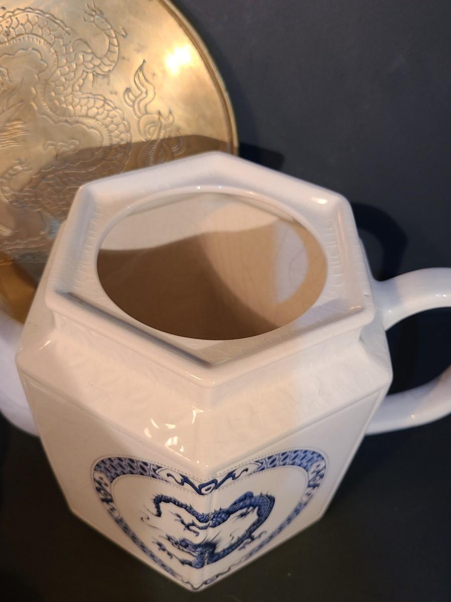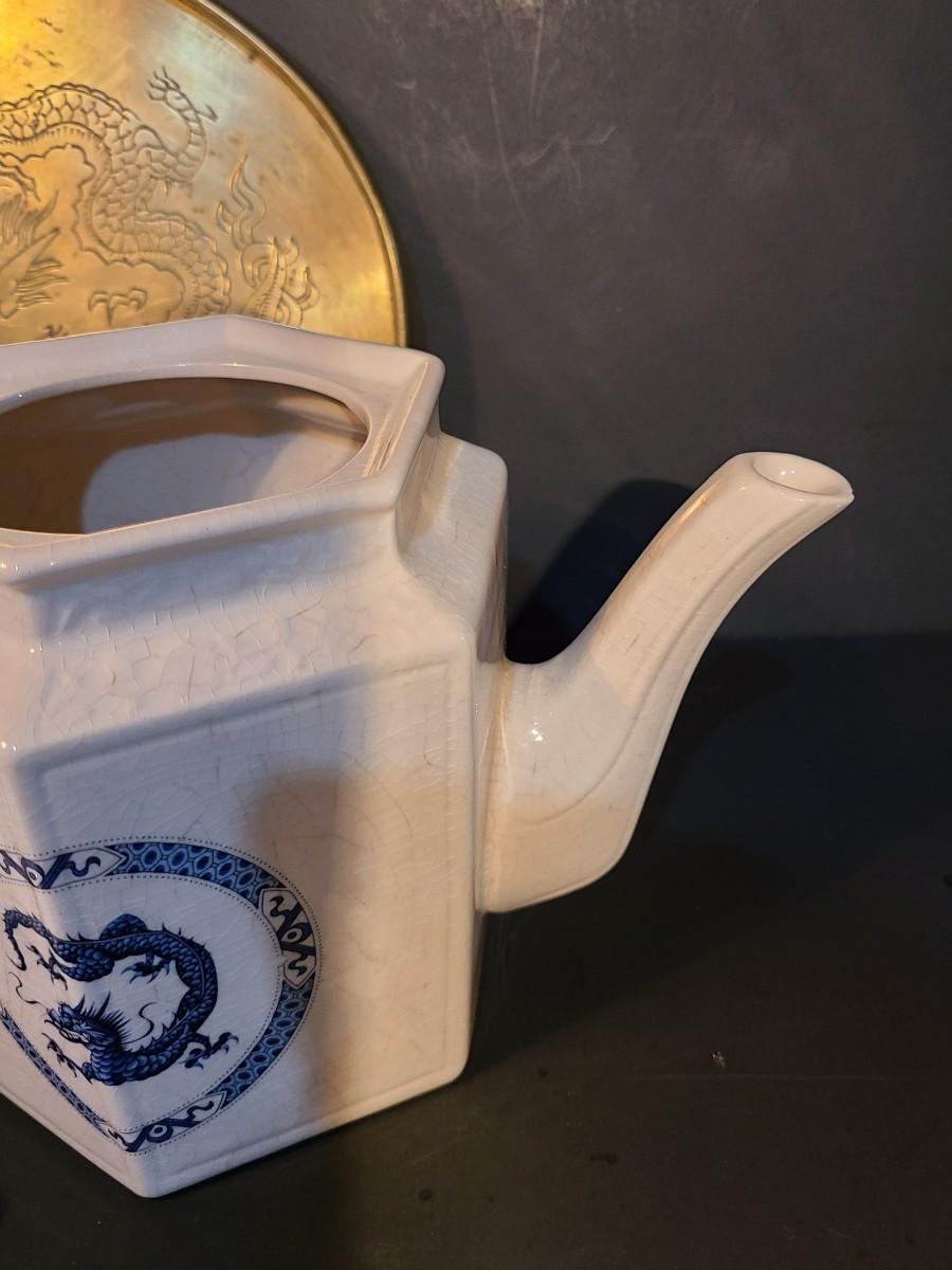 Vintage tray with dragons, solid brass, Staffordshire English teapot with dragons does have small fleabite chip on edge of pour, and trinket dishes. Please see all pictures for condition and measurements.