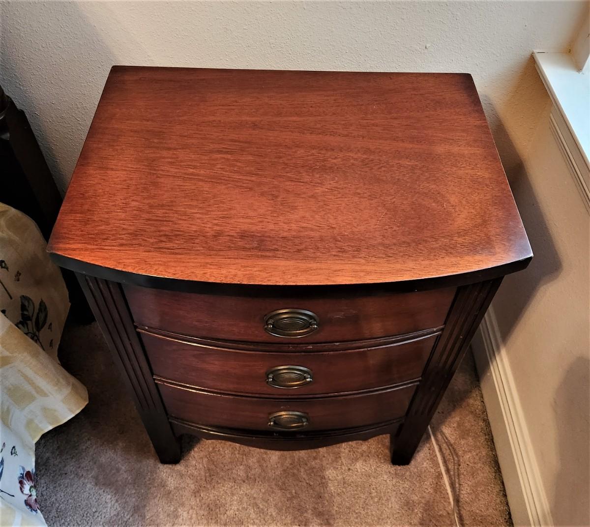 When this nightstand was made, the bedroom set came with only one nightstand, which is why there is not a pair of these. DIXIE Furniture company, mahogany finish, all original. 13.5" deep, 25.5" tall, 20" across. Good vintage condition. This is a versatile piece of furniture that can be used in a lot of ways. Matches the dresser in Lot #121