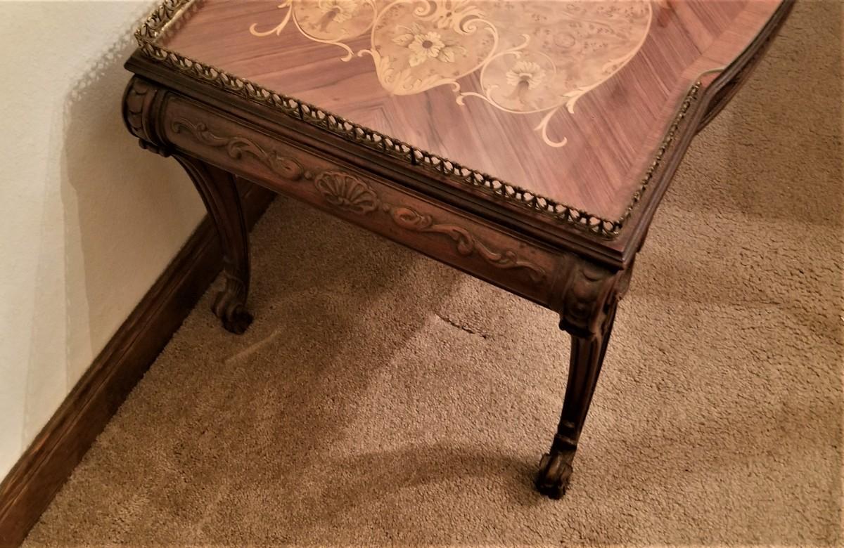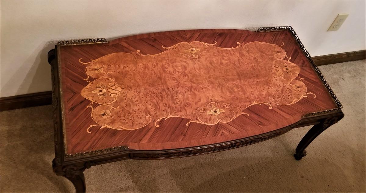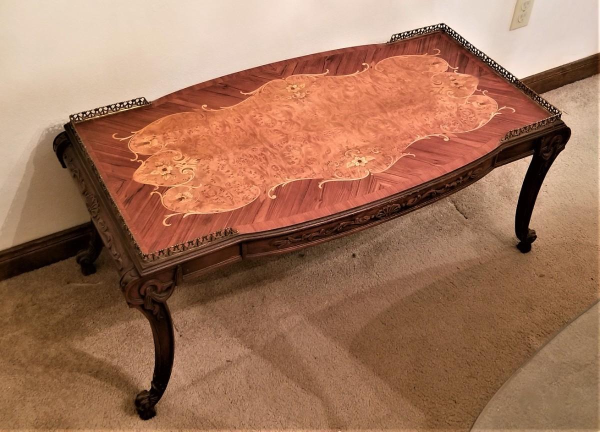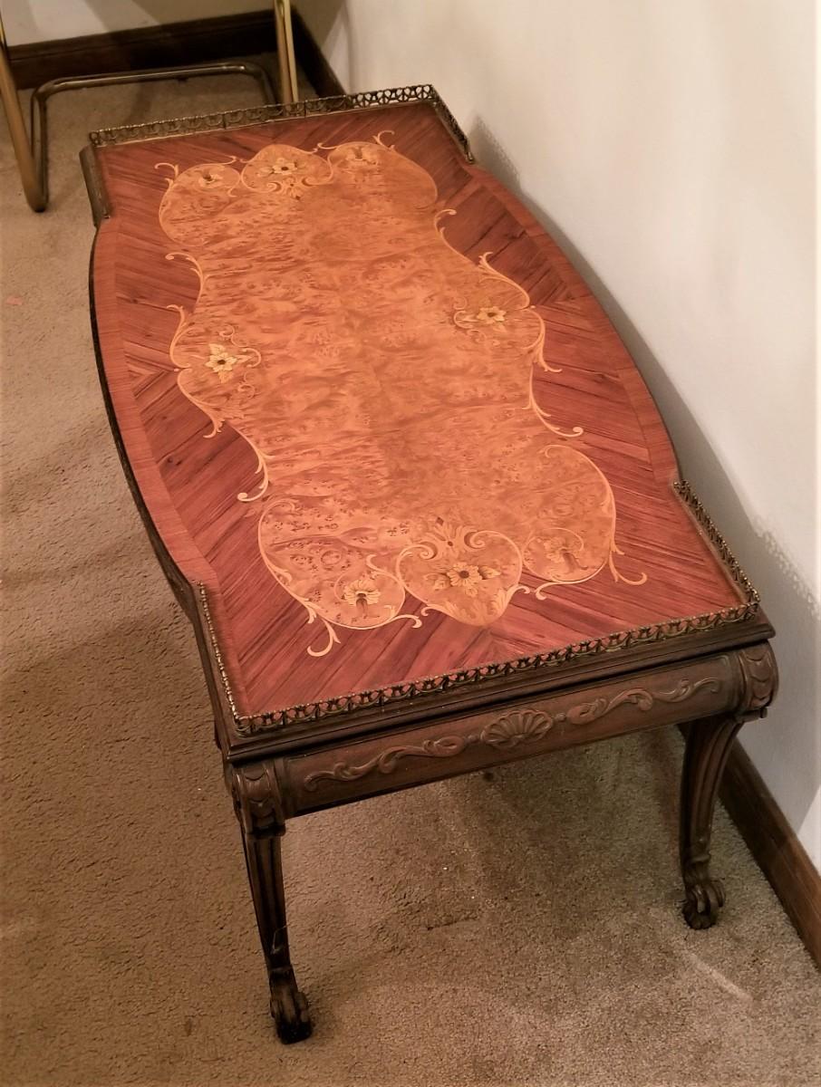 Vintage Italian Style Coffee Table - excellent vintage condition - has a metal gallery around the edges. Comes with a glass top that was custom-cut to fit the top and protect it. 40" x 20", 17.5" tall. This is a very attractive table (expensive when purchased) that would go with a variety of decors.