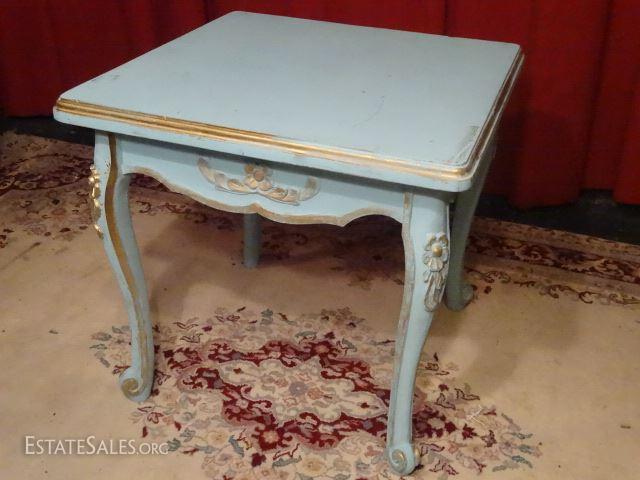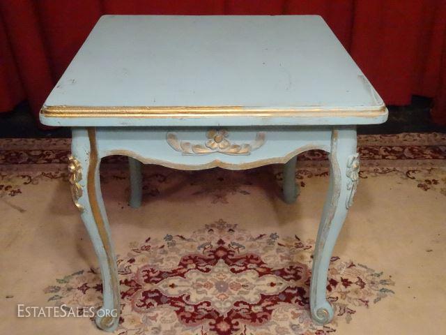 LOT 123A: LOUIS XV STYLE TABLE, SKY BLUE AND GOLD LIGHTLY DISTRESSED FINISH, VERY GOOD CONDITION, 26"W X 26"D X 25"H, SKU151.05