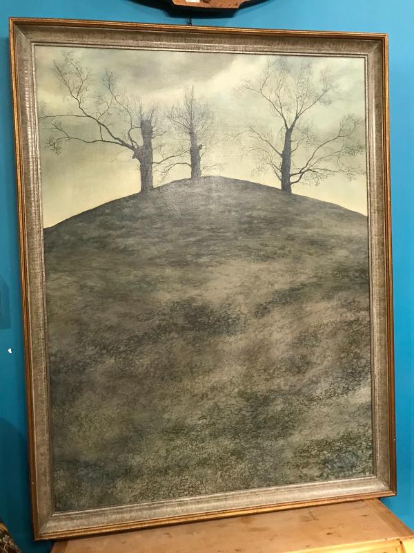 Beautifully executed original oil on cavas by artist Richard Caston of landscape of large hill with several old leafless trees. Entitled "Ell Hill" and dated 1974-1975 on back dust cover. Signed lower right. Framed in a muted gold/pewter tone frame. 39 1/2" x 51 1/2" H