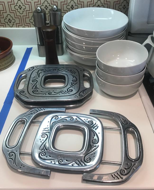 Set of 3 10 Strawberry Street bowls 5-3/4” diameter and 2-1/2” deep, Set of 7 Pier 1 Imports soup bowls 9” diameter and 2-1/2” deep (2 are chipped), Pair of Cole & Mason Pepper Mills, One wood pepper mill, 3 Lenox Metal trivets, one expand for casserole dish or long baking pan