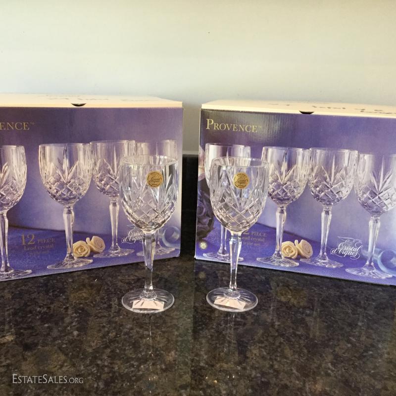 Two 12-piece crystal wine glass sets by Provence Crystal d'Arques. Total of 24 glasses. Both sets are like-new in boxes. Get ready for the holidays! See photos. Shipping available or local pick up in Flat Rock, NC.