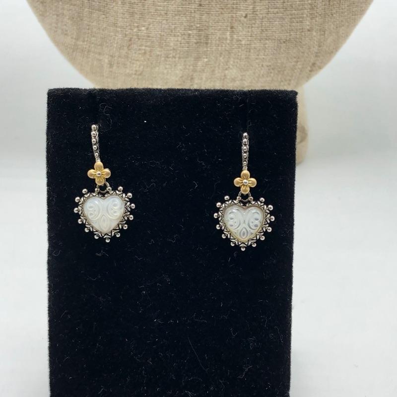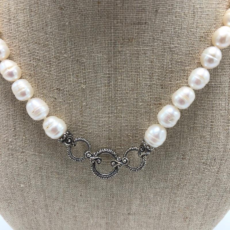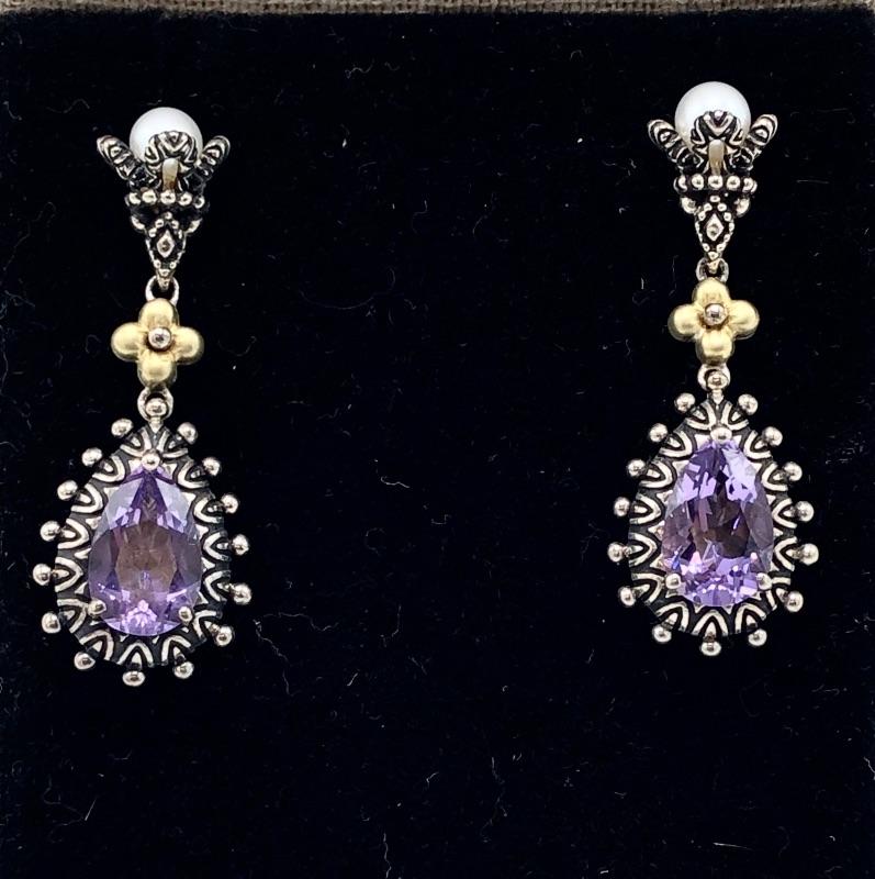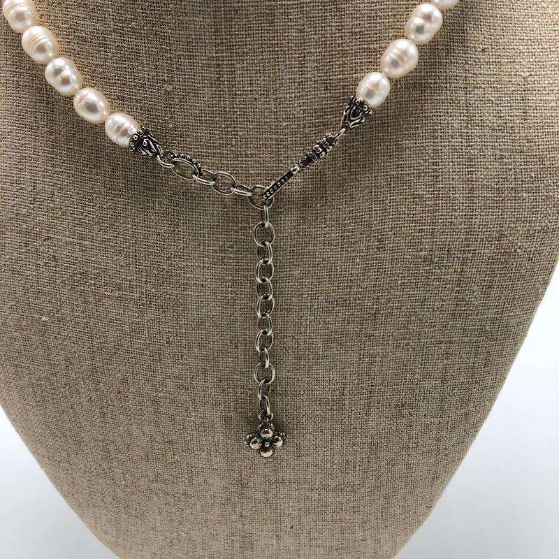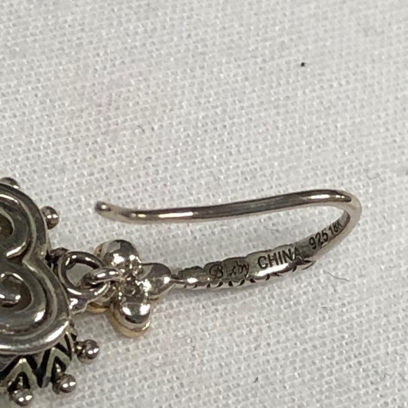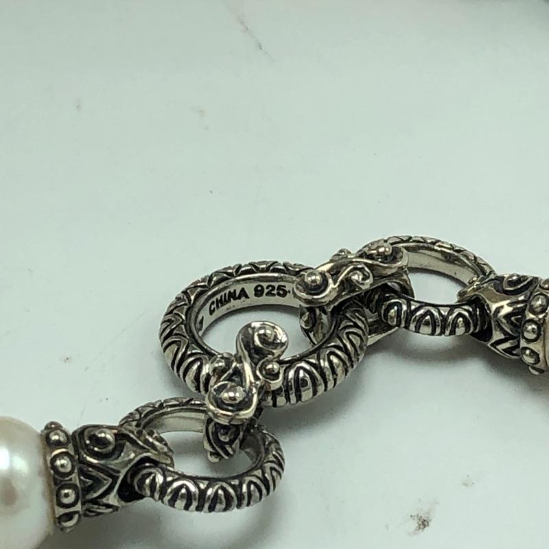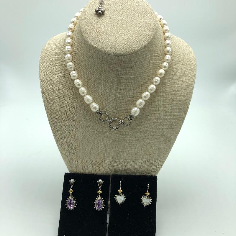 Elegant Bixby 925 necklace with pearl like beads and silver clasps. Lot also includes heart shaped earrings with French wire marked 925 18k China and post earrings with purple colored stone marked 925. Set is perfect for mix and match.