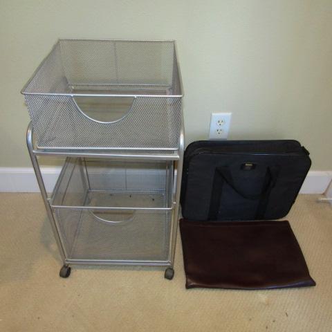 LOT 124 TWO TIER WIRE BASKET ROLLING CART & 2 OFFICE BAGS