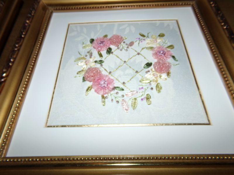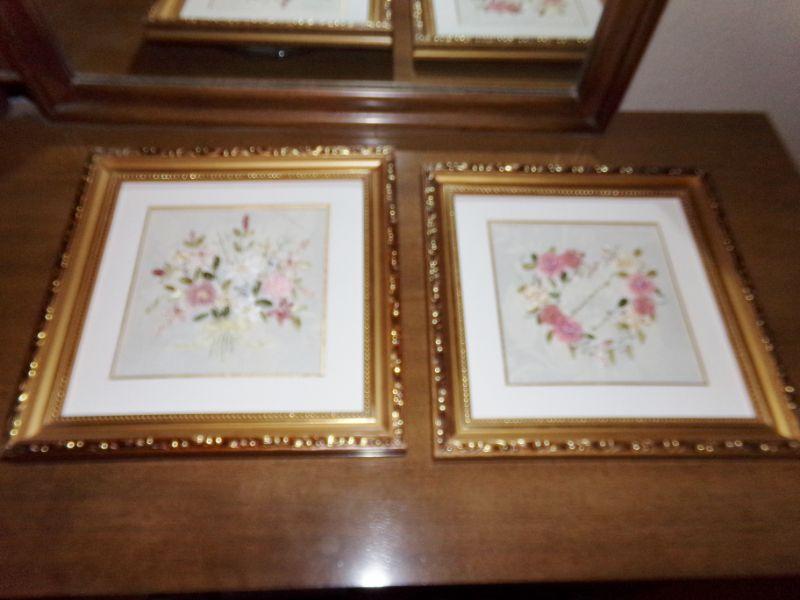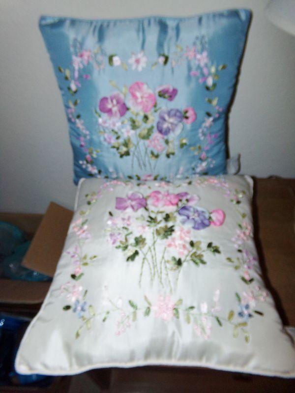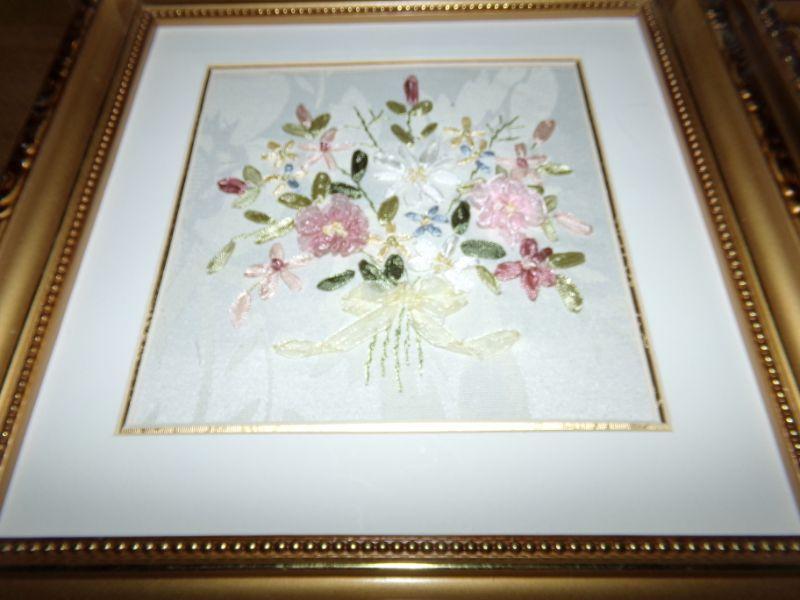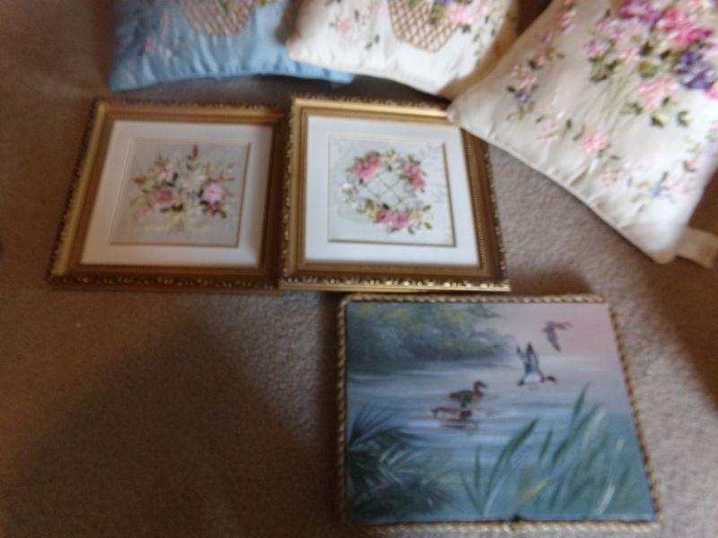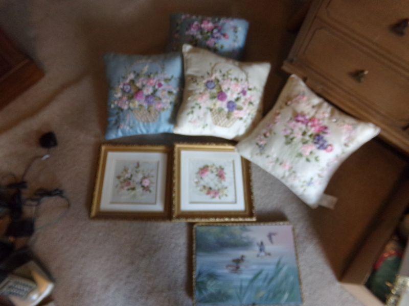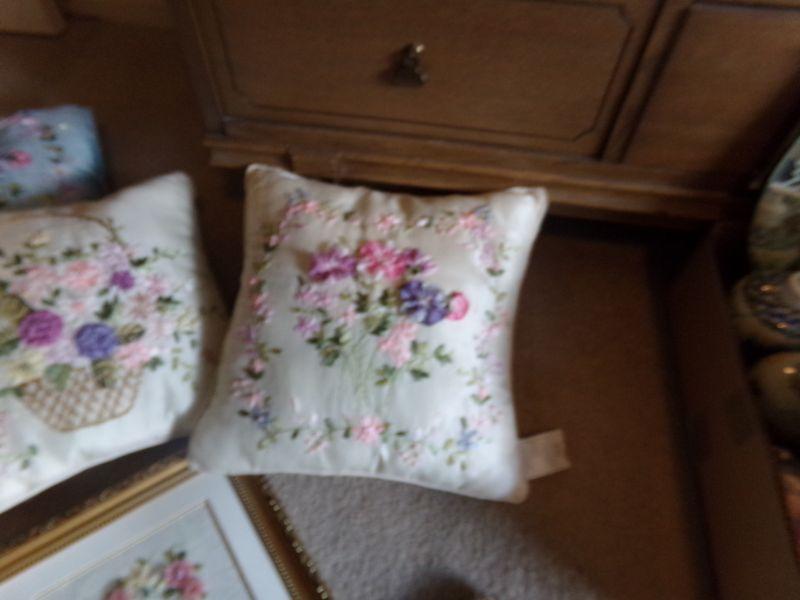 LOT 124 RIBBON FLOWERED PILLOWS AND PICTURES