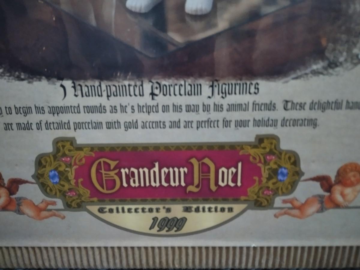 CHRISTMAS IN GOLD THIS YEAR! GRANDEUR NOEL COLLECTORS EDITION 1999 SANTA, POLAR BEAR AND DEER WHITE AND GOLD HAND PAINTED PORCELAIN FIGURNINES, SMALL FAUX PRE- LIT WHITE LIGHTED CHRISTMAS TREE, ORNAMENTS, GOLD COLORED BEADS, BULBS, CENTERPIECE, AND MORE! CHRISTMAS IS LESS THAN 110 DAYS AWAY!