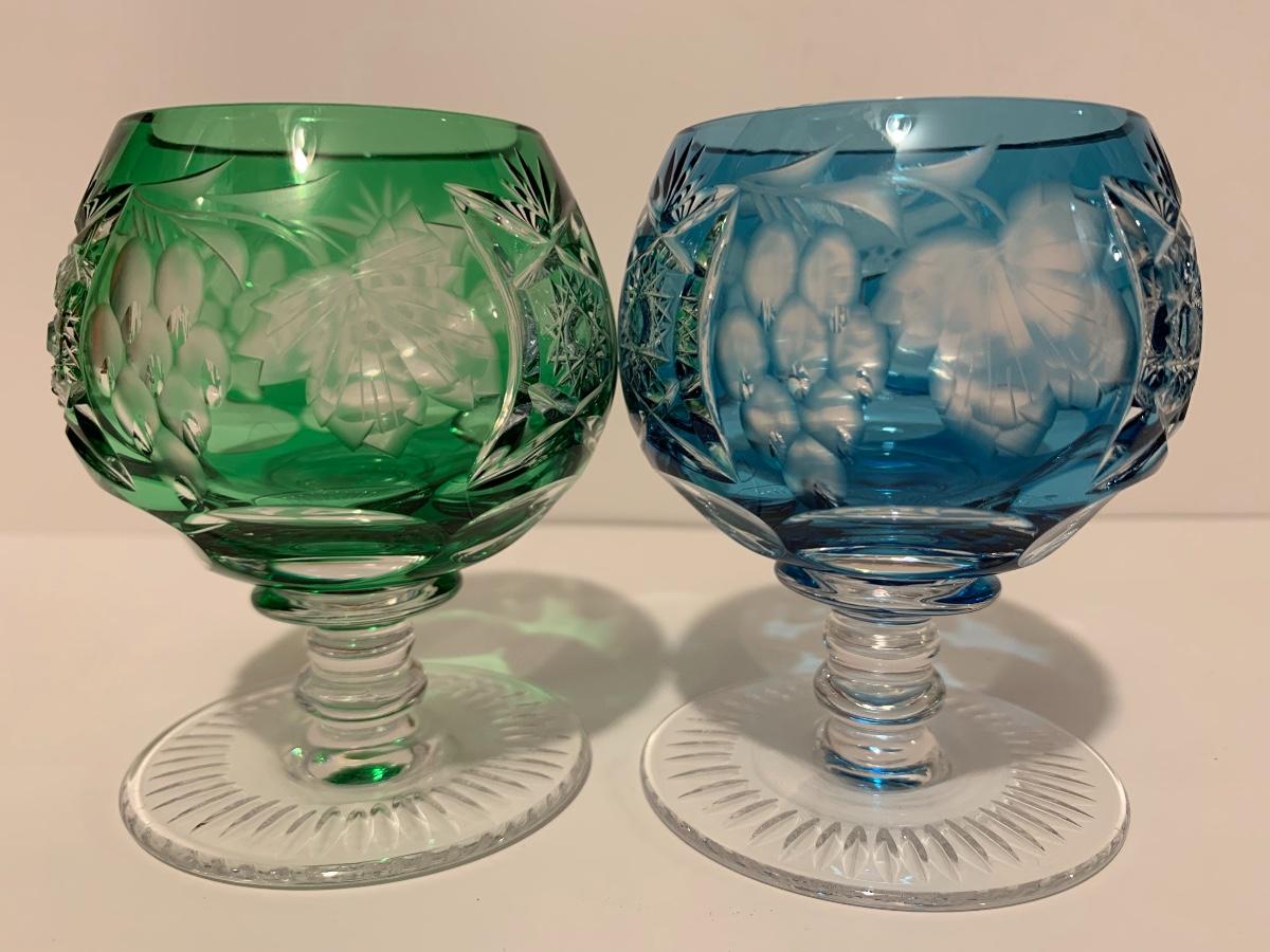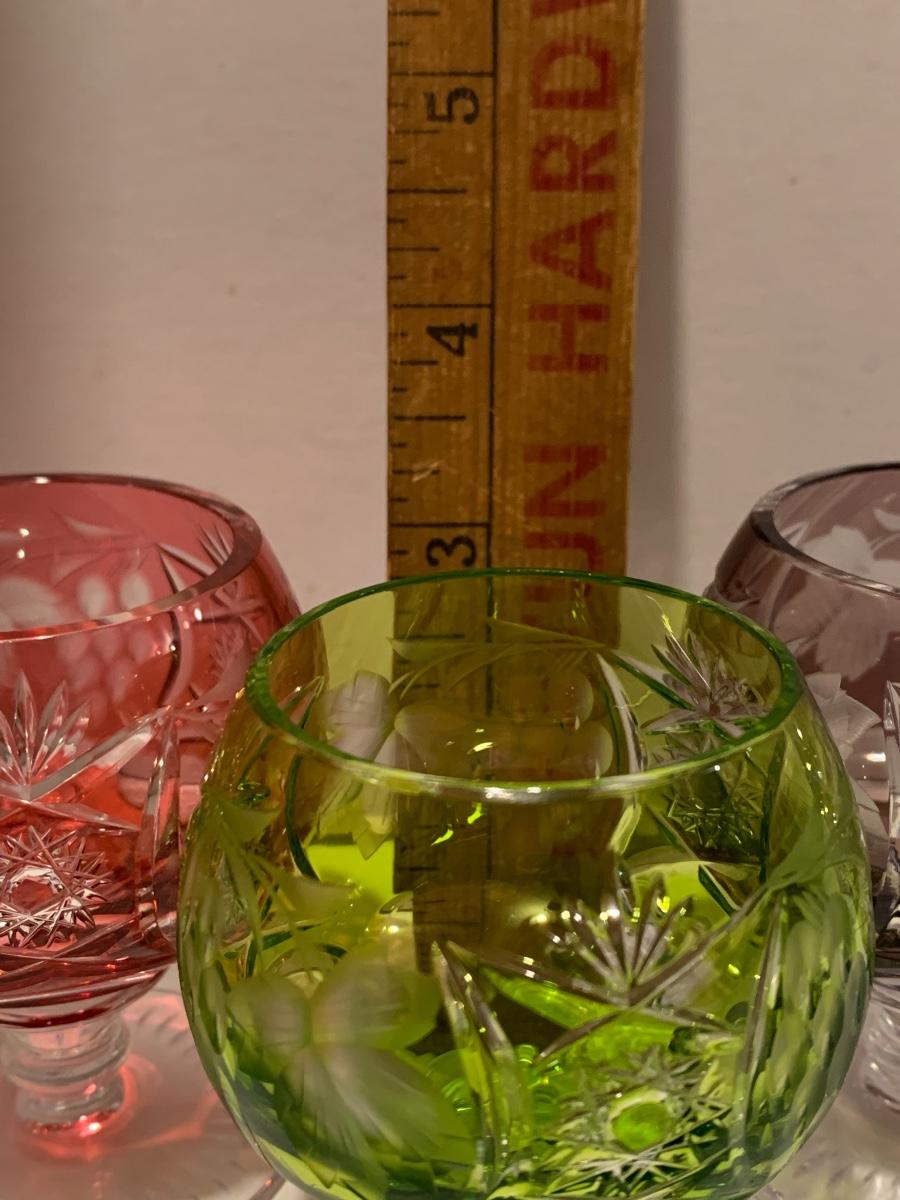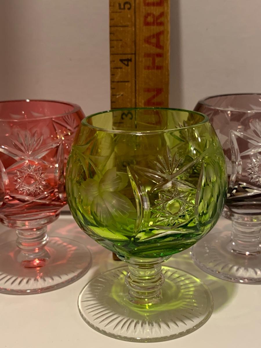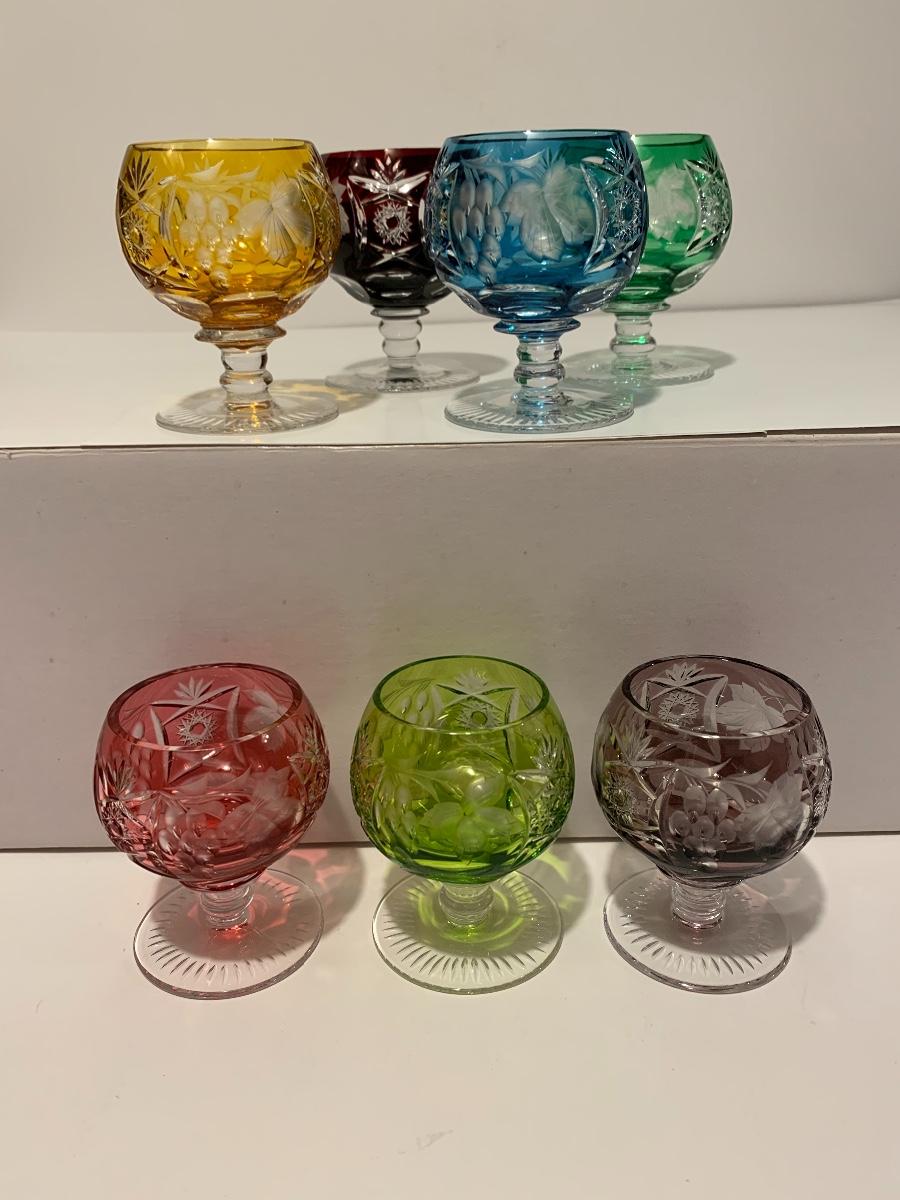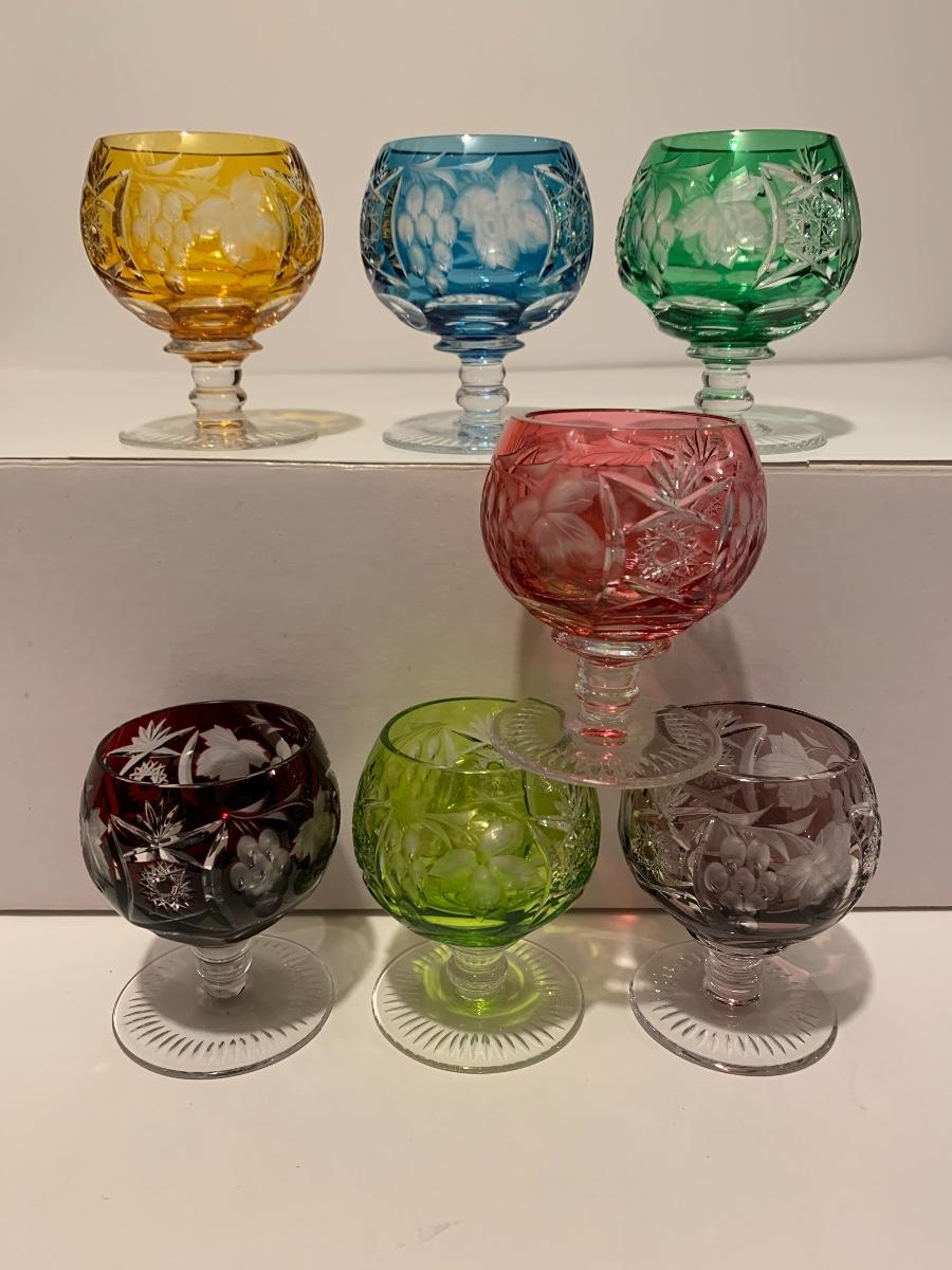 Great set of 7 multicolored cut to glassware from Germany. Pretty grape and leaves pattern with a crystal-clear base. Just stunning. They have had minimal use if any. The crystal is nice and clear without any residue.