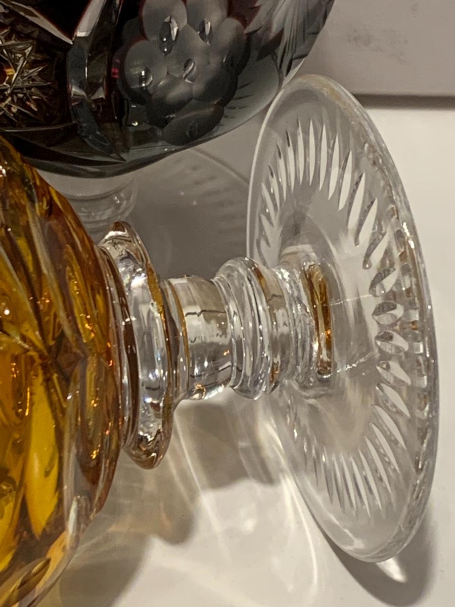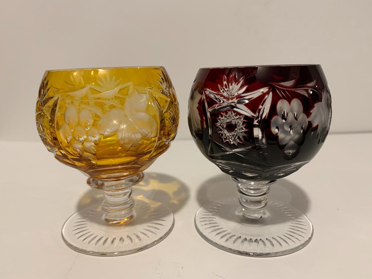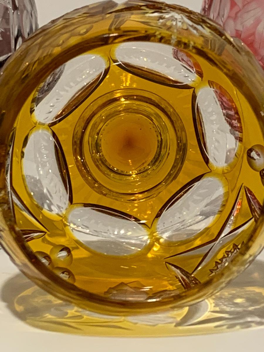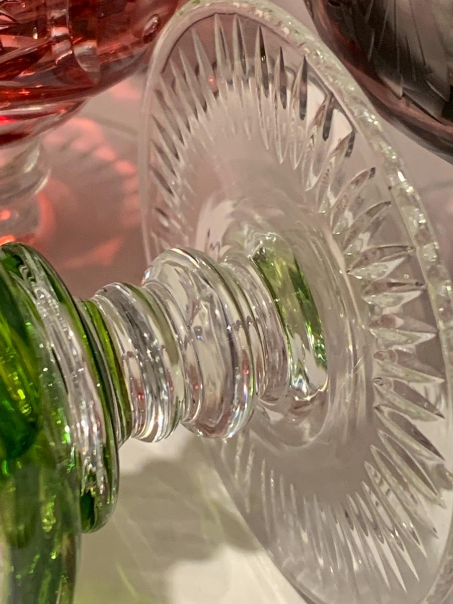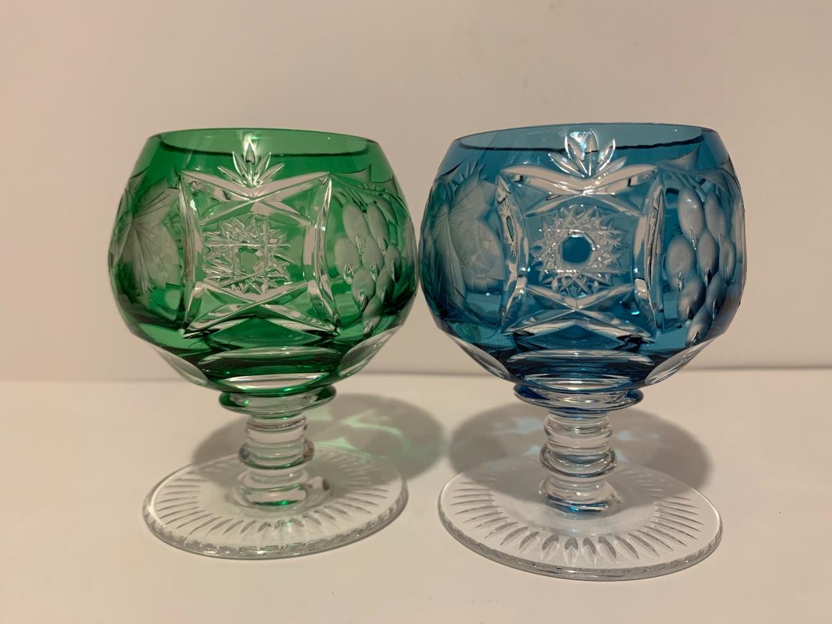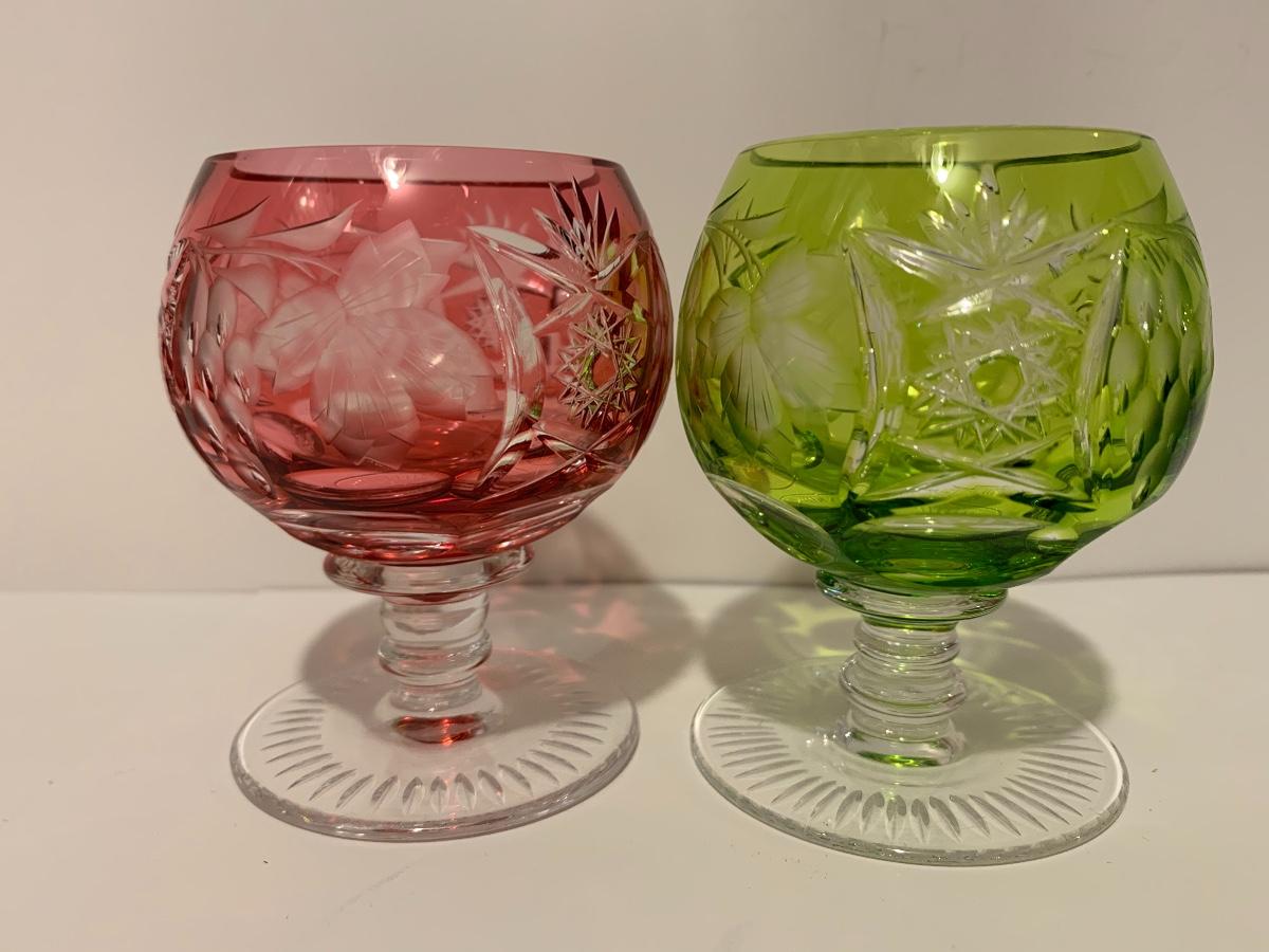 Great set of 7 multicolored cut to glassware from Germany. Pretty grape and leaves pattern with a crystal-clear base. Just stunning. They have had minimal use if any. The crystal is nice and clear without any residue.