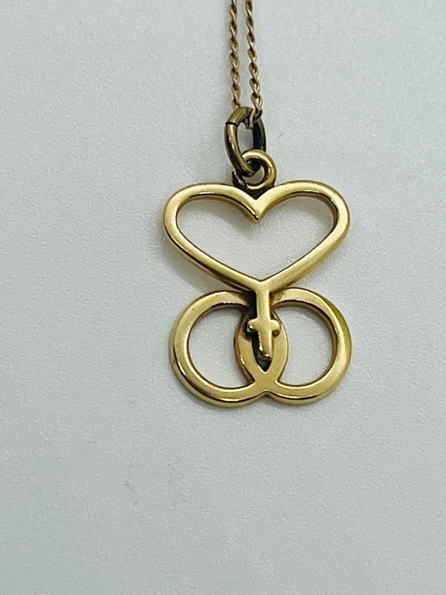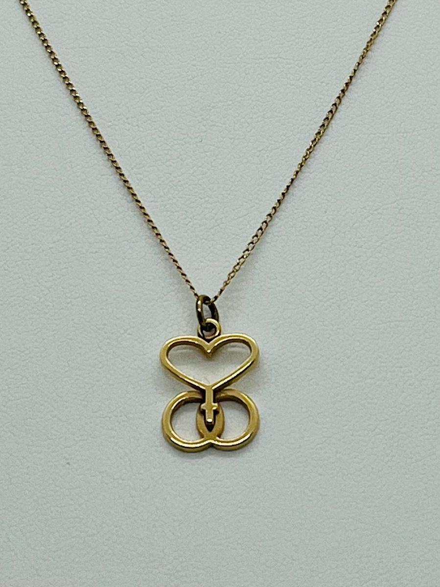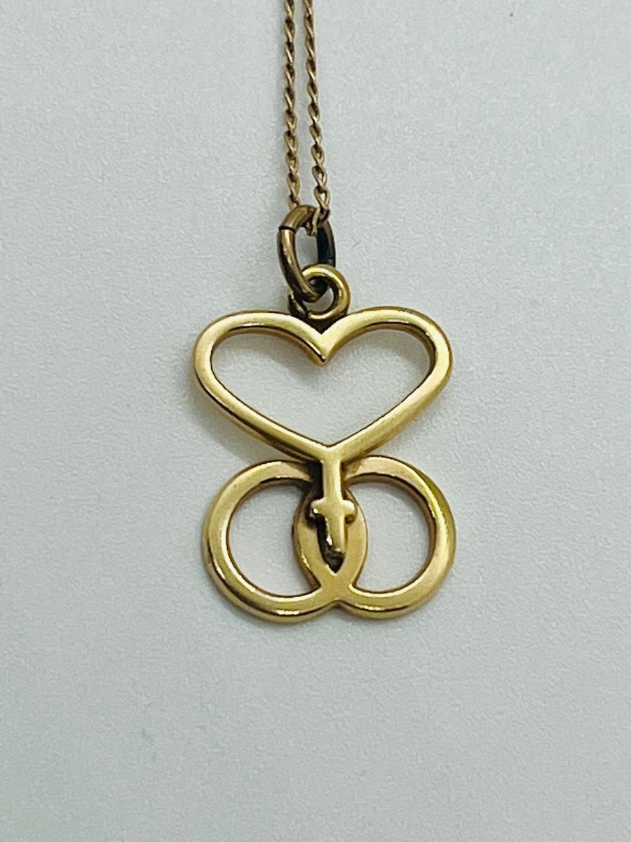 14k yellow gold Love, faith and unity pendant necklace. The cross symbol has always been known to be a symbol of God's love for his children. ... Hearts, on the other hand, signifies deep affection, love, and passion. This may be for a family member, a friend, a special someone, and God. The two rings represent the unity of matrimony. The pictures show condition, measurements if taken, and what is included in the lot. Due to the large amount that we photograph and the time frame, we are not always able to take measurements. All items unless noted, are pre-owned and have been used, and are untested. Thank you