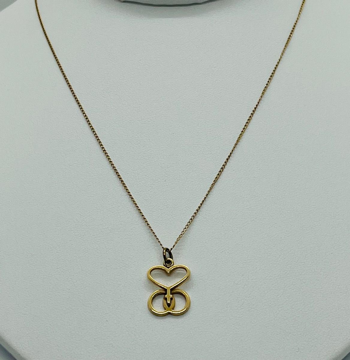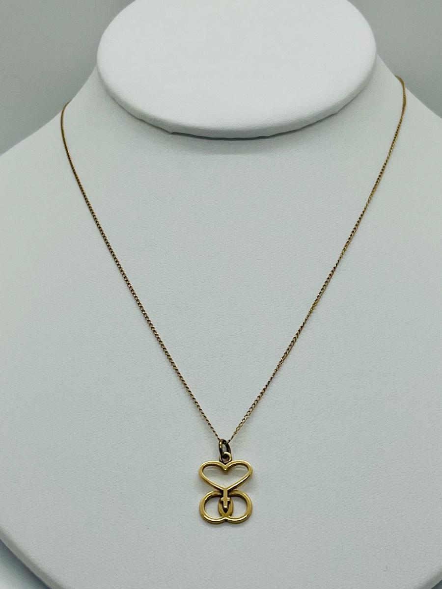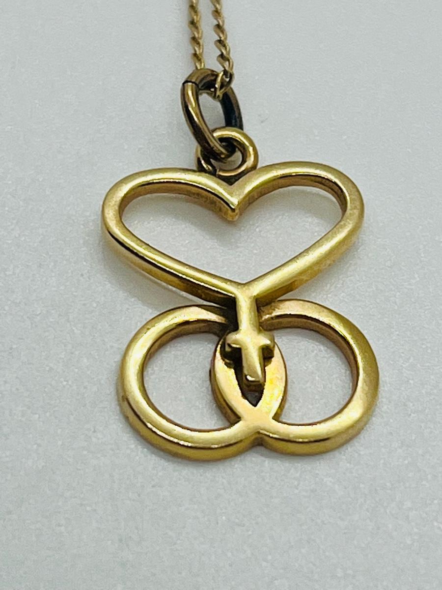 14k yellow gold Love, faith and unity pendant necklace. The cross symbol has always been known to be a symbol of God's love for his children. ... Hearts, on the other hand, signifies deep affection, love, and passion. This may be for a family member, a friend, a special someone, and God. The two rings represent the unity of matrimony. The pictures show condition, measurements if taken, and what is included in the lot. Due to the large amount that we photograph and the time frame, we are not always able to take measurements. All items unless noted, are pre-owned and have been used, and are untested. Thank you