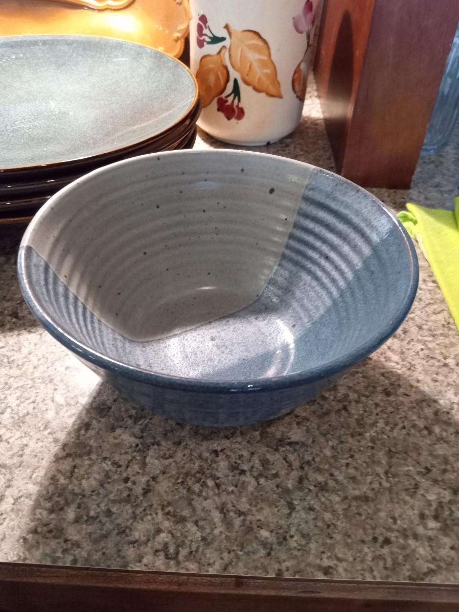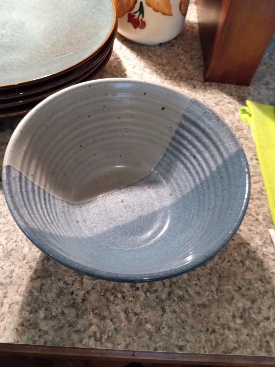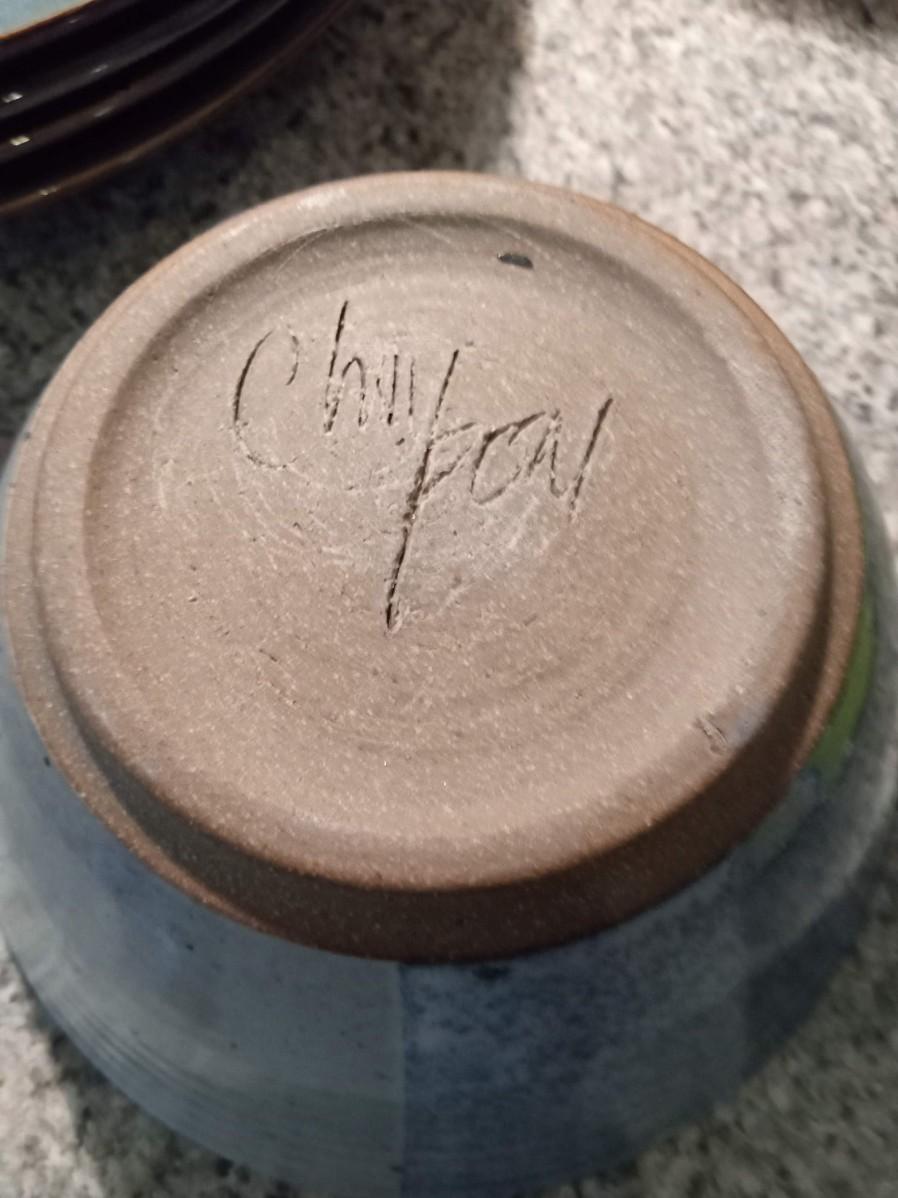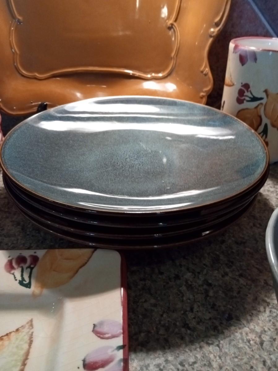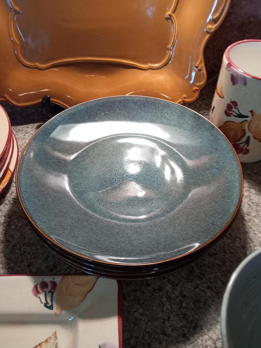 4 OLIVE GREEN DINNER PLATES, 1 SIGNED CLAY BOWL