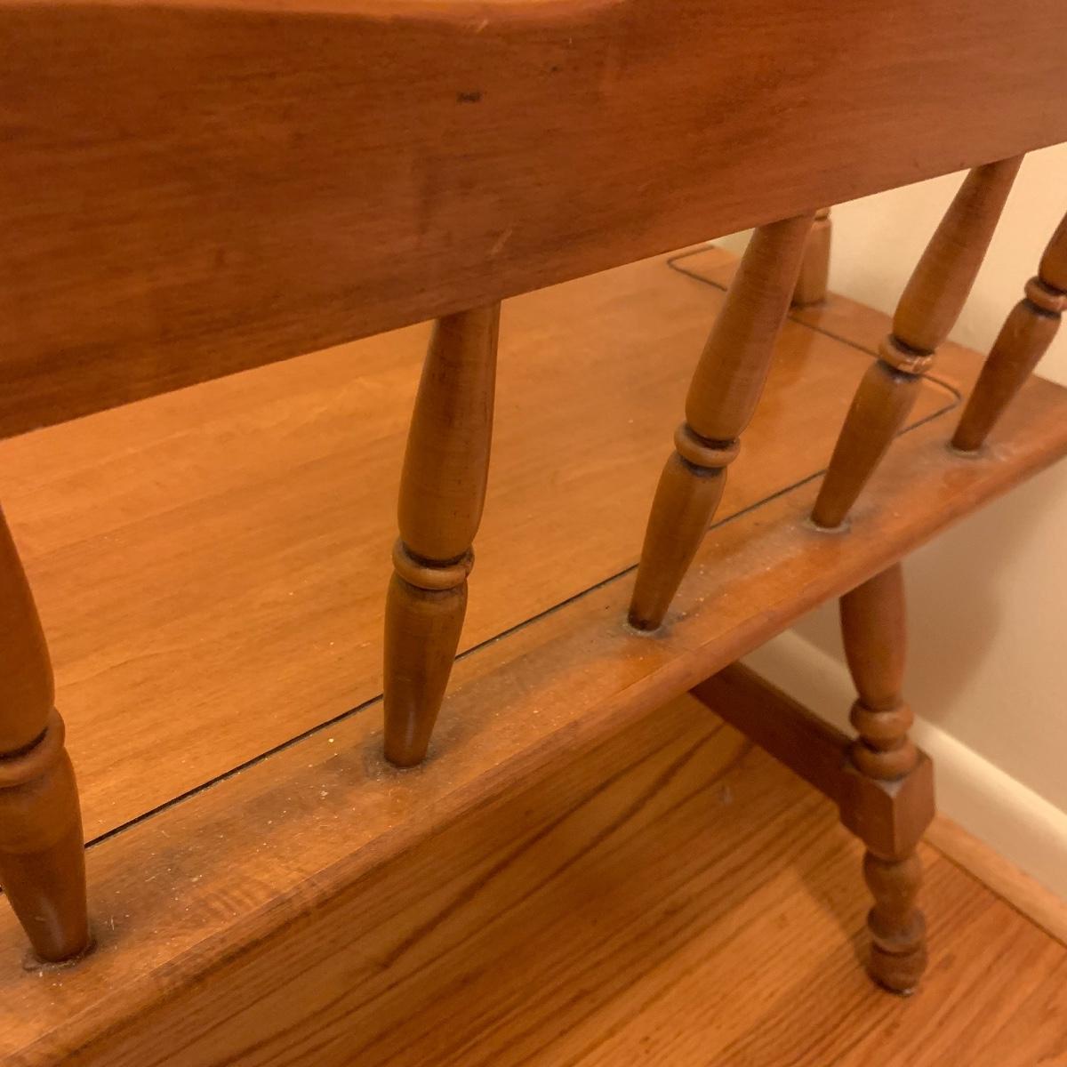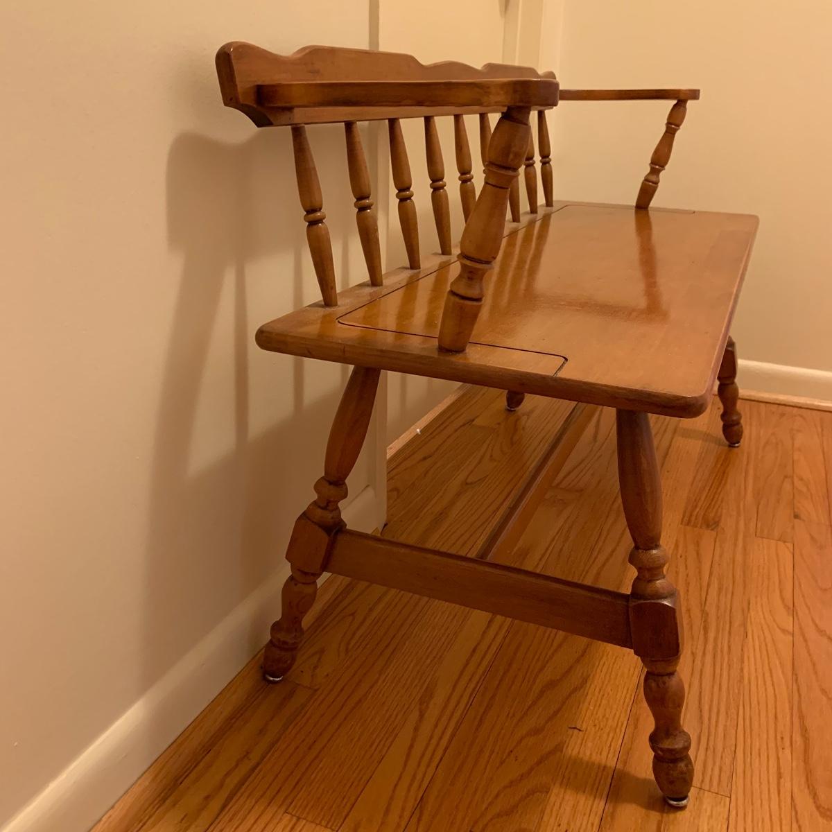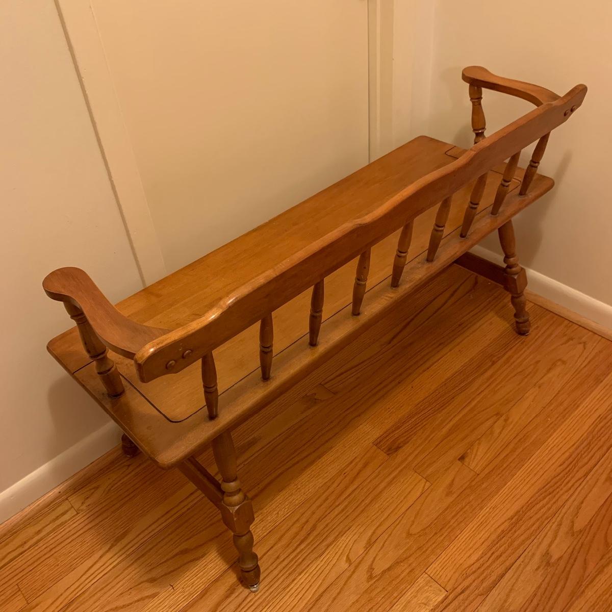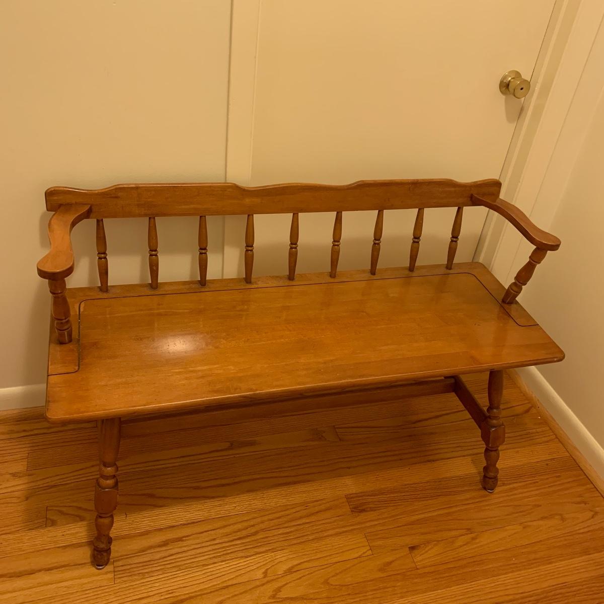 This is a nice wooden bench with a back and armrests. It is a nice tan color. The bench measures 46” x 16.5” x 27.75”. The seat height is 18”. Minor wear shown, but piece is in great shape. Local pickup only.