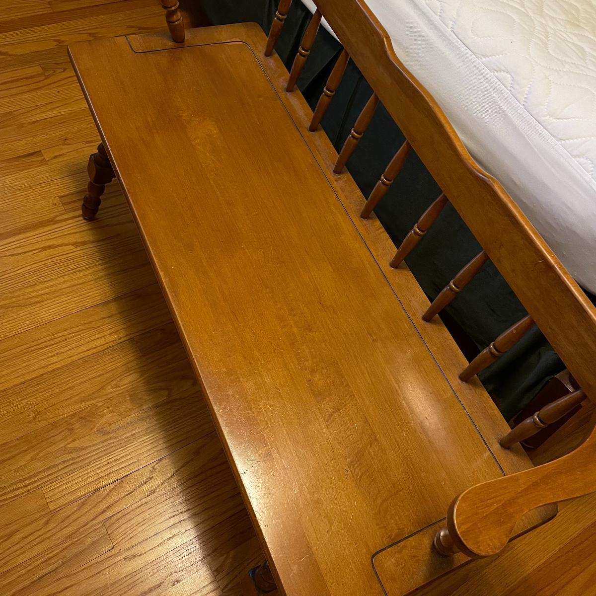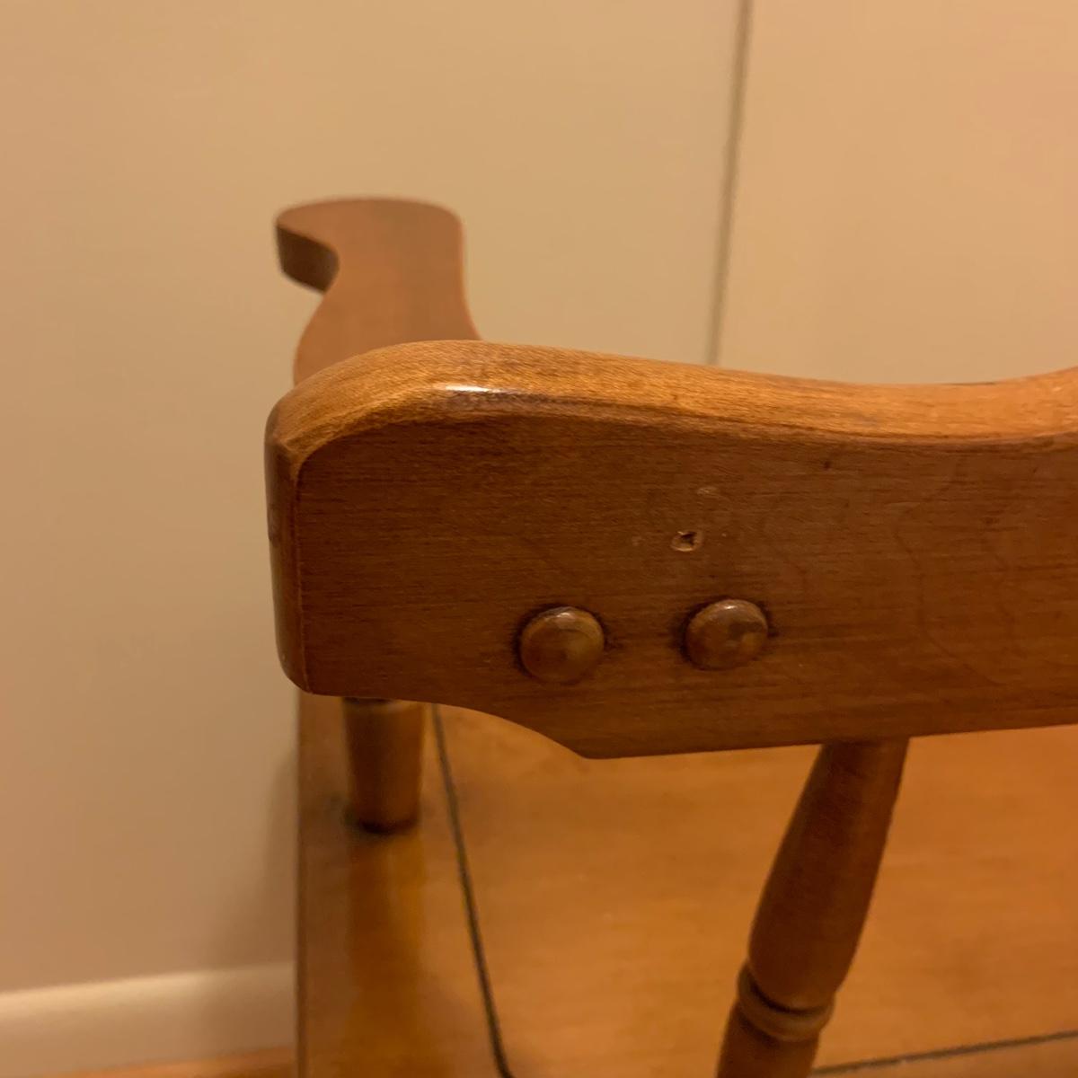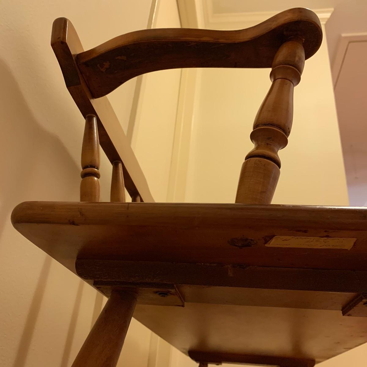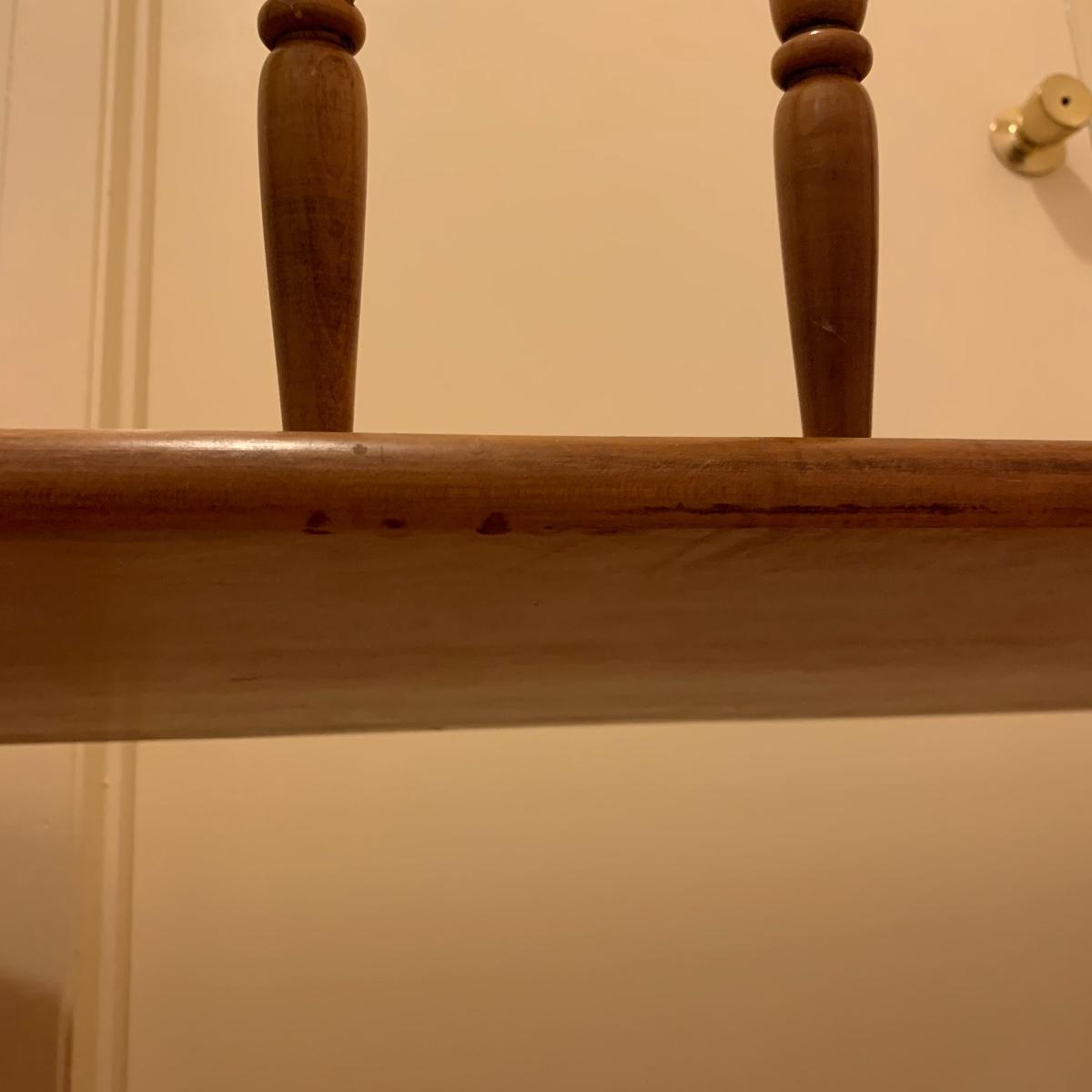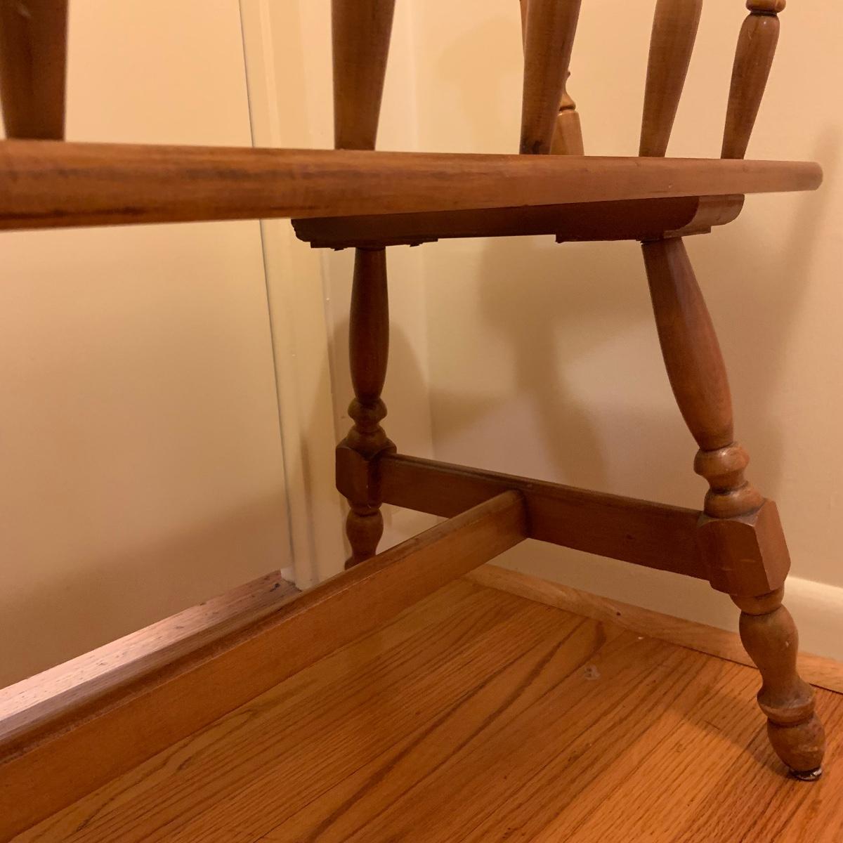 This is a nice wooden bench with a back and armrests. It is a nice tan color. The bench measures 46” x 16.5” x 27.75”. The seat height is 18”. Minor wear shown, but piece is in great shape. Local pickup only.