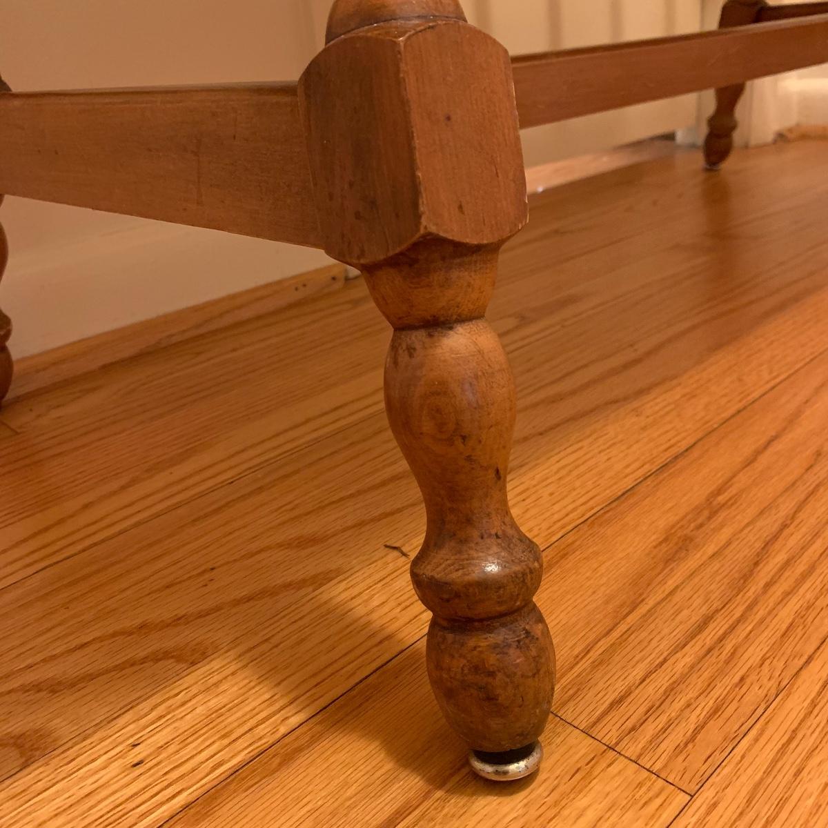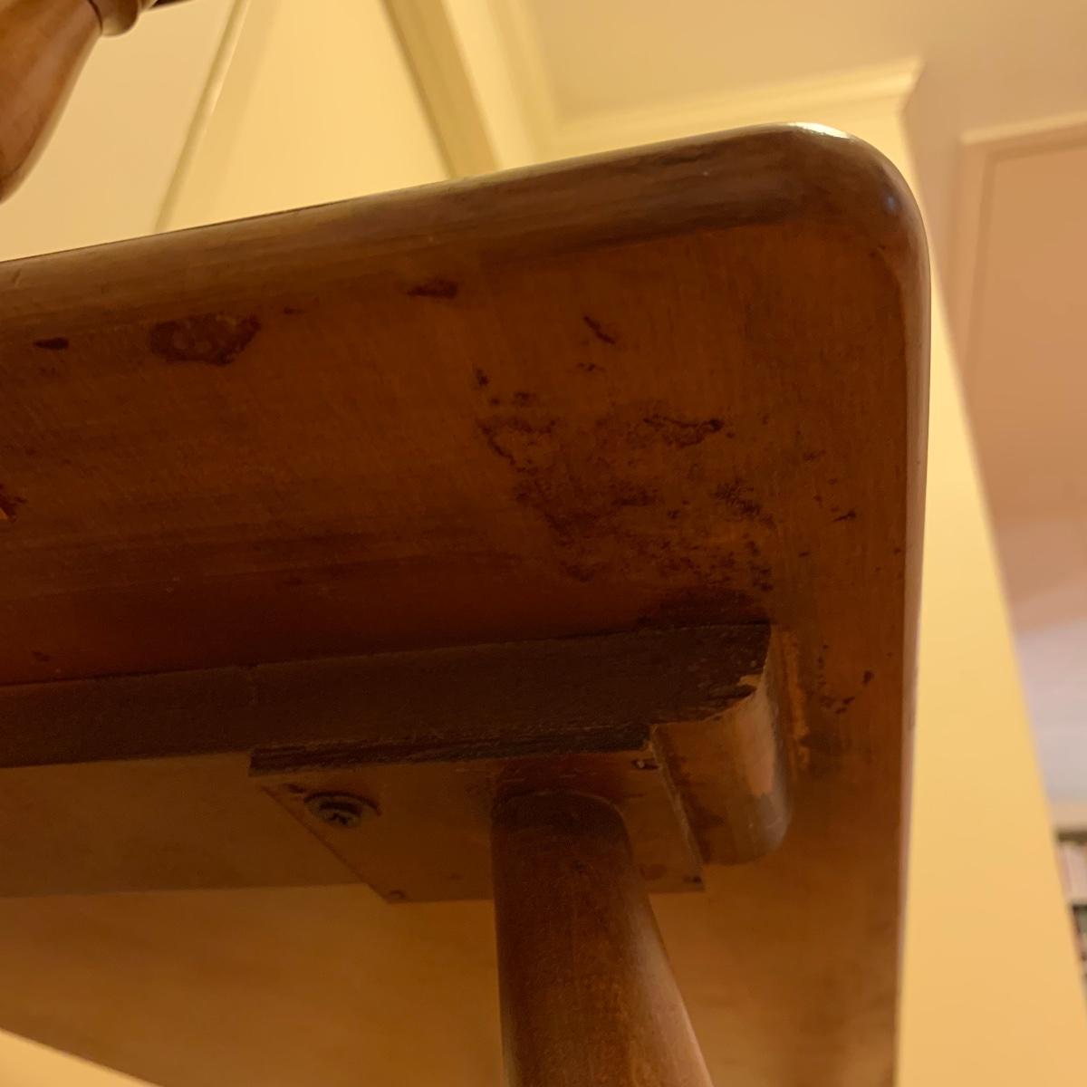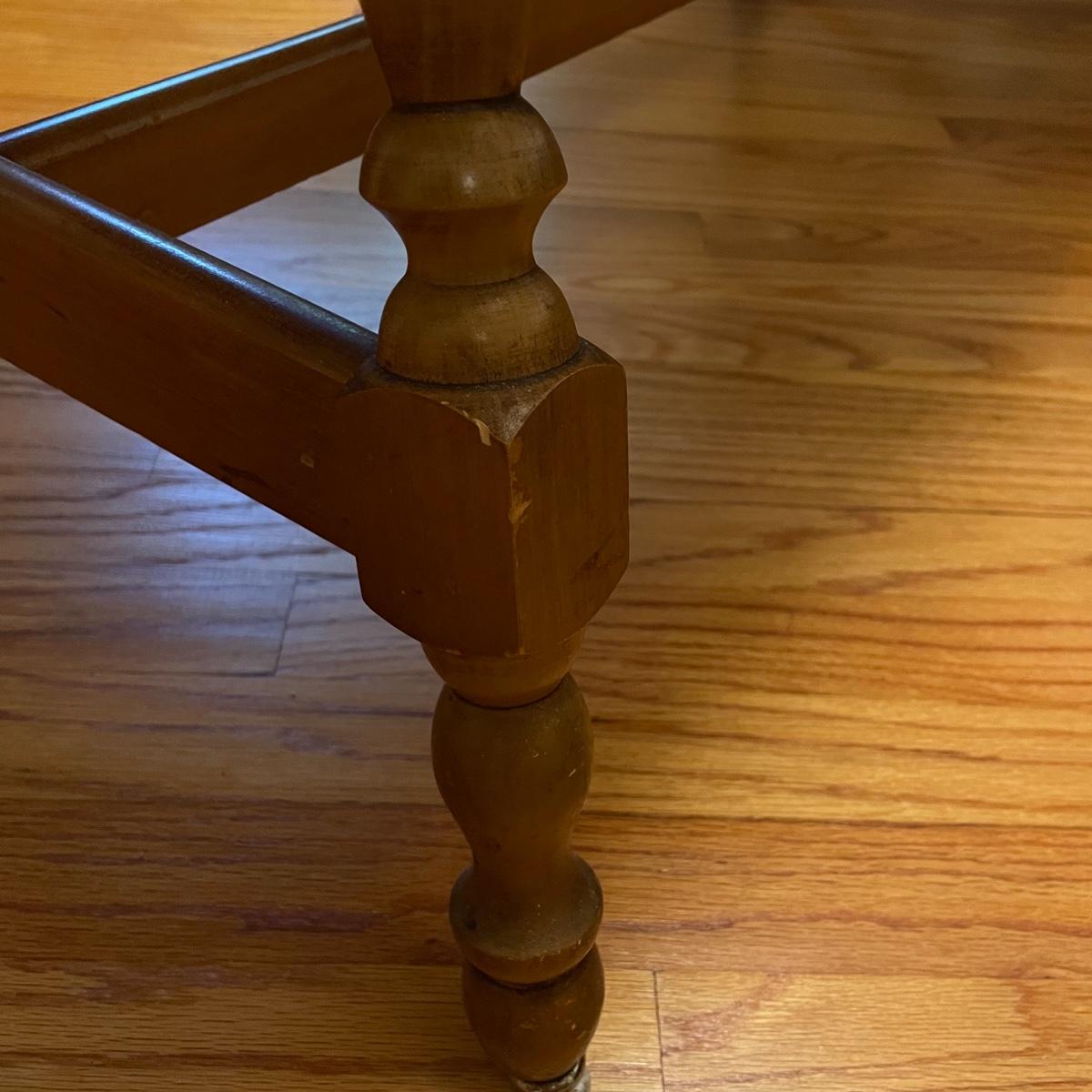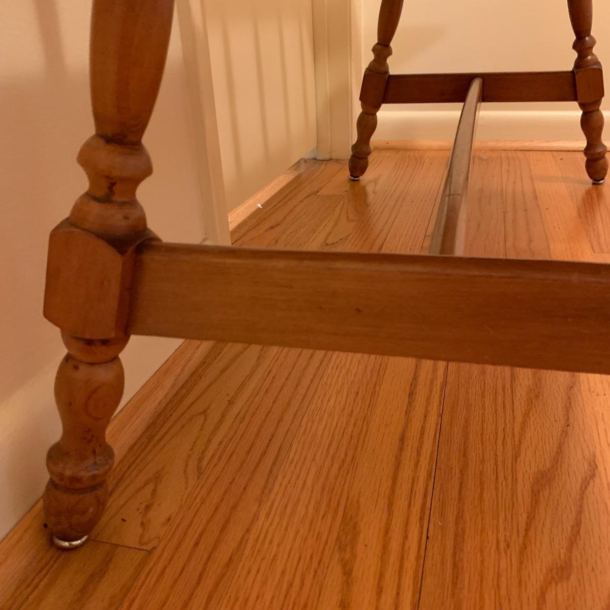 This is a nice wooden bench with a back and armrests. It is a nice tan color. The bench measures 46” x 16.5” x 27.75”. The seat height is 18”. Minor wear shown, but piece is in great shape. Local pickup only.