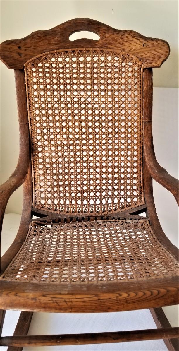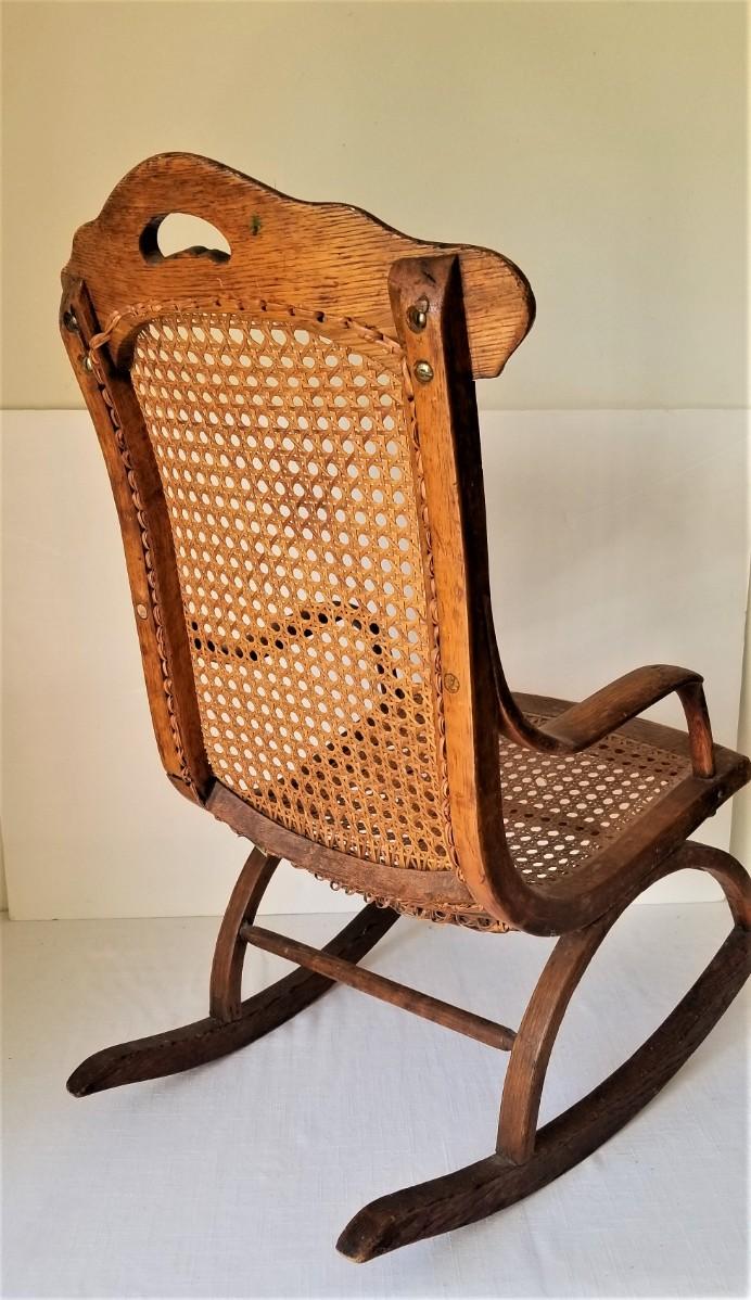 This sweet antique child's oak rocker dates to around 1900, perhaps a bit earlier. Woven cane seat and back in good condition. Perfect for dolls or bears. 26" tall, 20" deep, 14" across. Good antique condition.