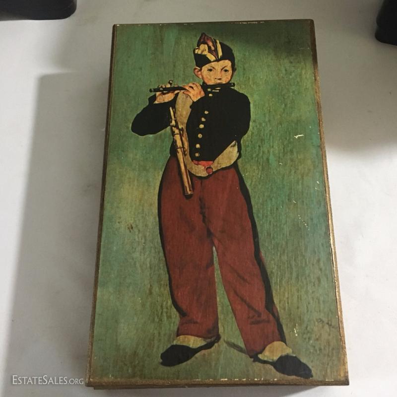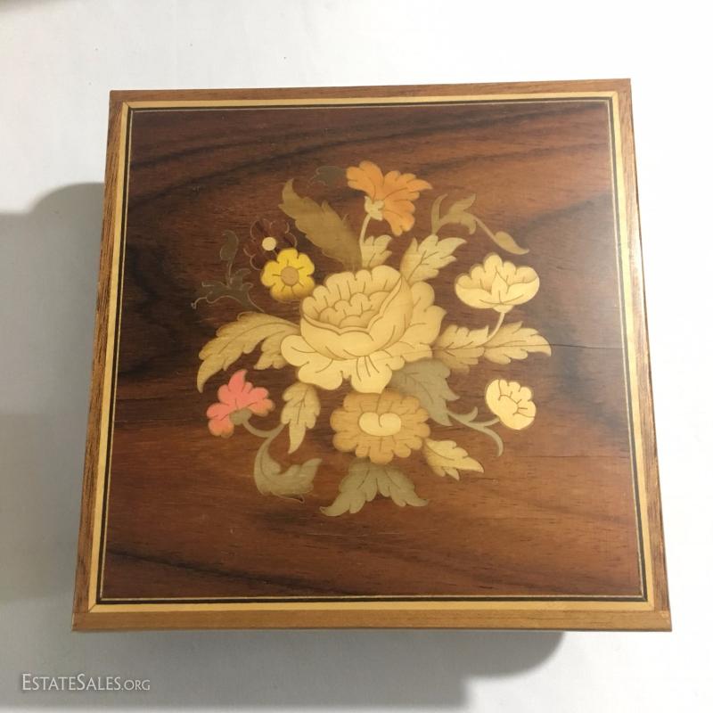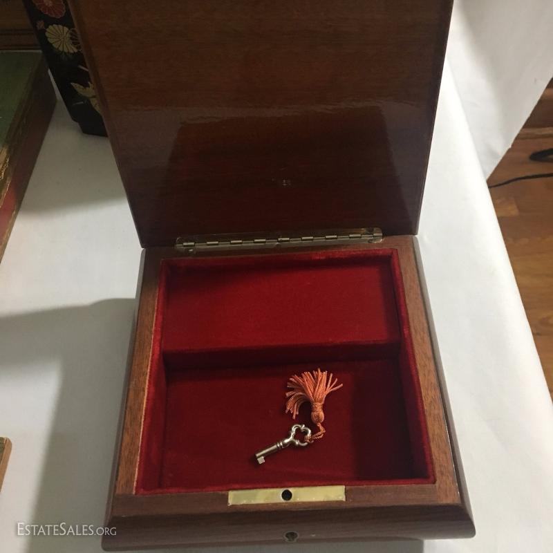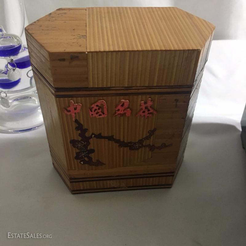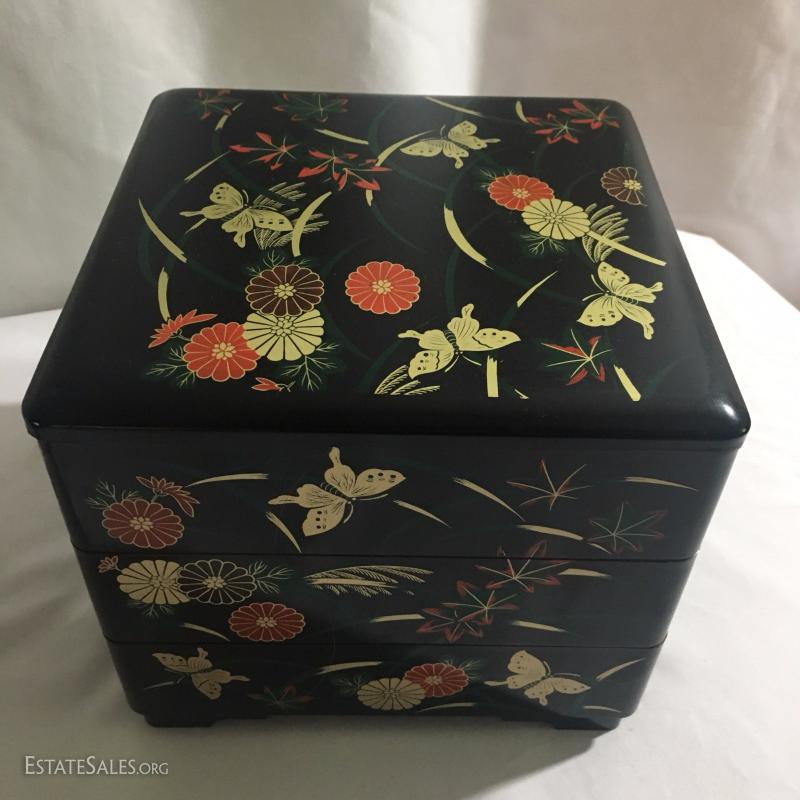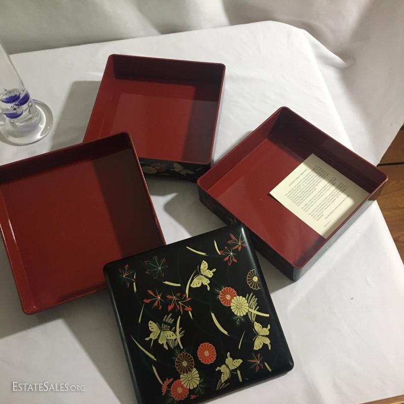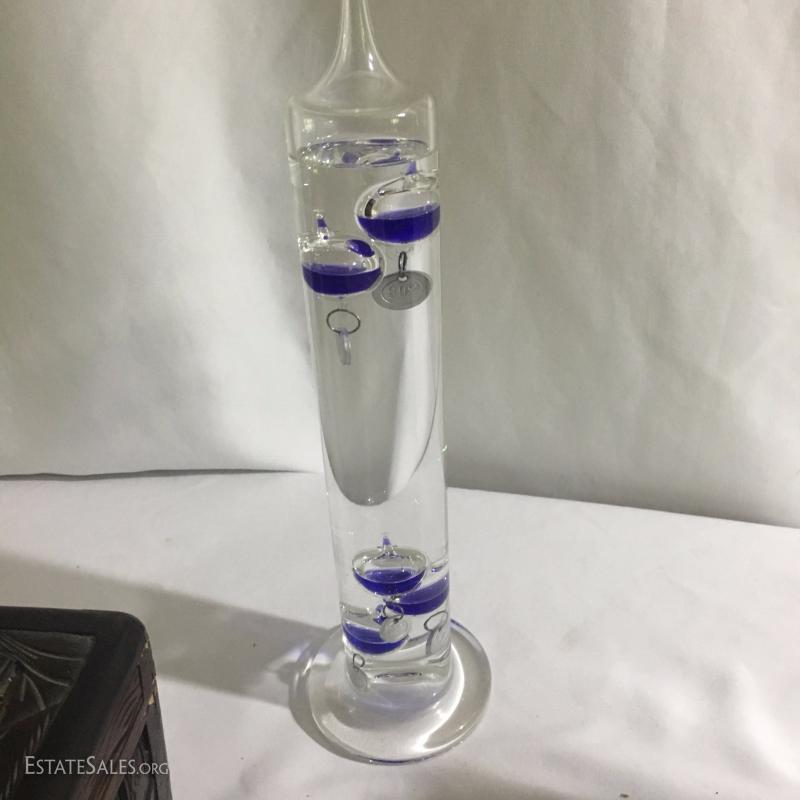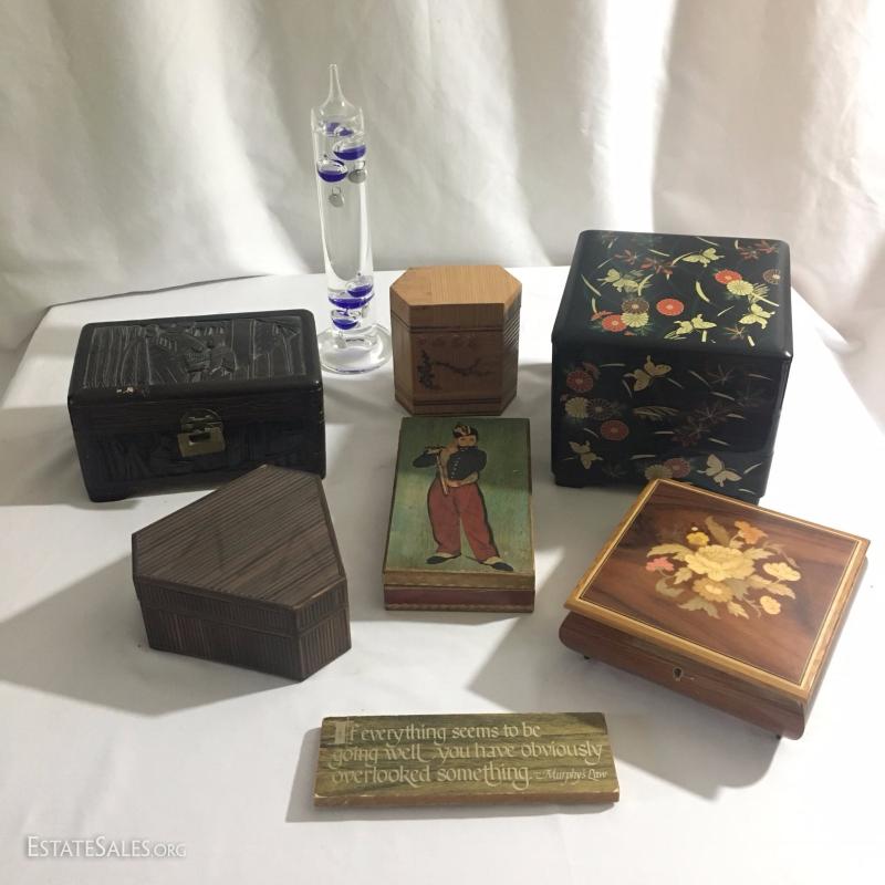 Collectible boxes and Galileo thermometer. Largest is black Japanese three tiered box and it's 7.5" square top and 7"high