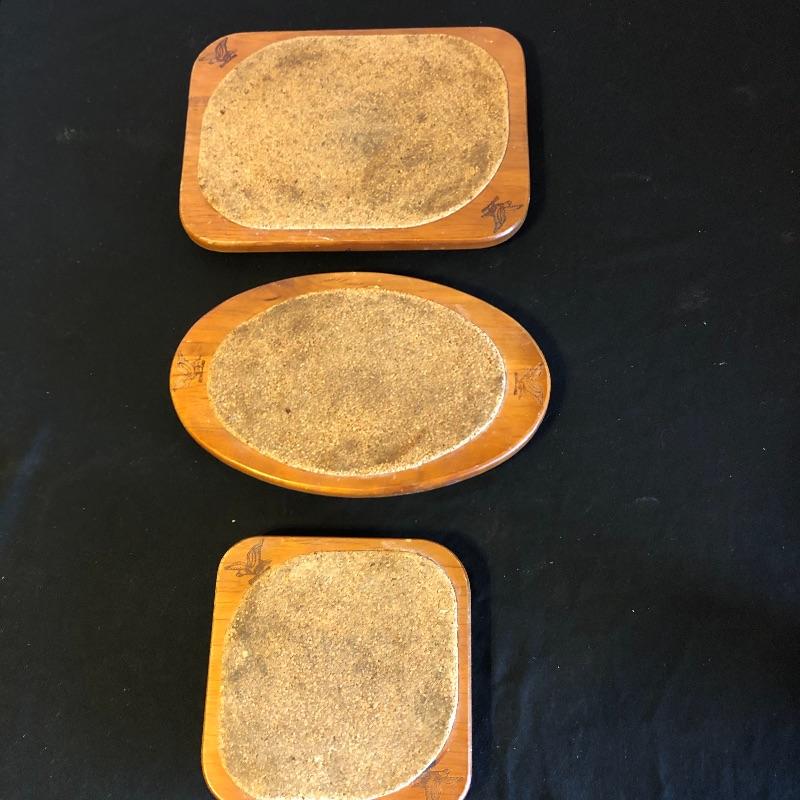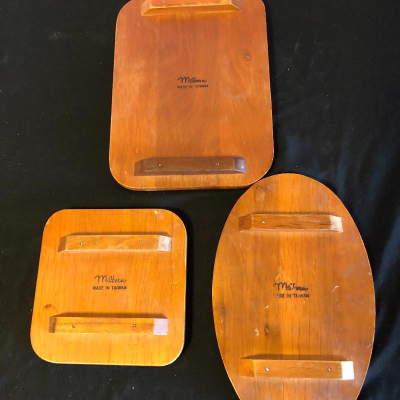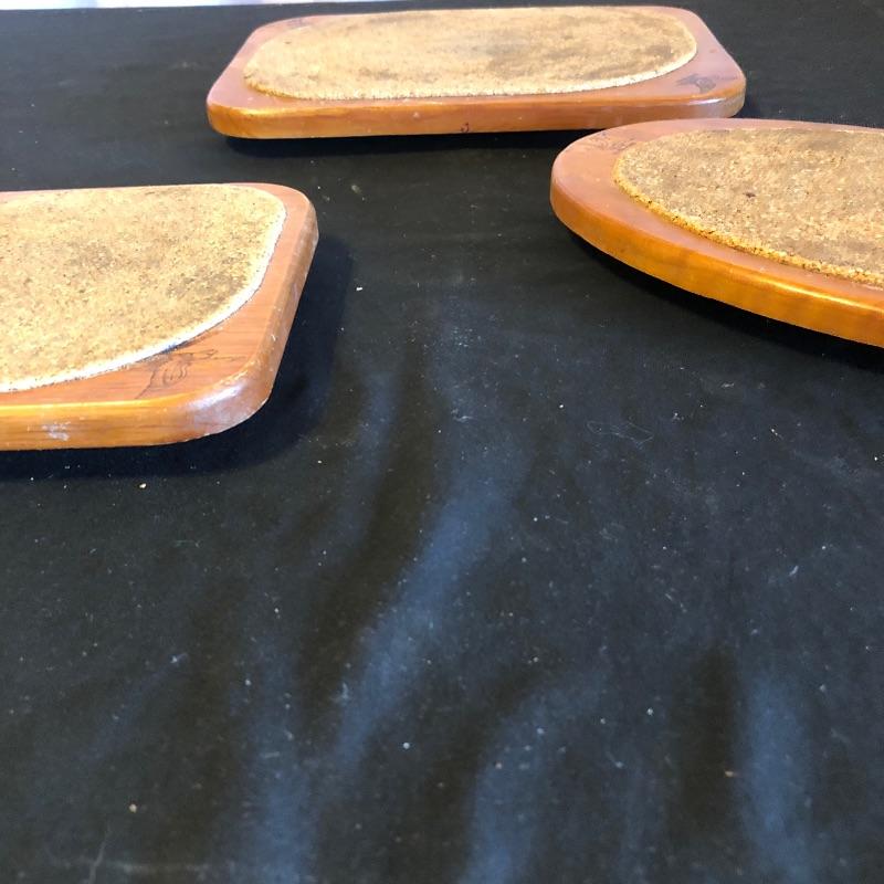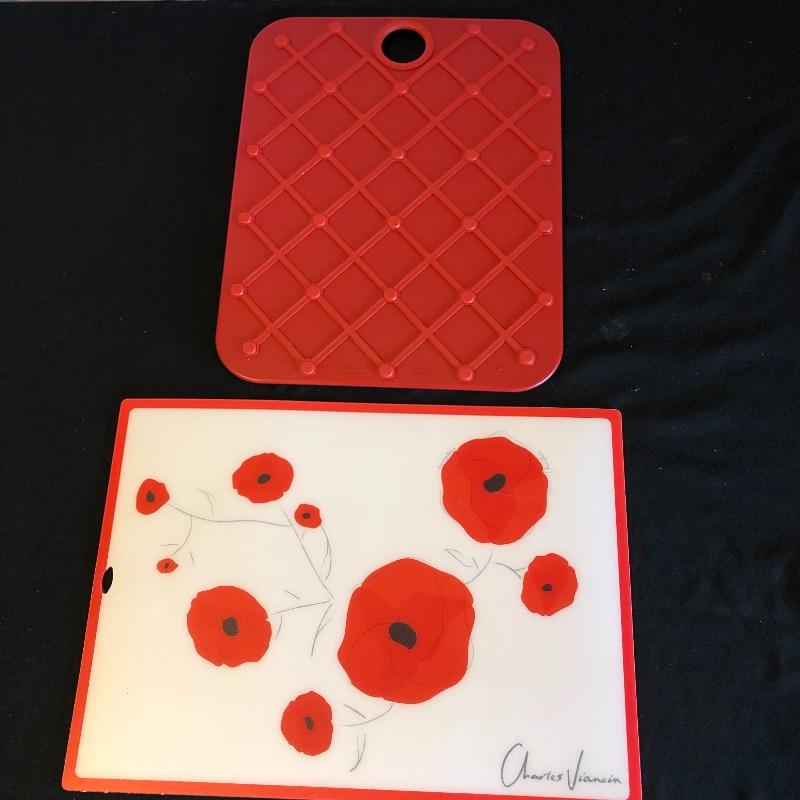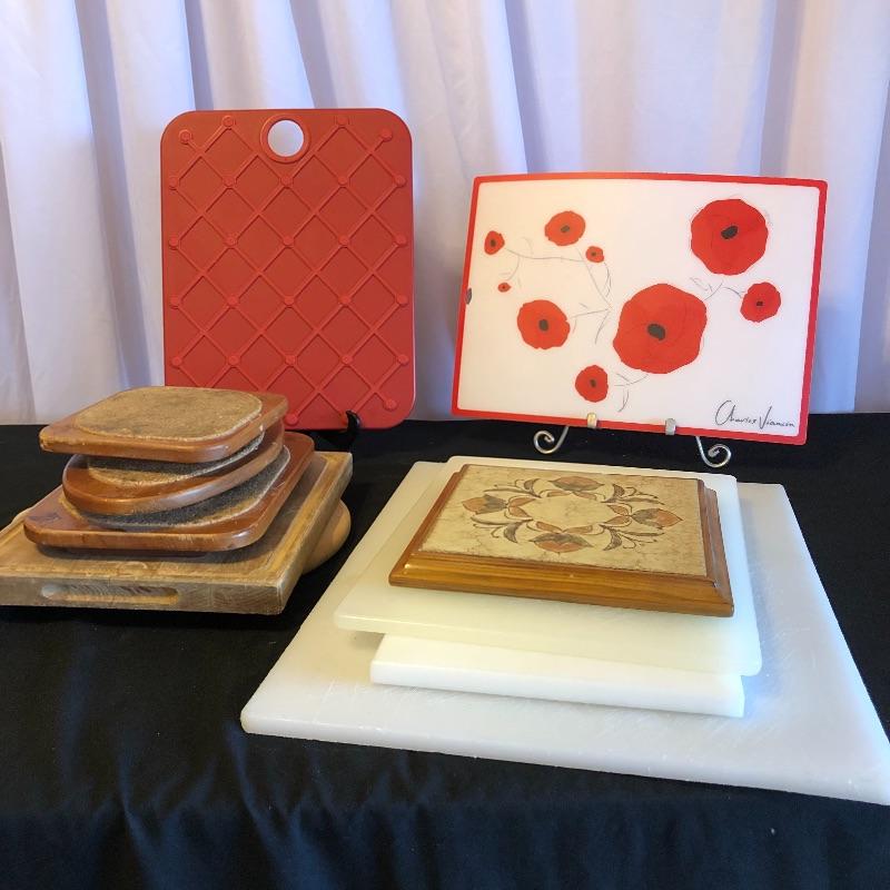 Never have to wash another cutting board as there are plenty in this lot to cut meat and vegetables simultaneously! Lot includes three white plastic cutting boards, two red rubber/silicone cutting boards, two wooden cutting boards for a total of seven cutting boards and three wood and cork trivets from Taiwan and one wood and tile trivet. Local pick up only.