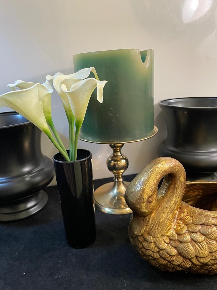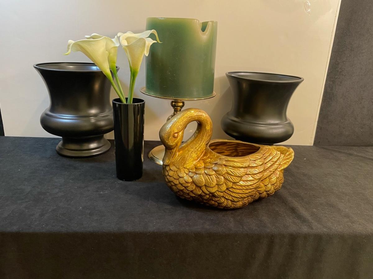 Pair of black plastic urns, green 3 wick candle on brass stand, black plastic vase with calla lilies and a gold ceramic swan planter