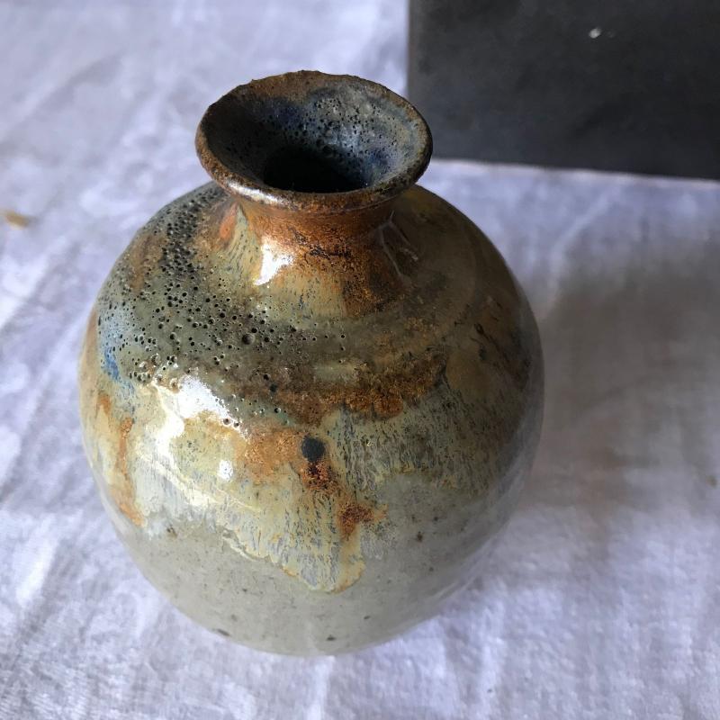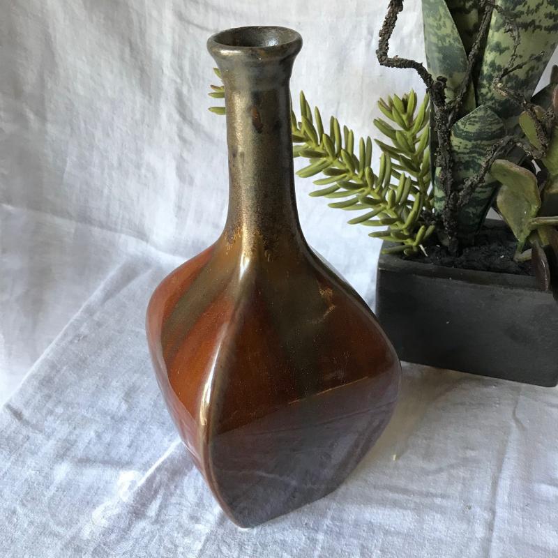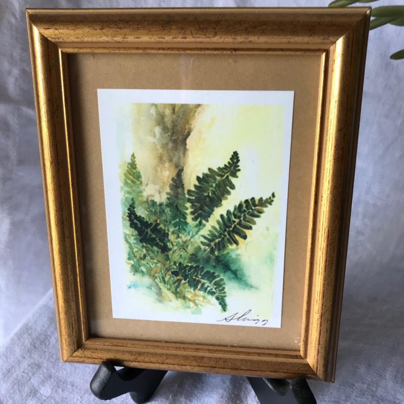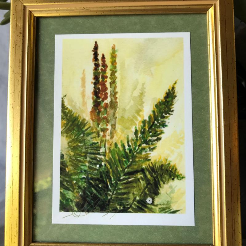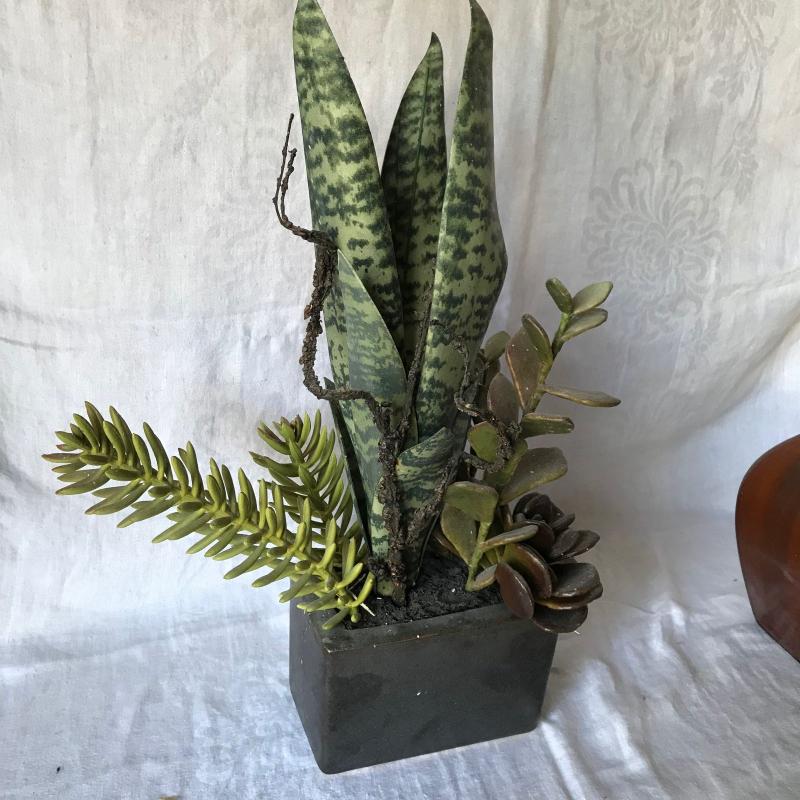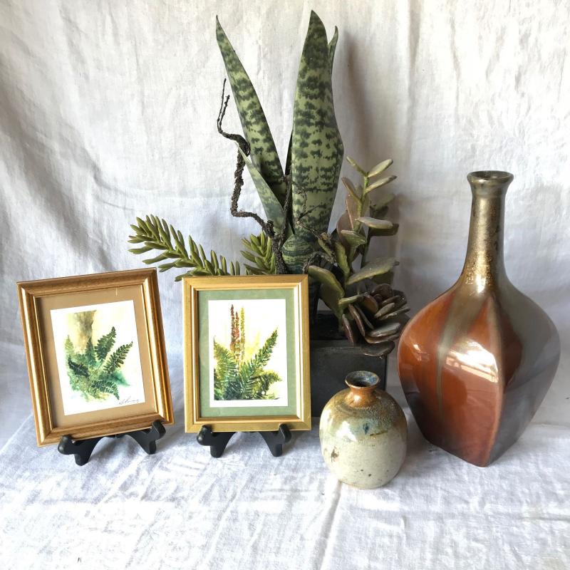 Lot includes two pottery vases (taller one is approx. 12.5”), faux succulents in ceramic planter, and two signed paintings by Sudan Lingg. No shipping