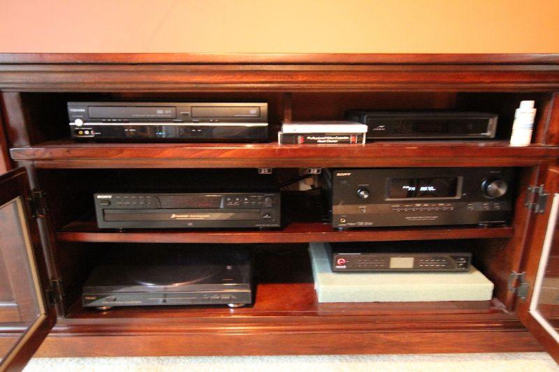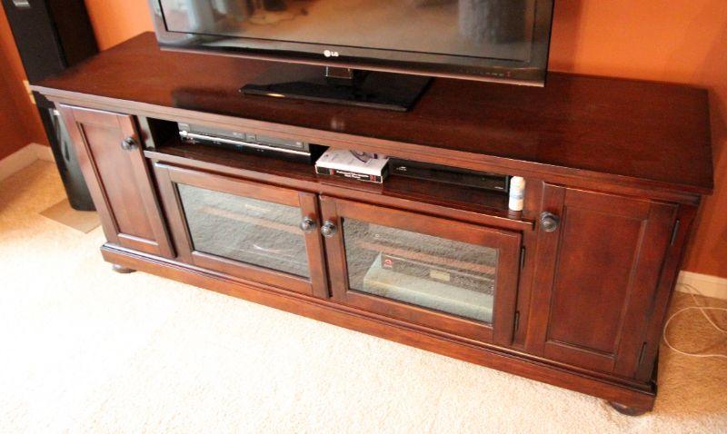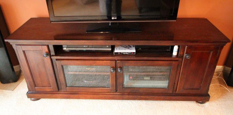 72" w x 20" d x 29" h. solid wood. Dark cherry finish. No damage. CONSOLE ONLY. Equipment sold separately.
