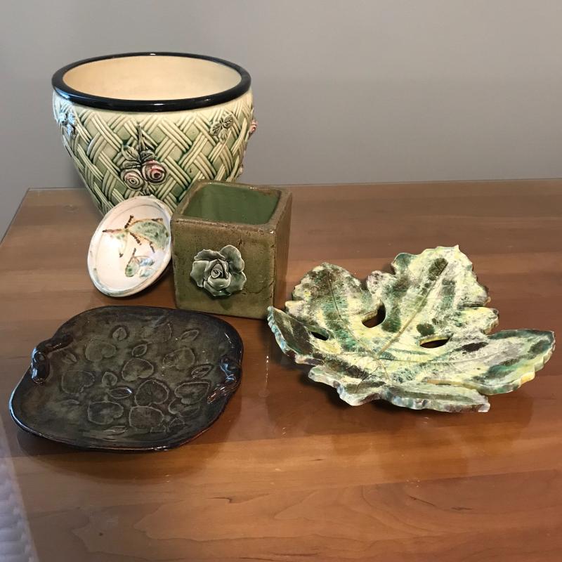 Five piece collection with the largest being a Weller pot measuring approx. 8.5”d x 7.5” (small crack, see photos). All pieces have fantastic details. Other signatures noted in photos. Local pick up only in Arden, NC.