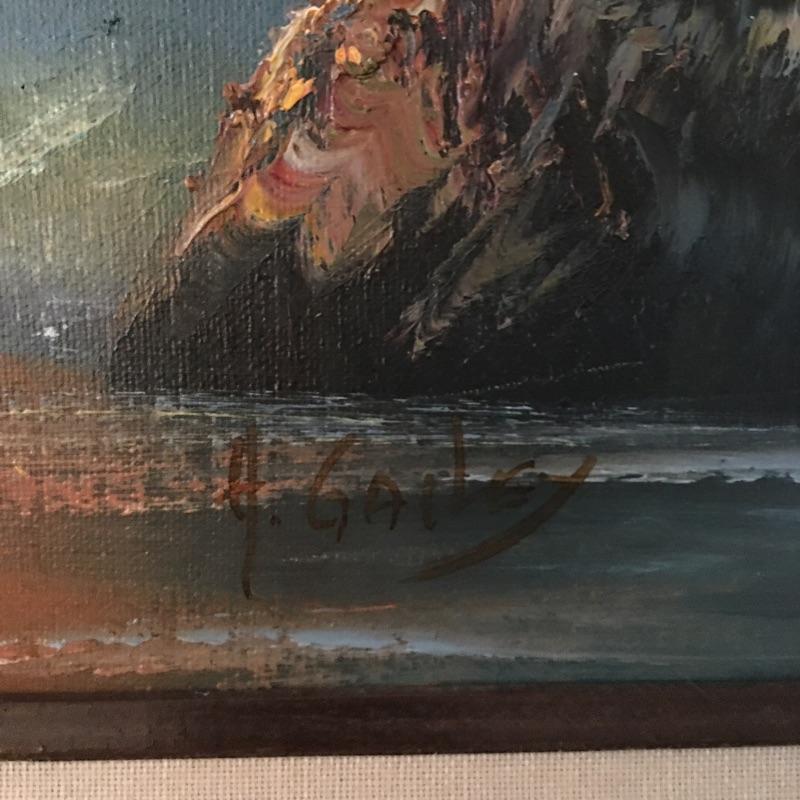 H. Gailey vintage framed and signed oil painting of a seascape. Painted on canvas. Appears to be original but not verified. Frame measures 27.5” x 31.5”.