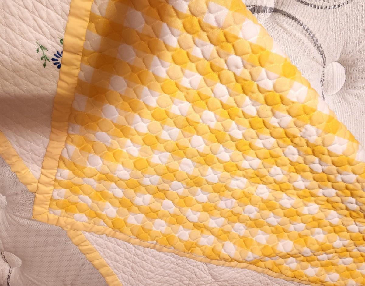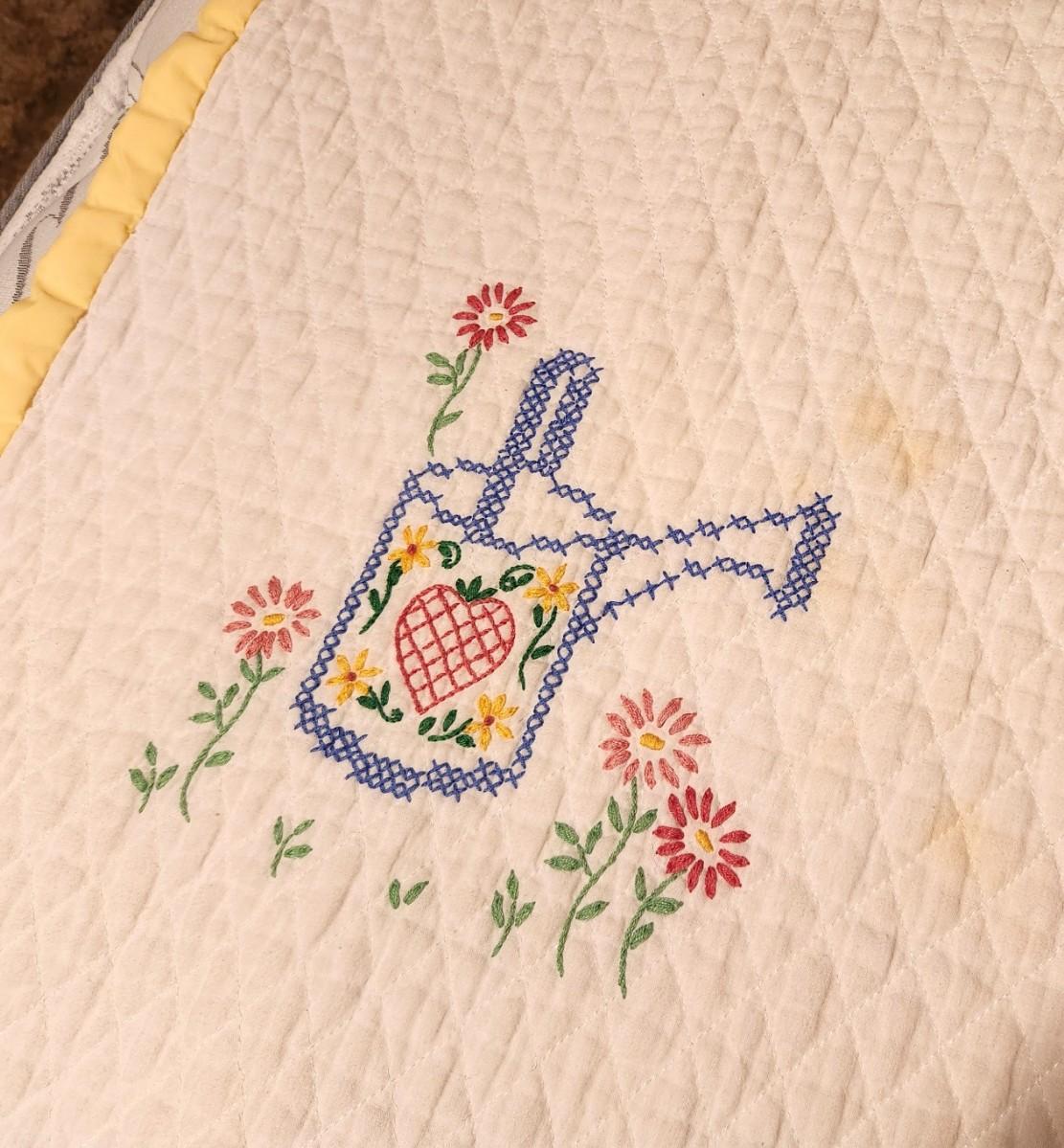 Sweet vintage hand embroidered baby quitt with a Peter Rabbit theme. Yellow back. 1 or 2 small yellowed spots - you have to hunt for them. 3 feet across, 56" long.