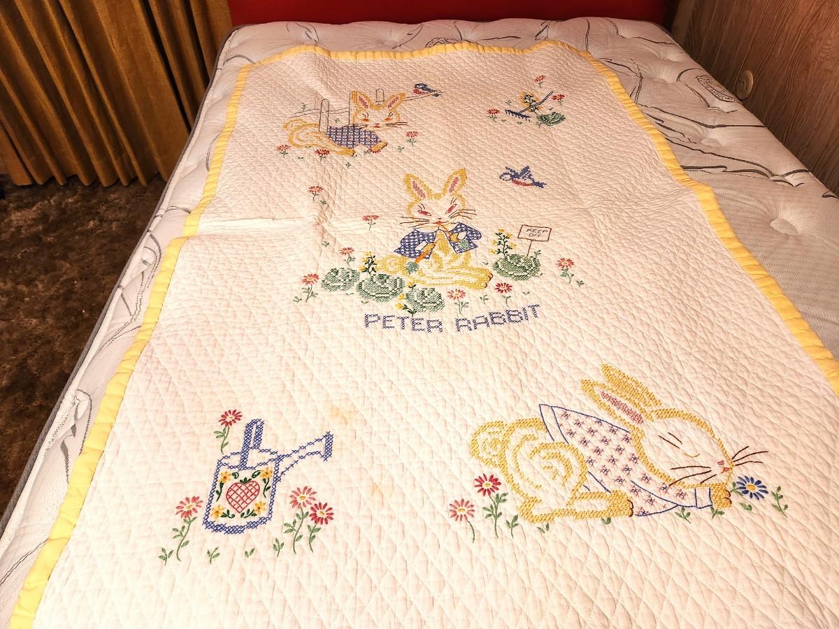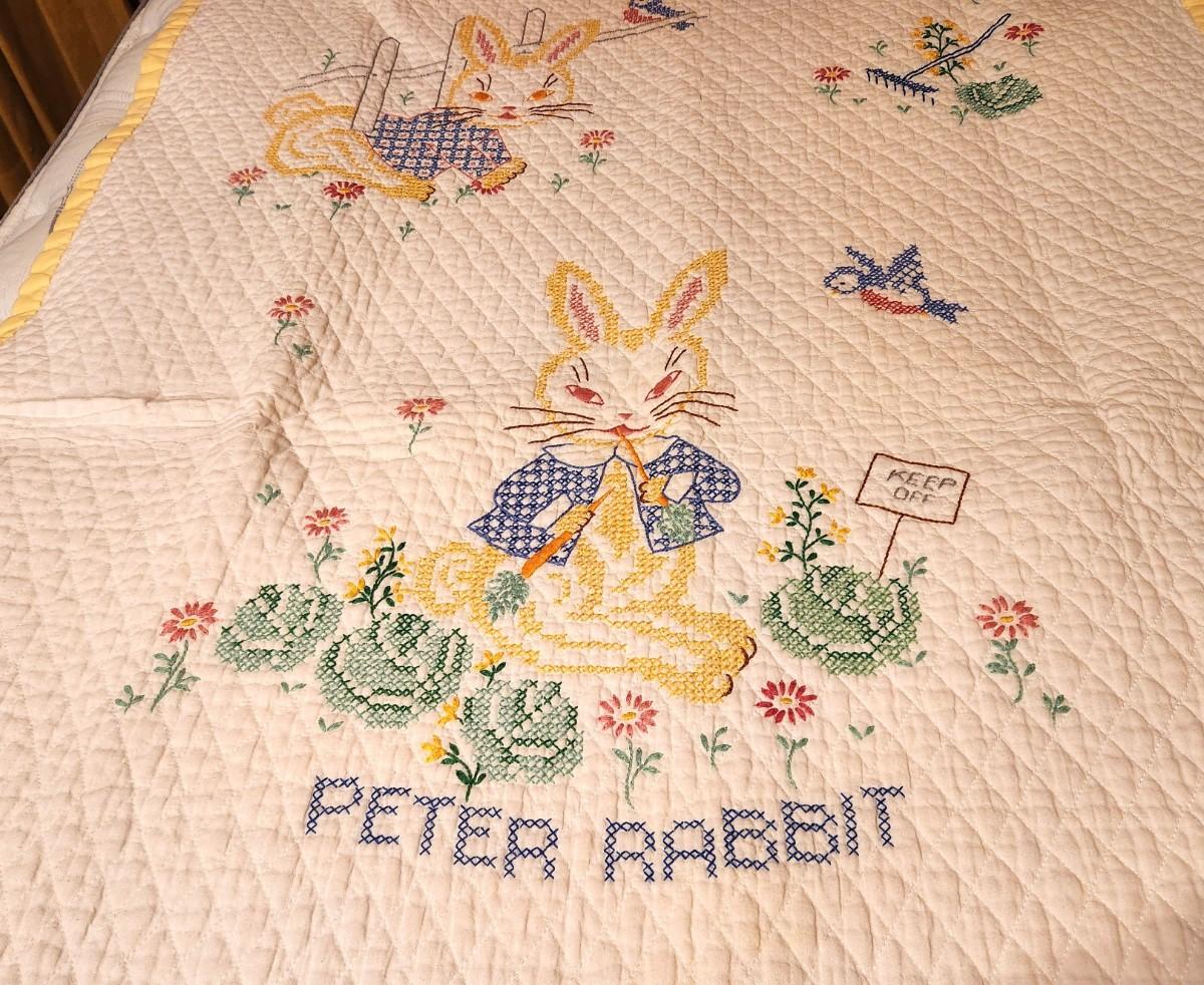 Lot #124 Hand Stiched Embroidered Baby Quilt - Peter Rabbit - Vintage