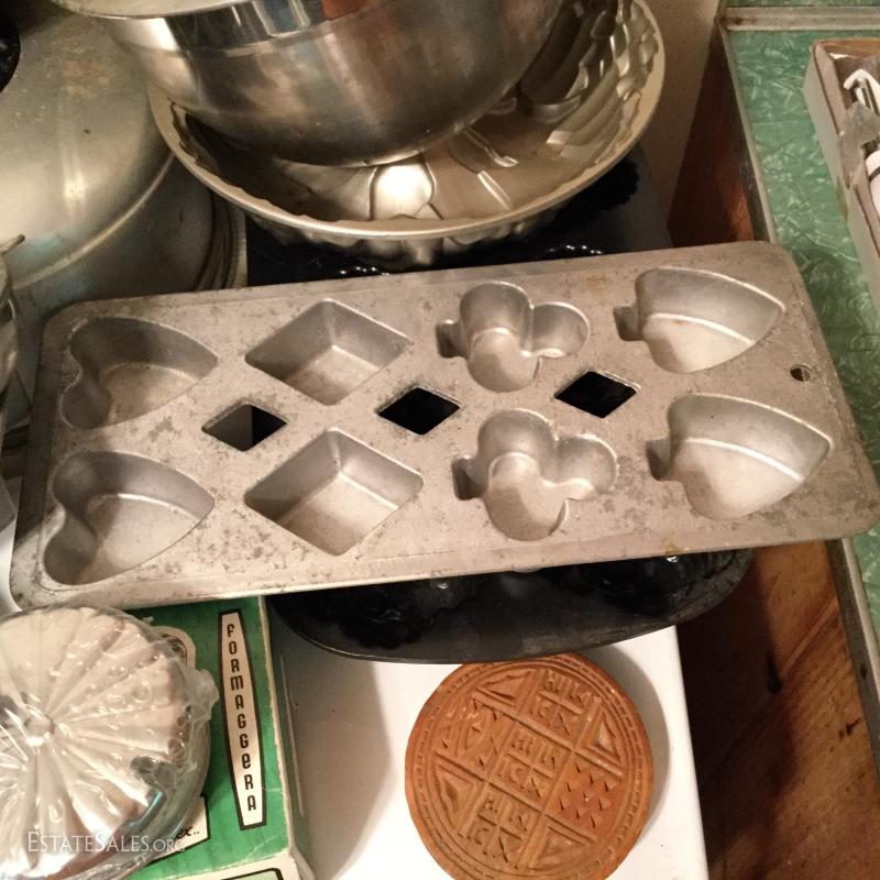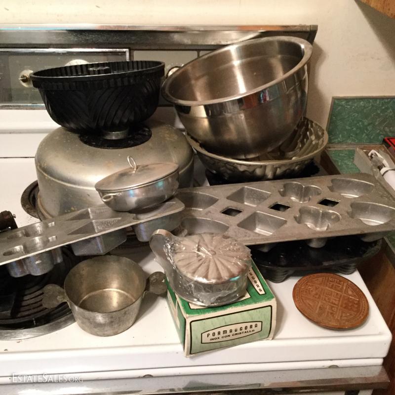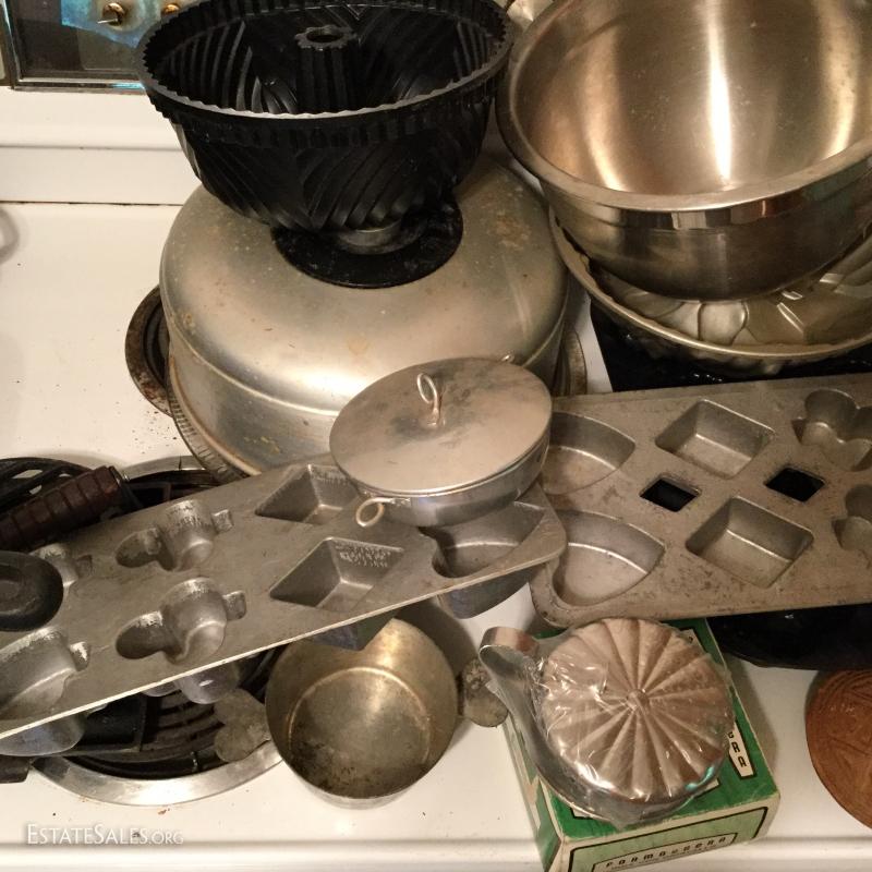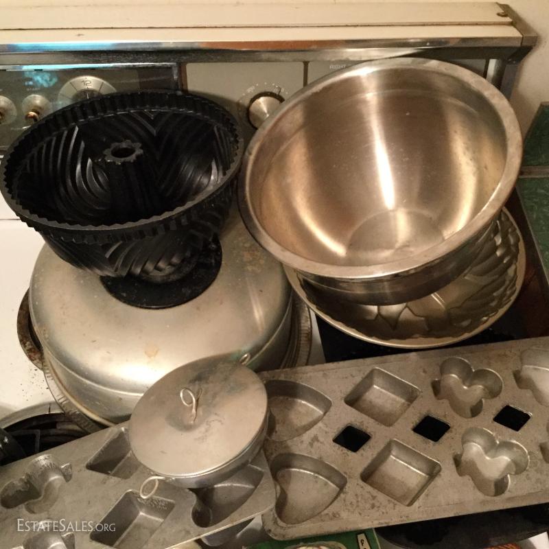 Large Lot of Baking Pans, Molds, Muffin Pans, Biscuit Press, Mixing Bowls. See Photos for more Details.