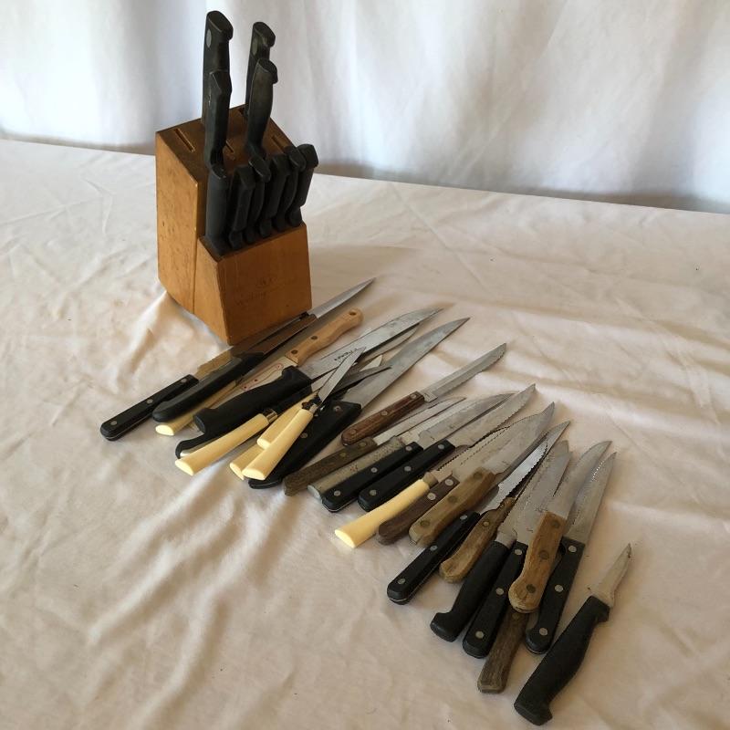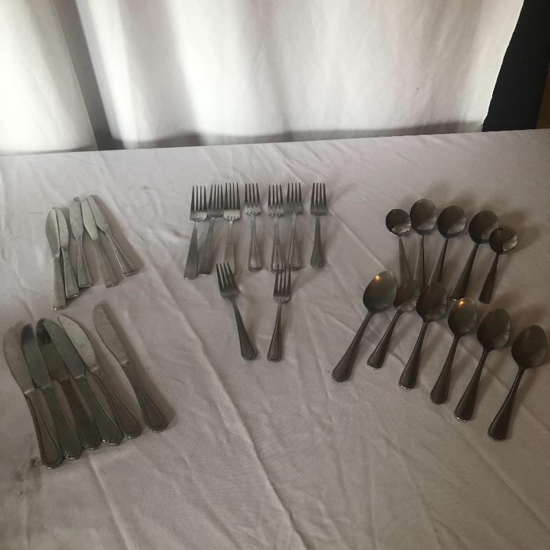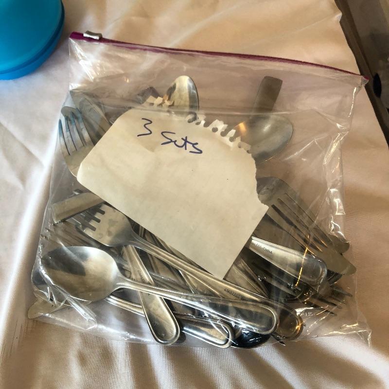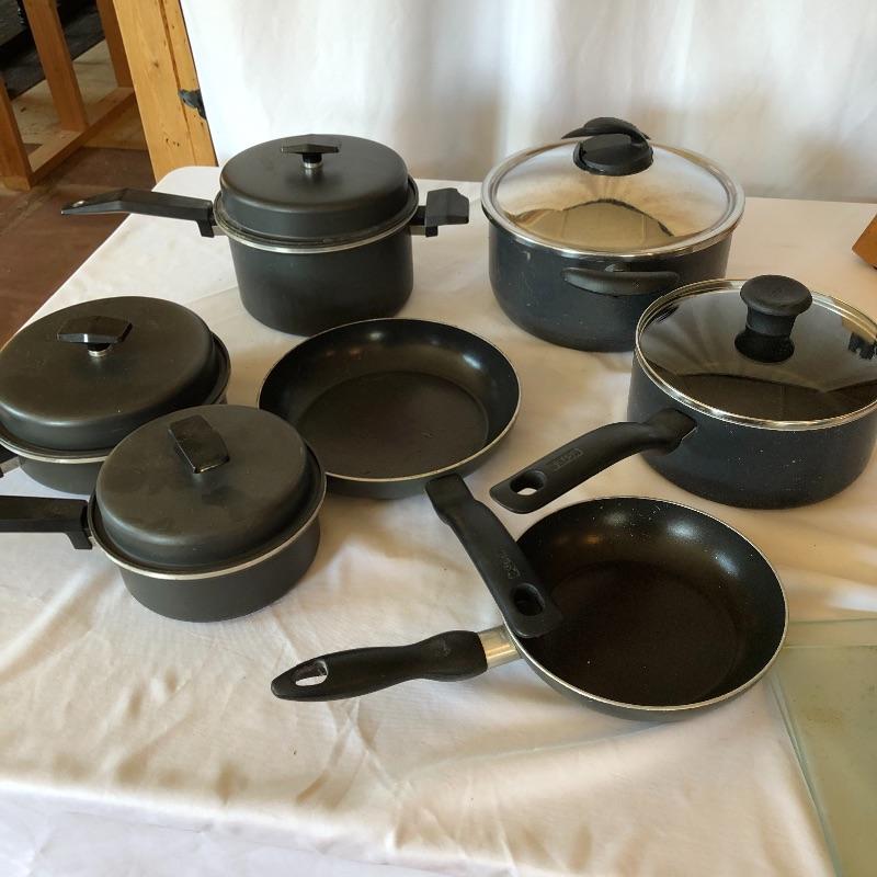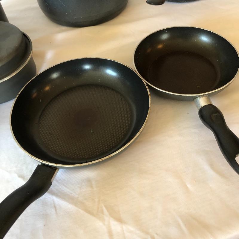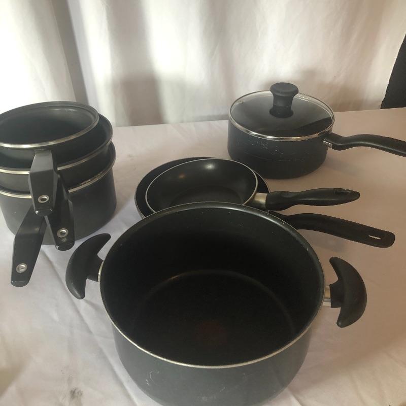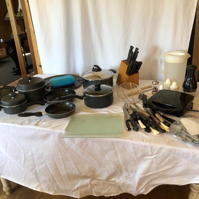 This lot contains everything one would need to set up a kitchen! It includes pots and pans, three sets of silverware, many knives, pizza sheet pans and loads more! Waffle maker is a salton. Powered on when tested. Pots and pans are Miracle Maid, ,Tfal and Durabase. Silverware includes two styles intermixed for a total of eleven knives, nine forks, and eleven spoons. Local pick up only.