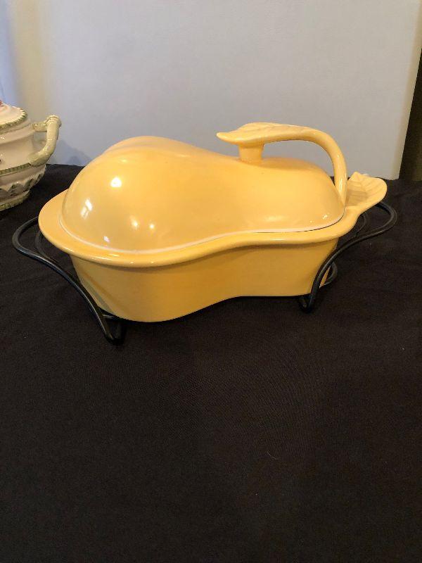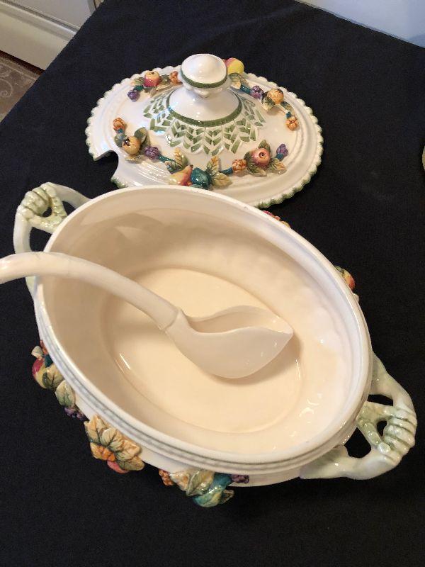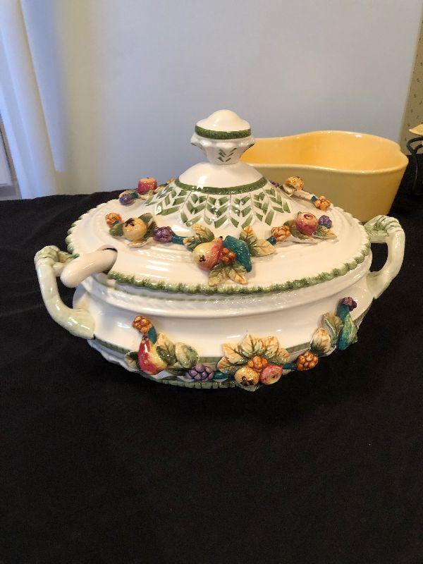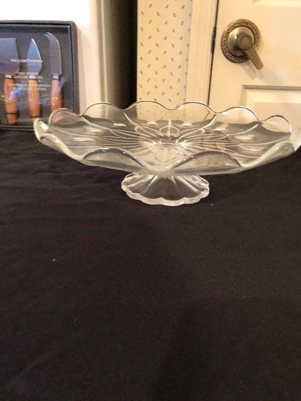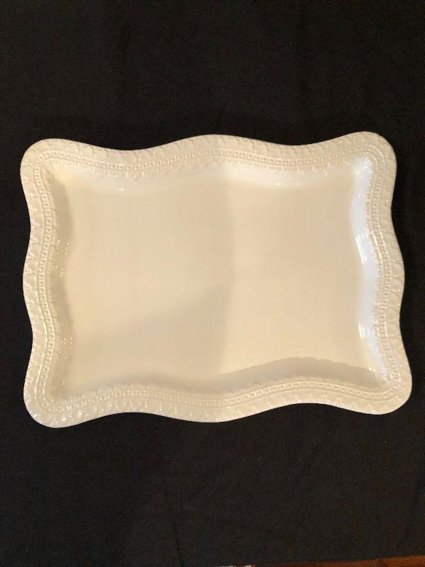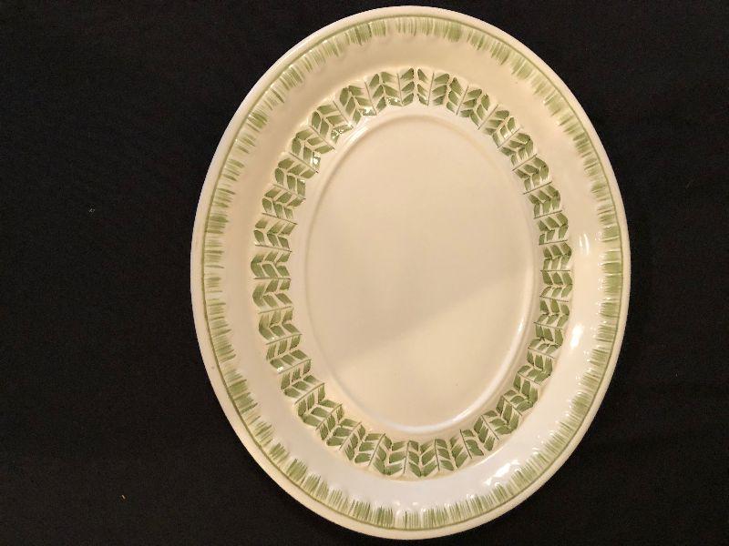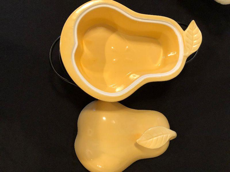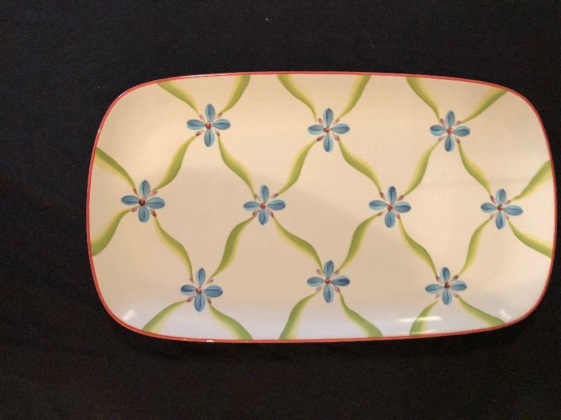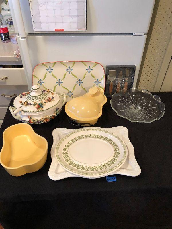 Assorted Kitchen Ware Includes a new Williams Sonoma Cheese Knife set, Pear Bowls, White Ceramic Trays, Green & White Tray and a Cake Dish.