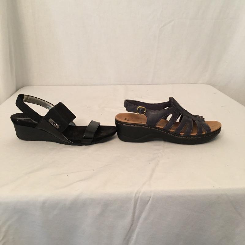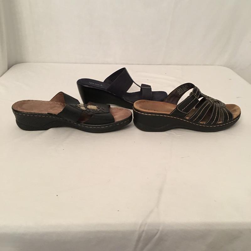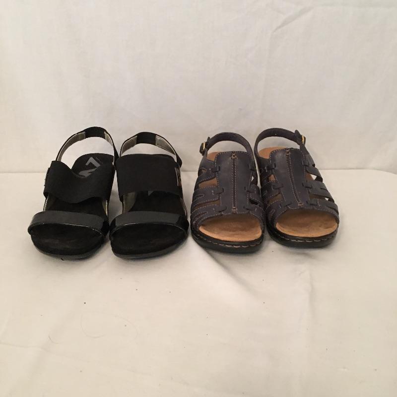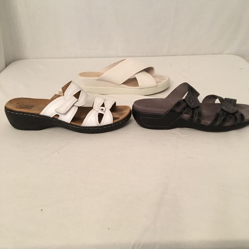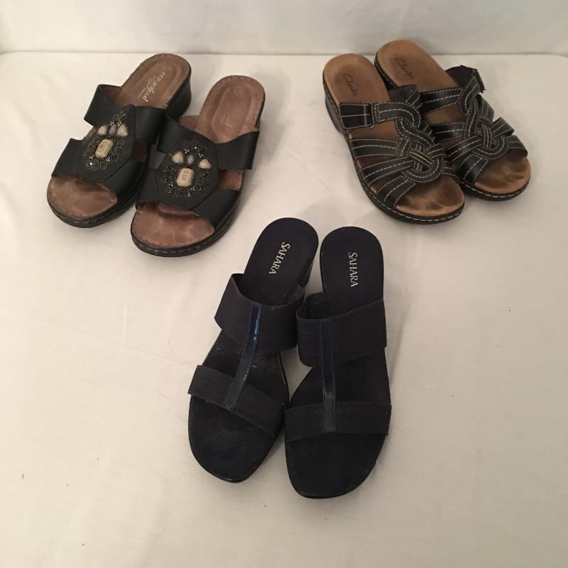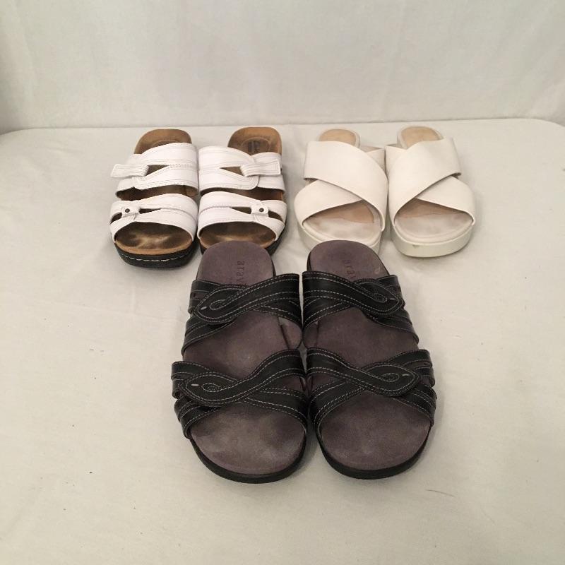 Can a woman ever have enough shoes! There are fifteen pairs of ladies sandals in total here and for your sake, cross your fingers and toes that they are in your size! This great selection of sandals contain a multitude of colors, styles and materials and they are all in the size range of 9's to 9.5's. Included are name brands such as Anne Klein, Clark’s, Aerosoles, Ecco, Aravon and more.