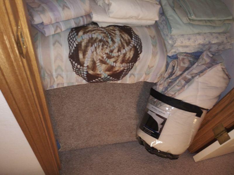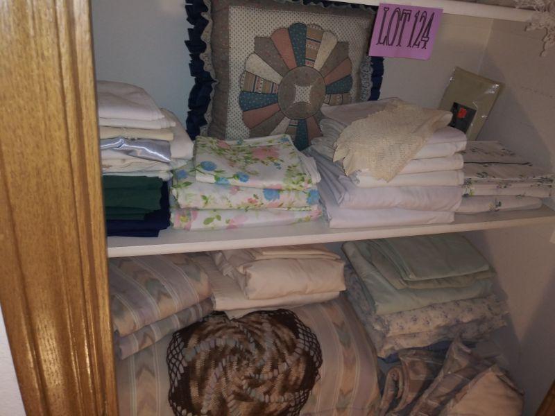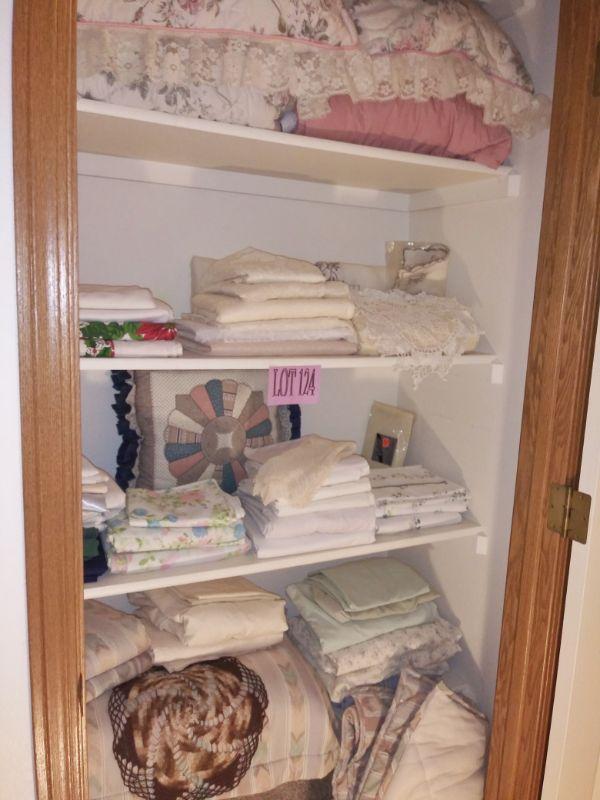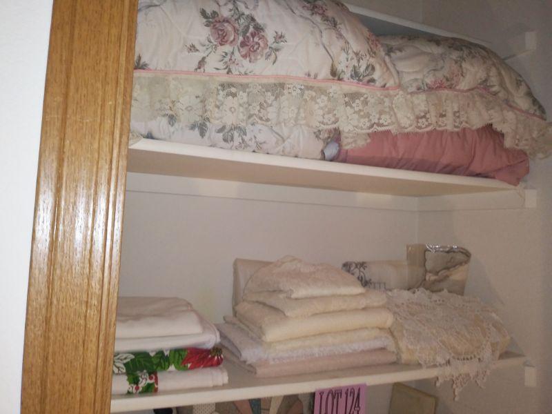 CLOSET FULL OF QUEEN SIZE SHEETS, TABLECLOTHS, PILLOWS, COMFORTERS, TOWELS AND MORE