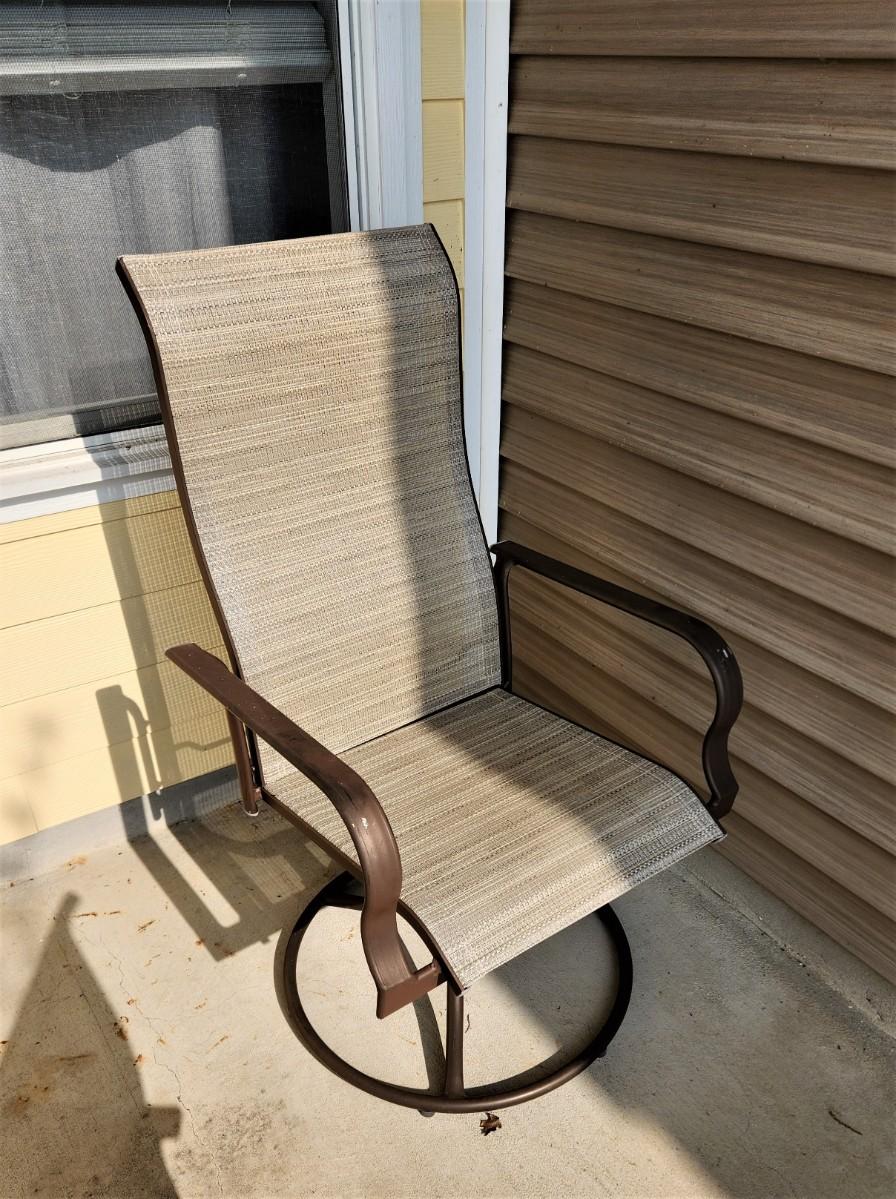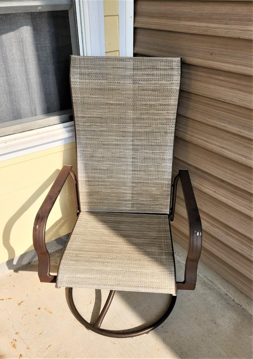 Gently Used Martha Stewart Swivel Patio Chair - 24" across, 41" tall at the back. Sturdy, good condition. Matches patio set in previous lot.