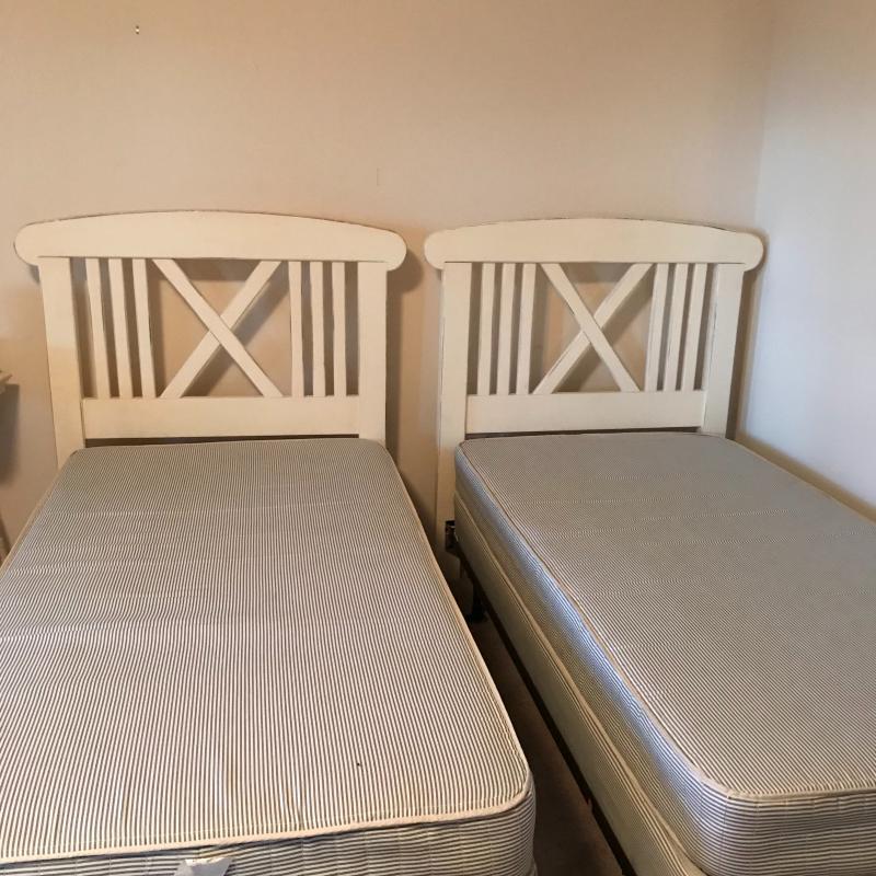 These two identical twin bed frames with headboards (measuring 48” x44”) are sturdy and in great condition. The mattresses and springs are available to the winner if interested for free.