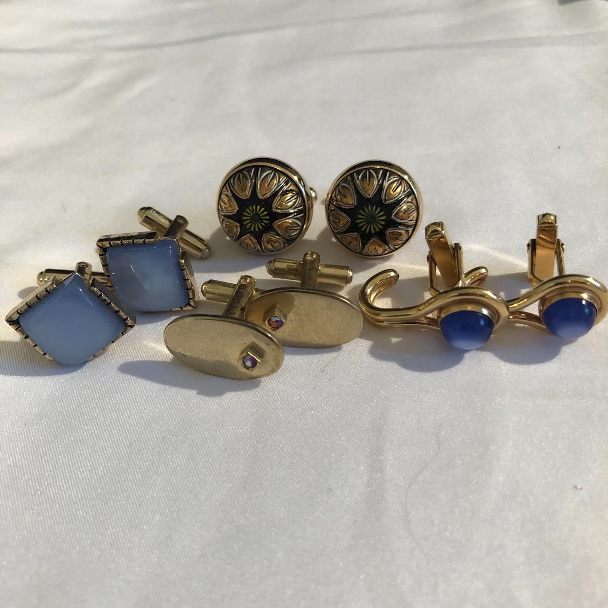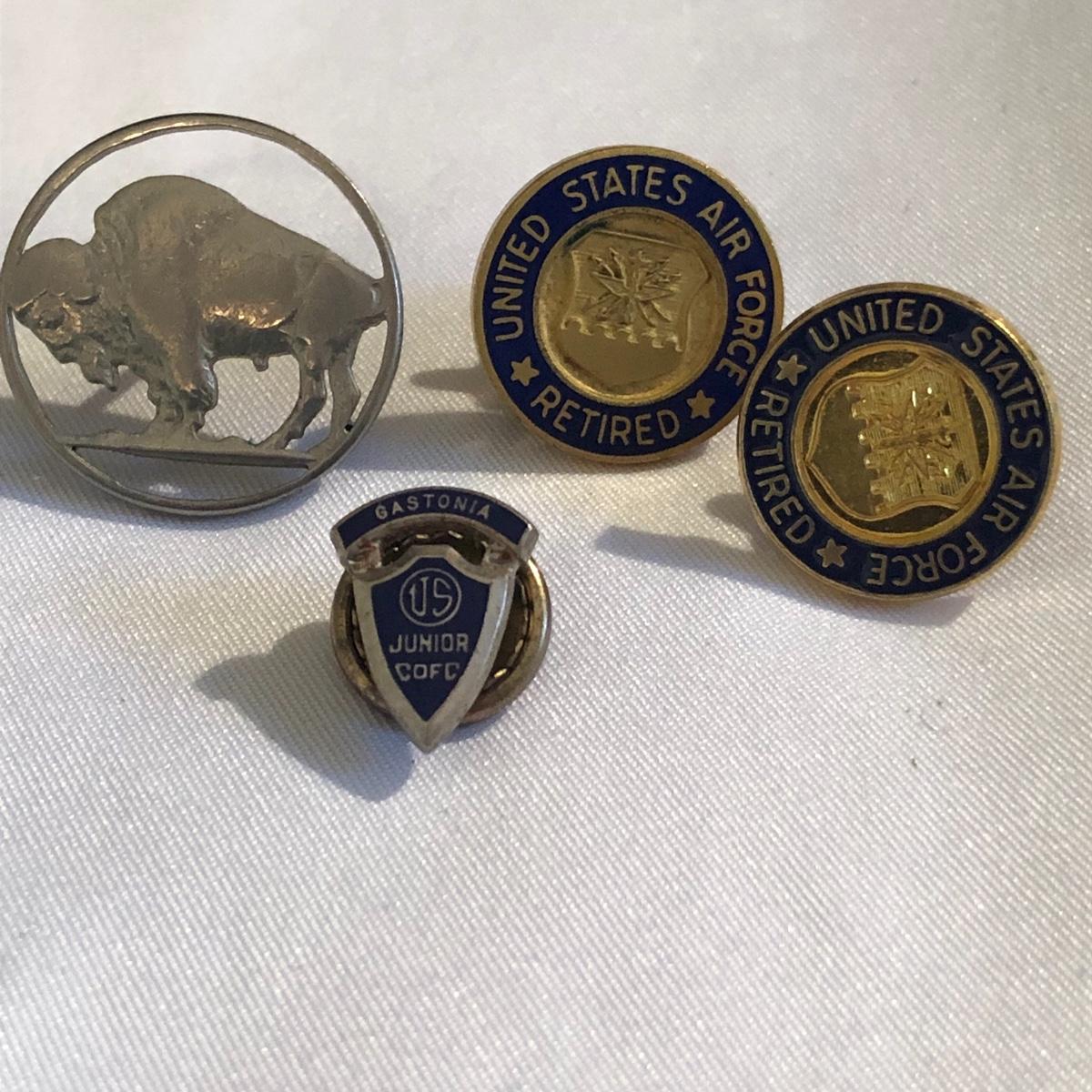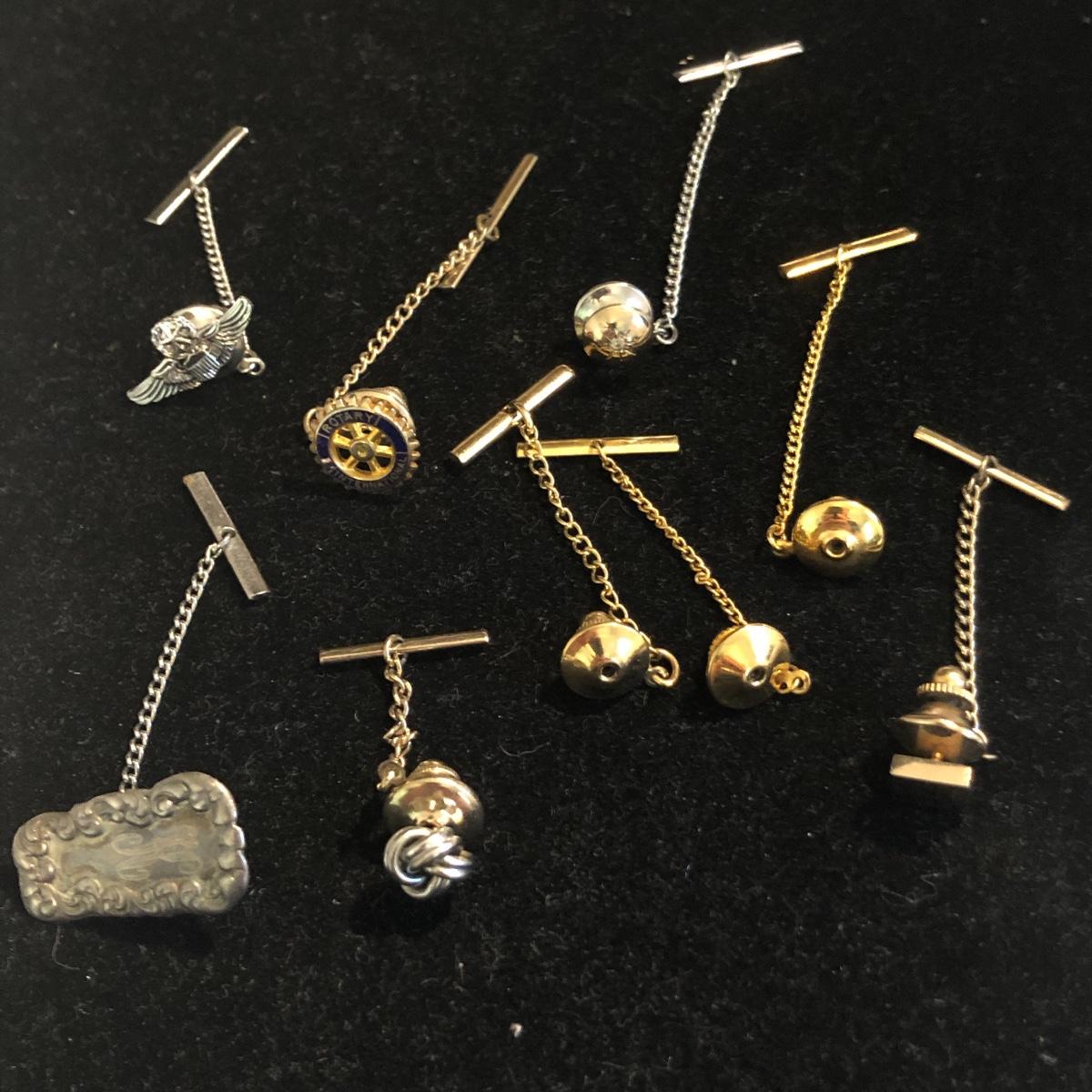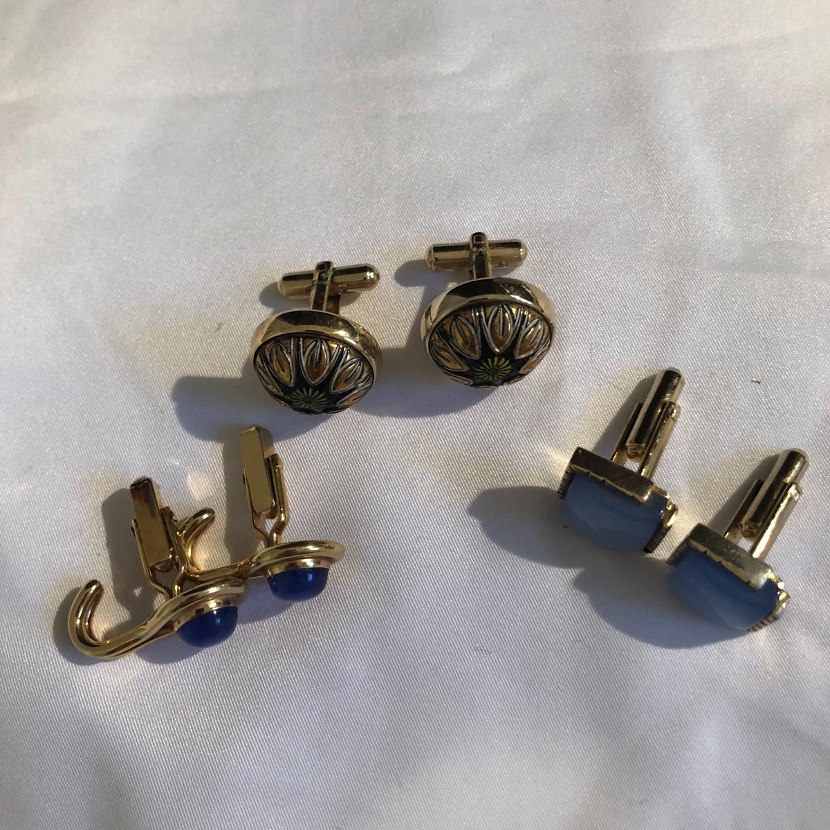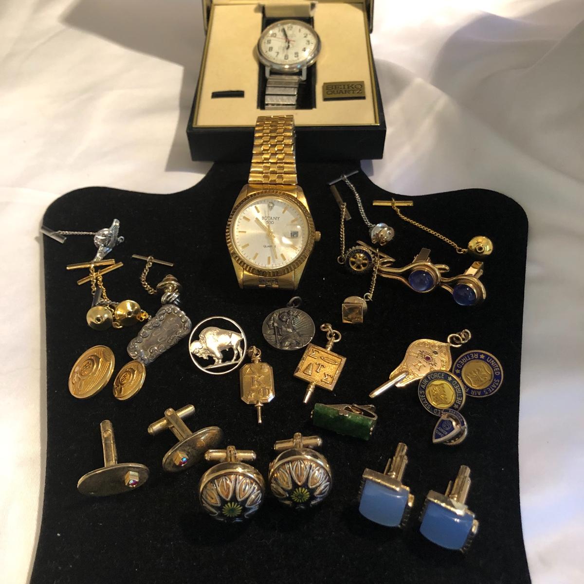 We have two watches for you here plus lots of cufflinks, tie tacs, pendants and pins. The Bulova watch does have a good amount of scratches on the watch face. The other watch is a Botany 500; batteries are no longer working on either watch. There are a good variety of cufflink pairs as well as tie tacs, two buttons and pins, that includes some Air Force pins. 3 of the 4 pendants appear to be from a college fraternity.