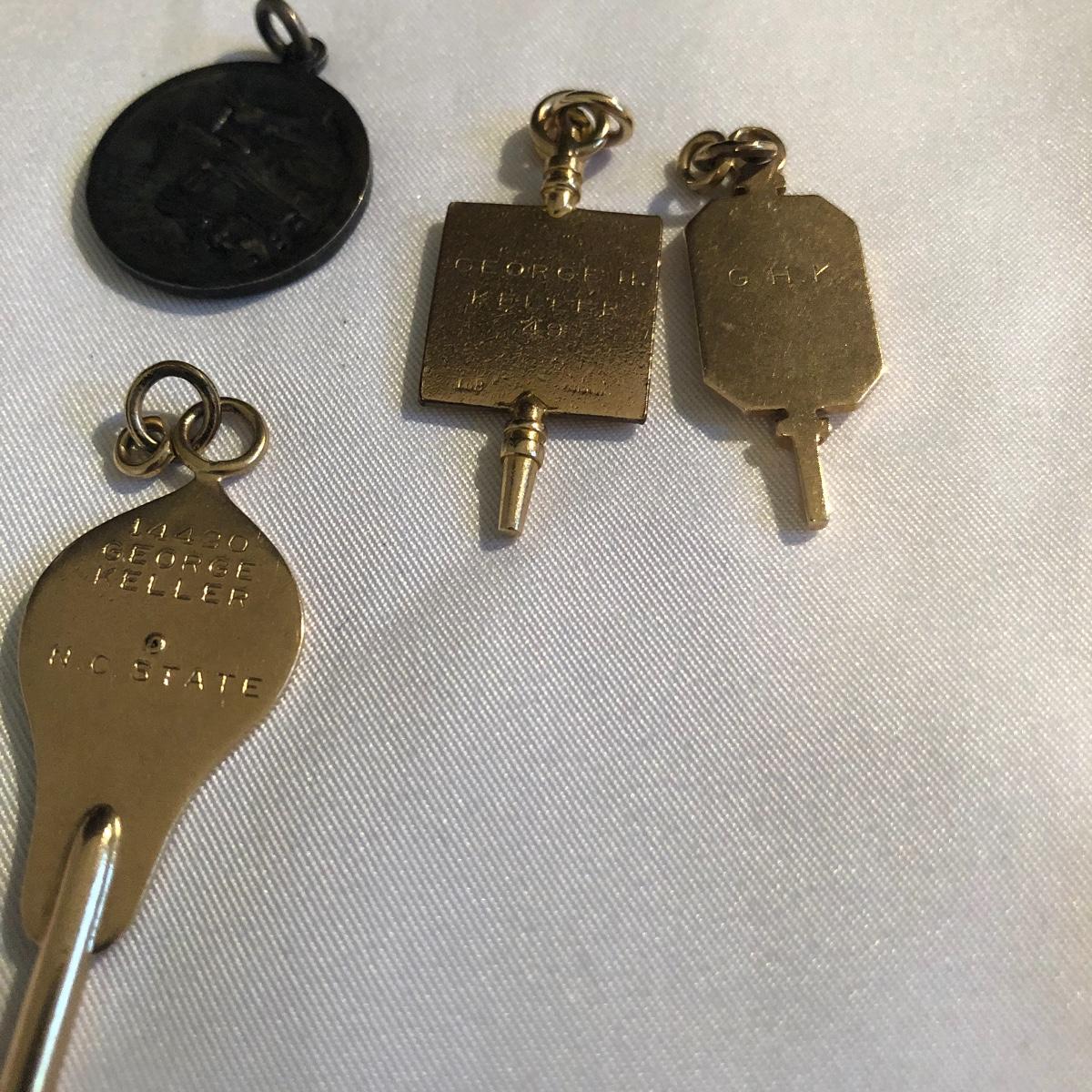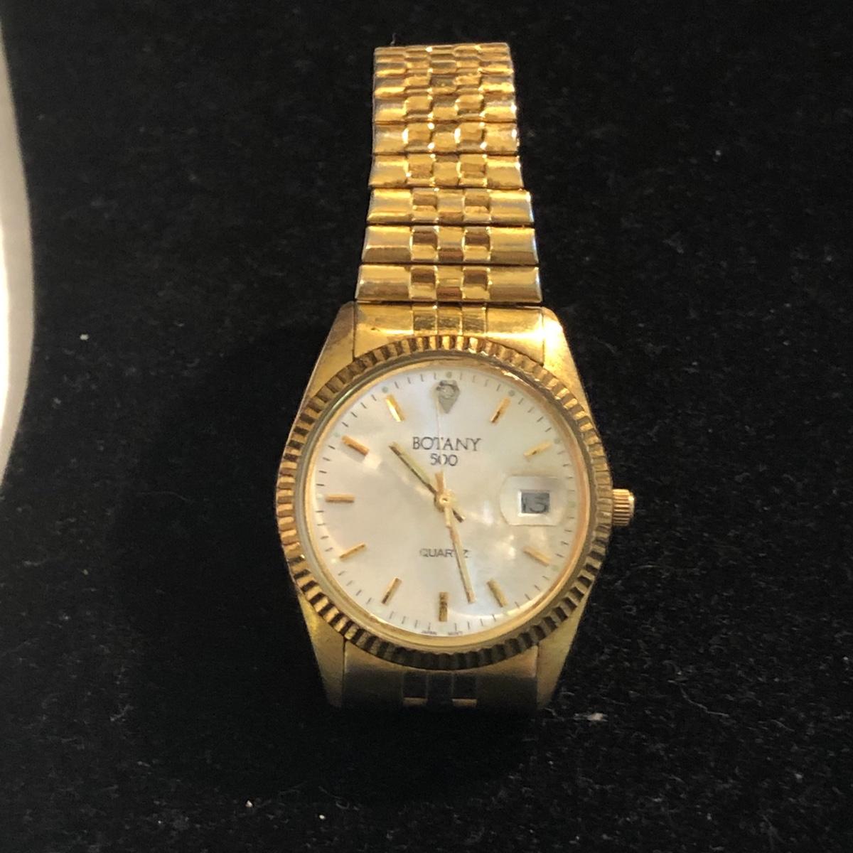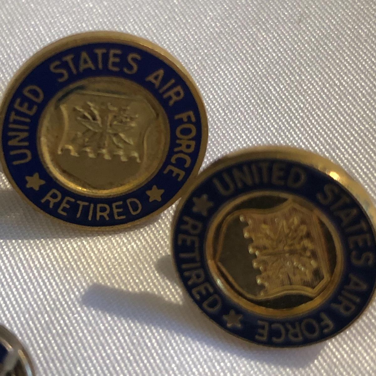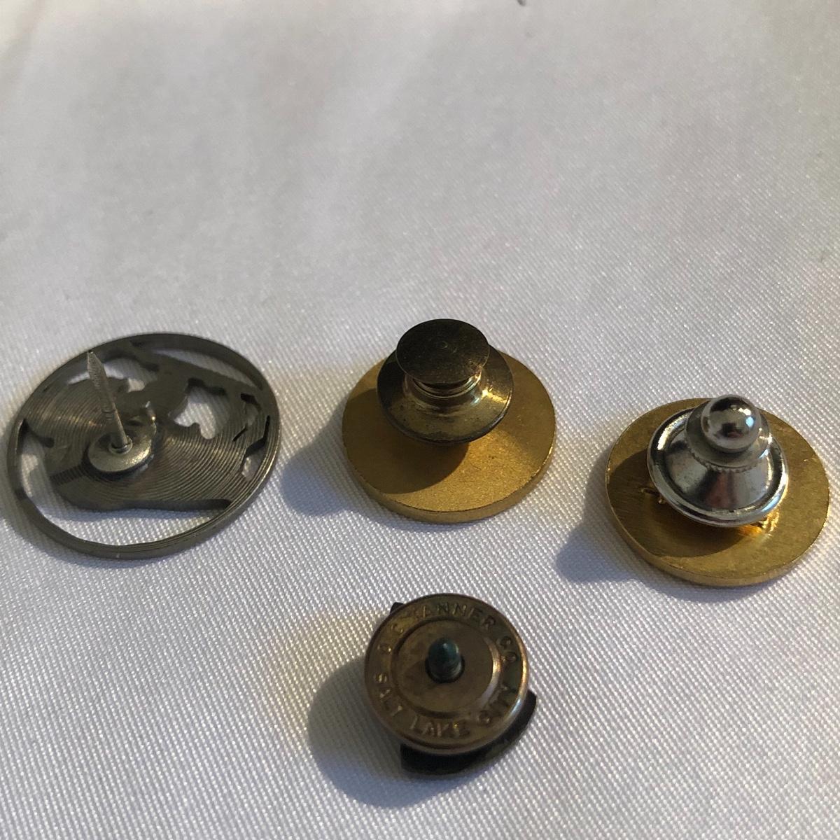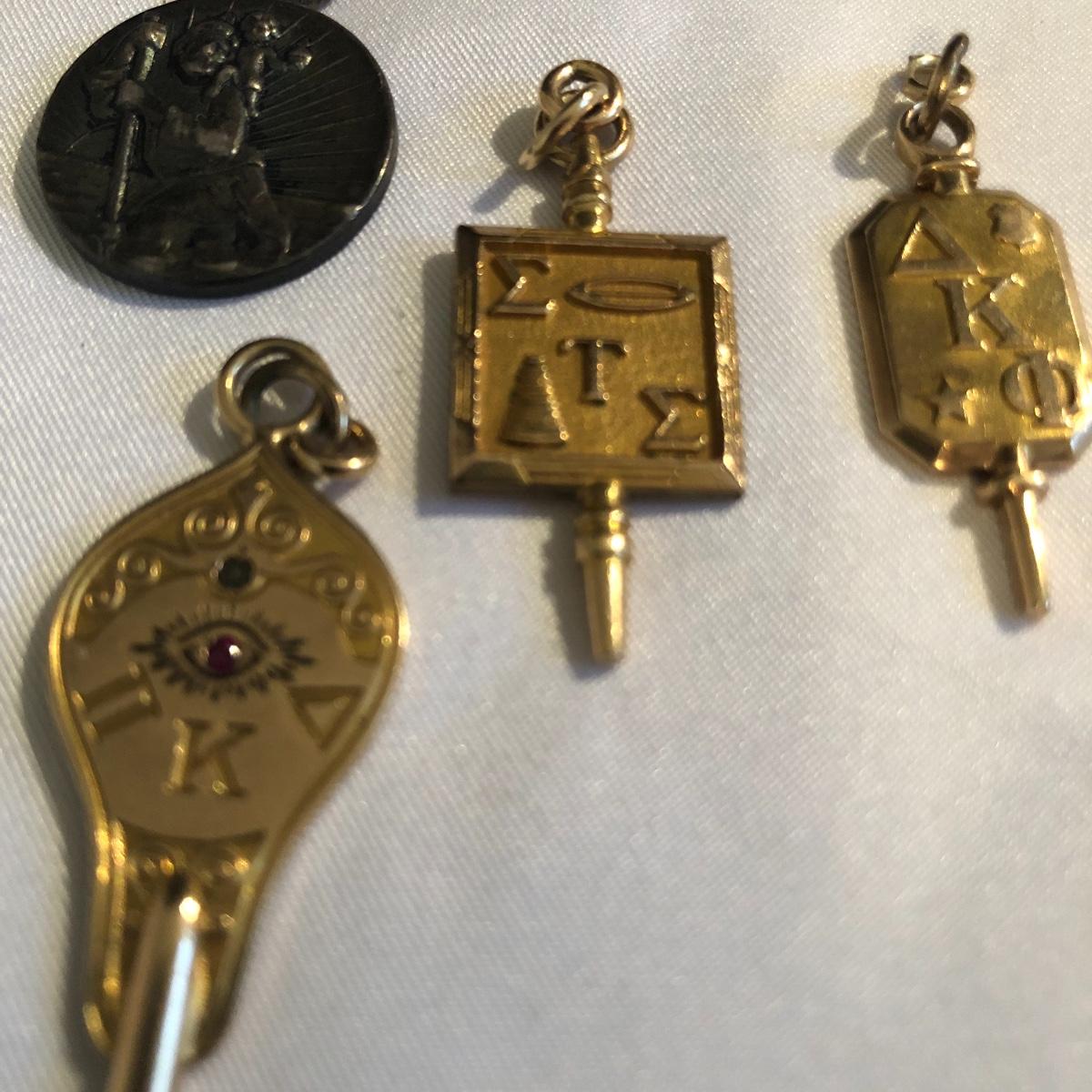 We have two watches for you here plus lots of cufflinks, tie tacs, pendants and pins. The Bulova watch does have a good amount of scratches on the watch face. The other watch is a Botany 500; batteries are no longer working on either watch. There are a good variety of cufflink pairs as well as tie tacs, two buttons and pins, that includes some Air Force pins. 3 of the 4 pendants appear to be from a college fraternity.