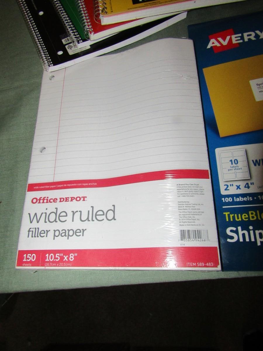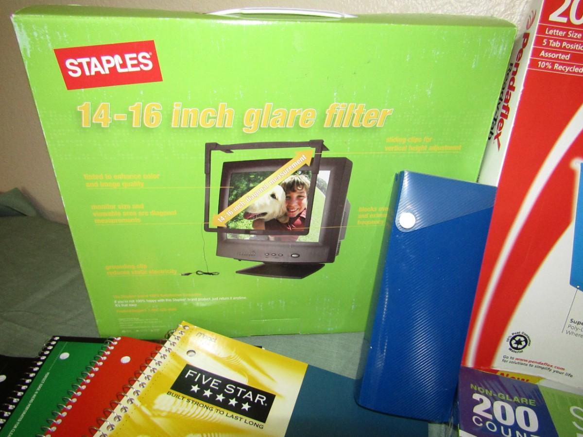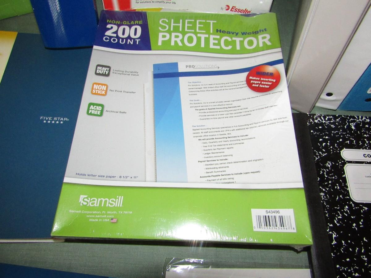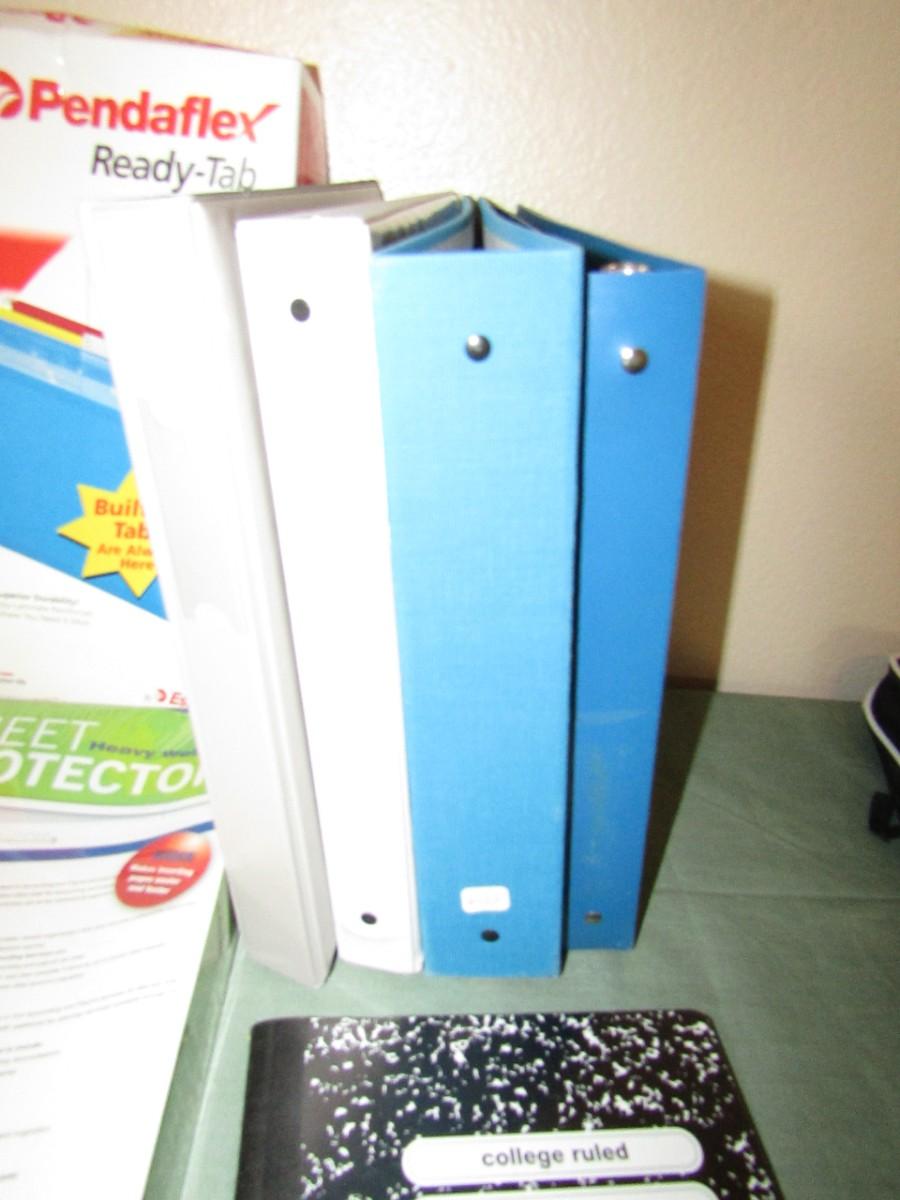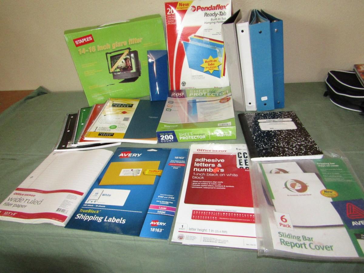 LOT OF OFFICE SUPPLIES INCLUDING: 3 RING BINDERS, NOTEBOOKS, SHIPPING LABELS, READY TAB FOLDERS, GLARE FILTER