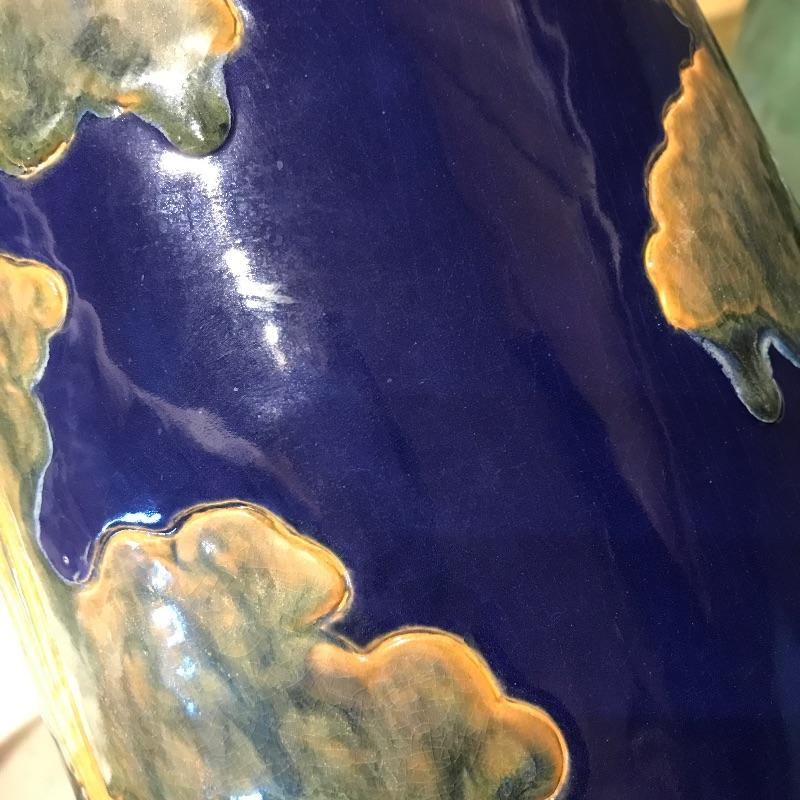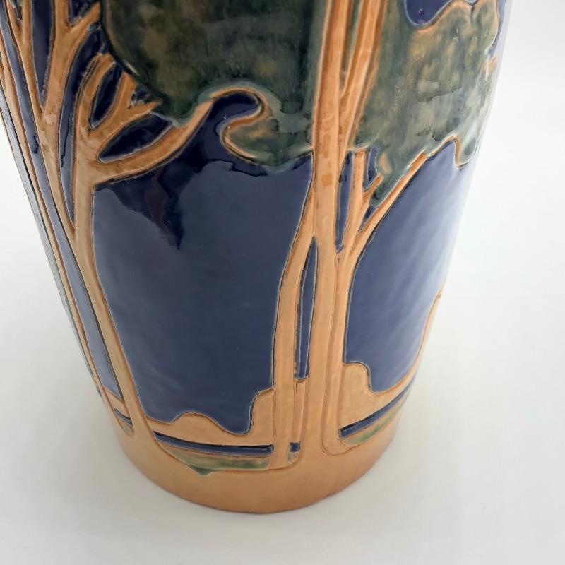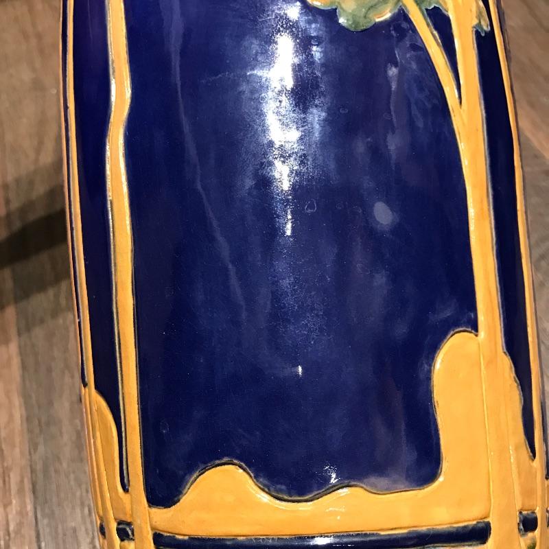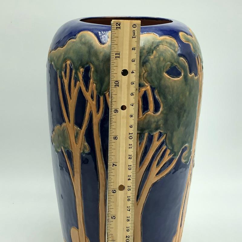 This gorgeous vase is a reproduction of a Rhead vase that is made by by Art Accardi. It is rich in color with green, blue, and brown. Some close up photos have been included. Measures approximately 7” x 7” x 12”.