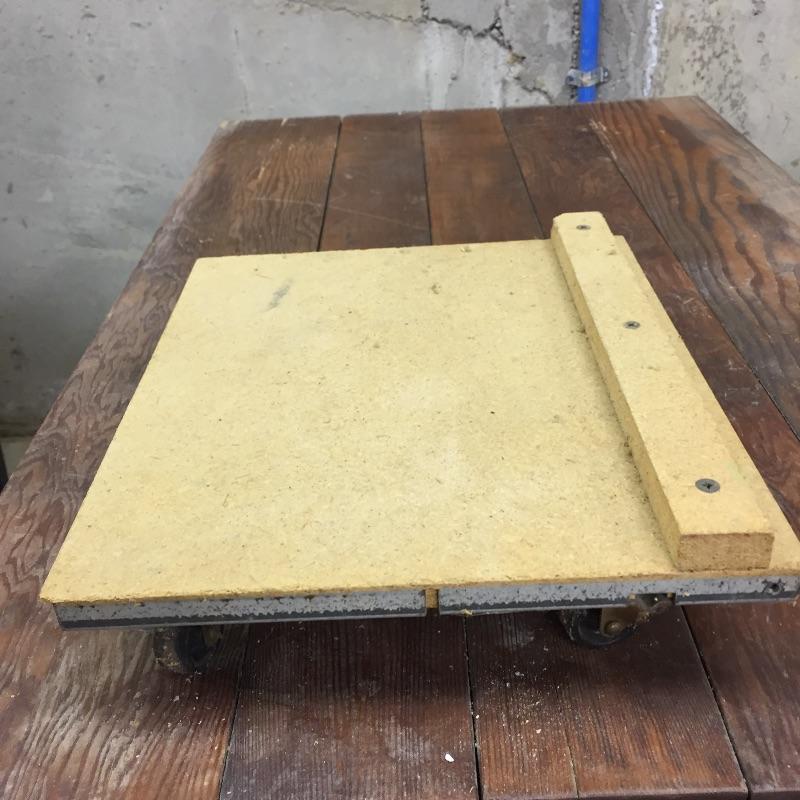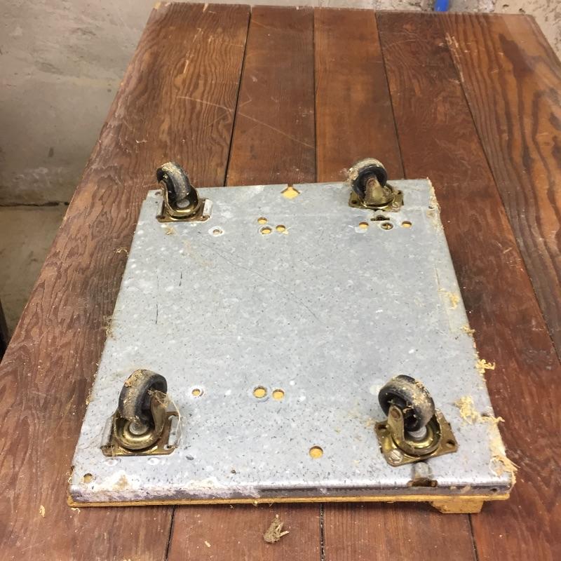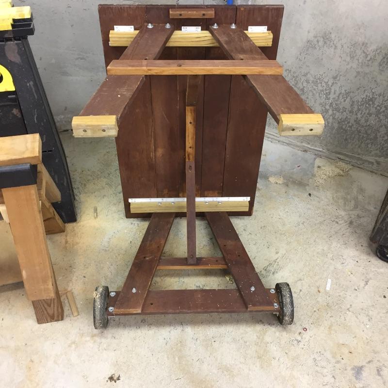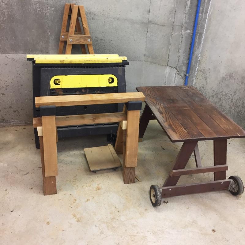 Three plastic folding sawhorses, two wooden sawhorses , table with wheels and more. Get ready for your projects with this lot. Table measures 21.5” x 35.5” x 21.5”.