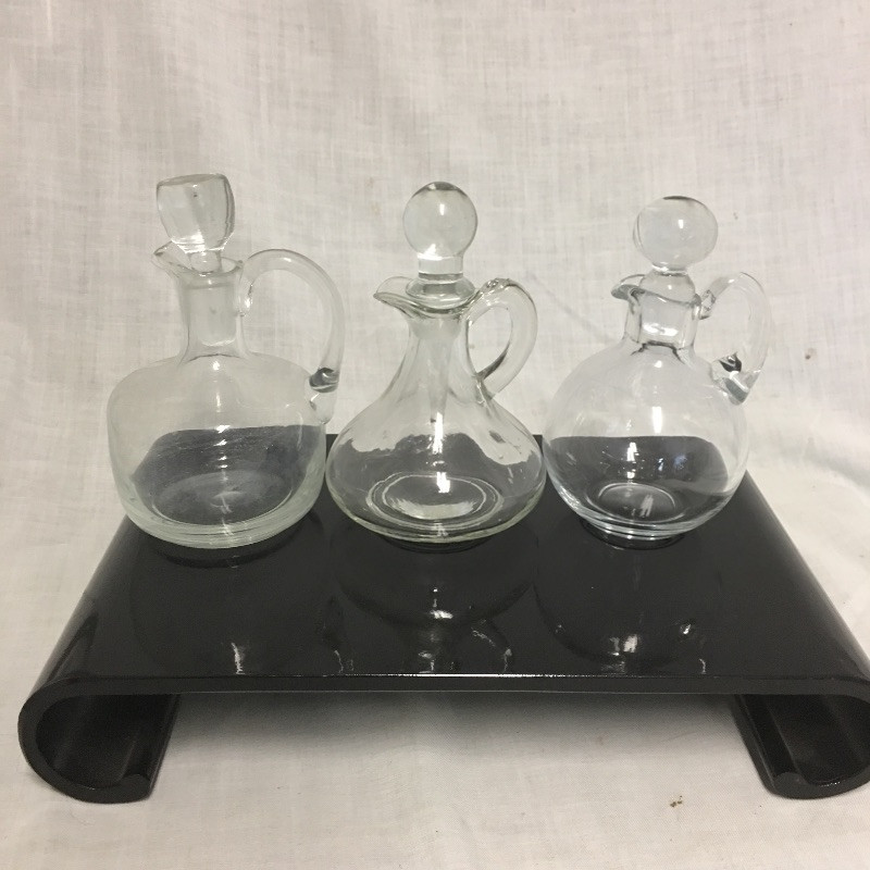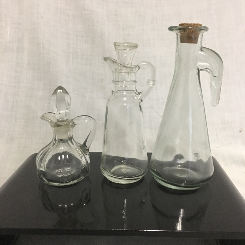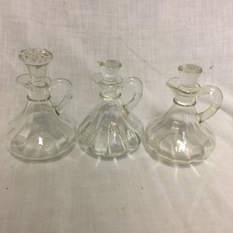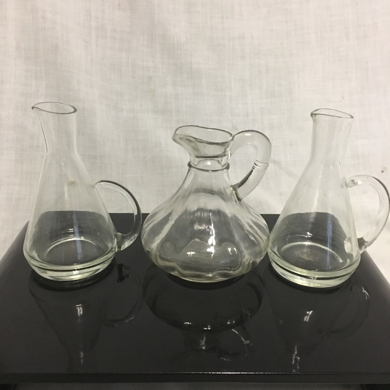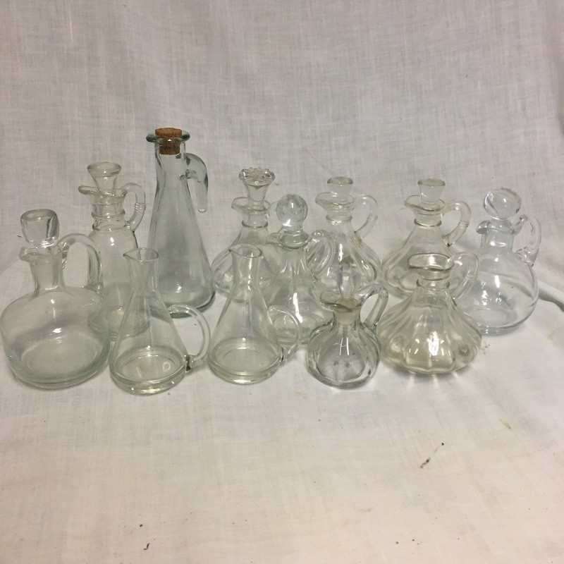 A lovely collection to display or use with these twelve small glass pitchers. Eight of the pitchers have glass stoppers and they come in a variety of shapes and sizes. Largest pitcher measures 3”D x 7” tall.