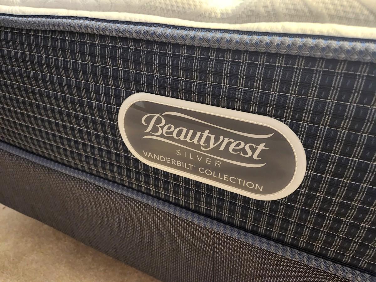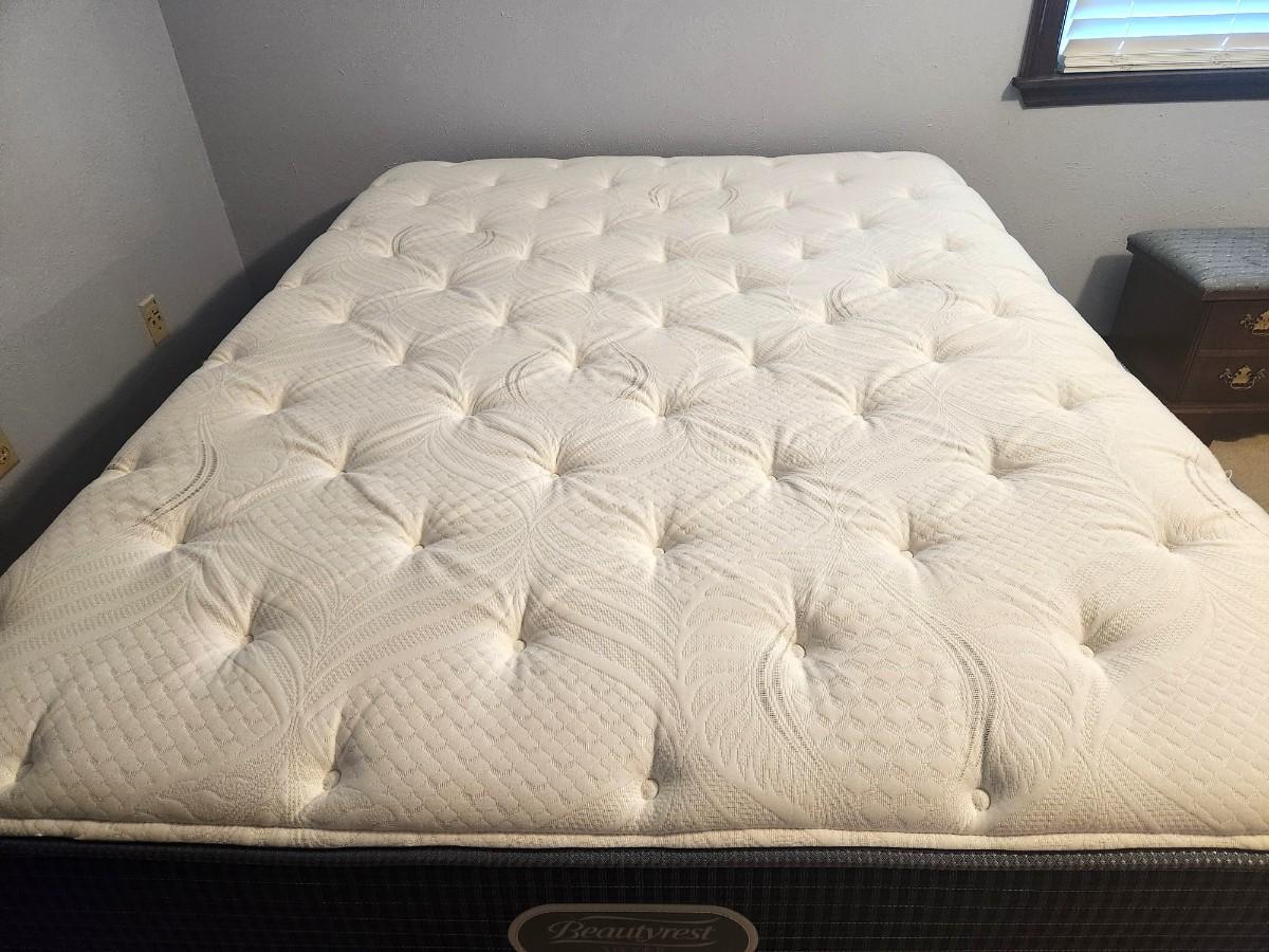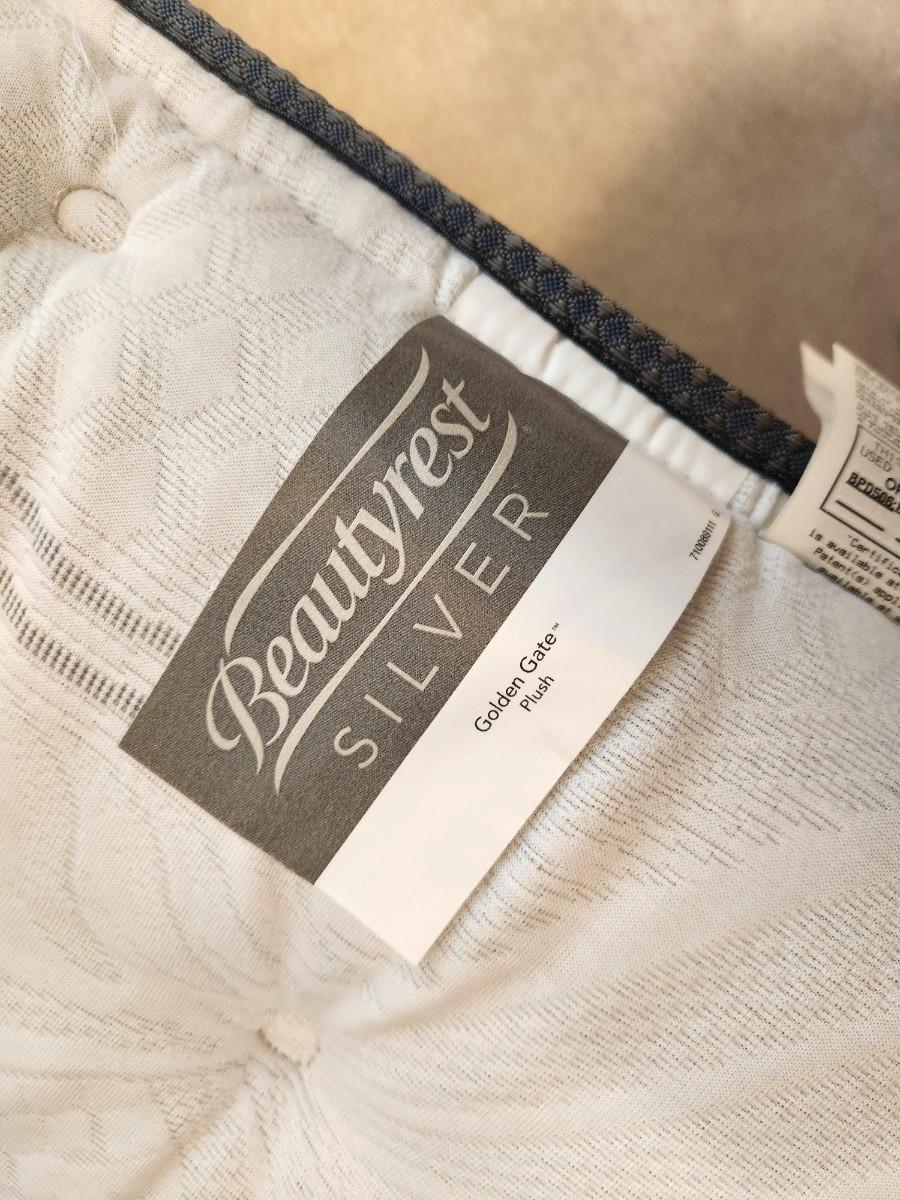 Bordering on Like New (one small pull in tufting on top) - clean. Beauty Rest Silver Golden Gate Plush Queen size mattress and box springs. 56" across, 79" long, 27" tall with frame. Yes - you get the bed frame too. Perfect for the guest room.