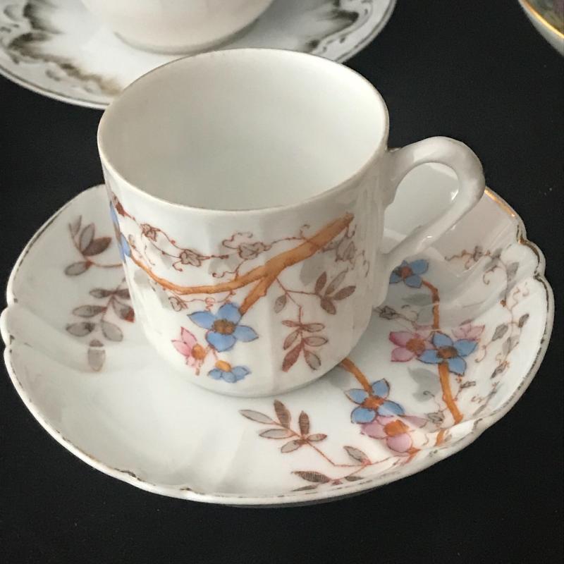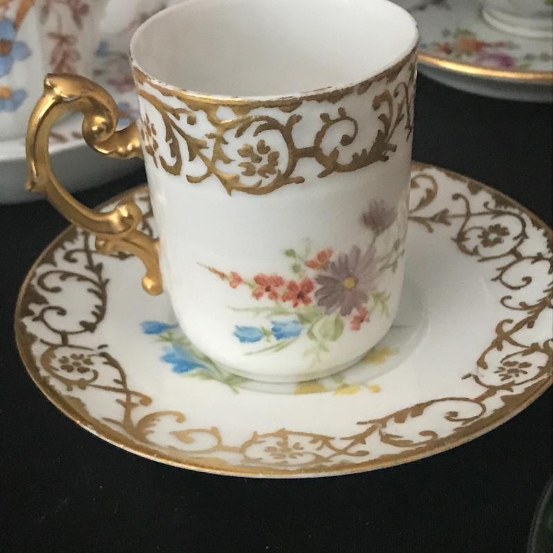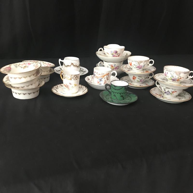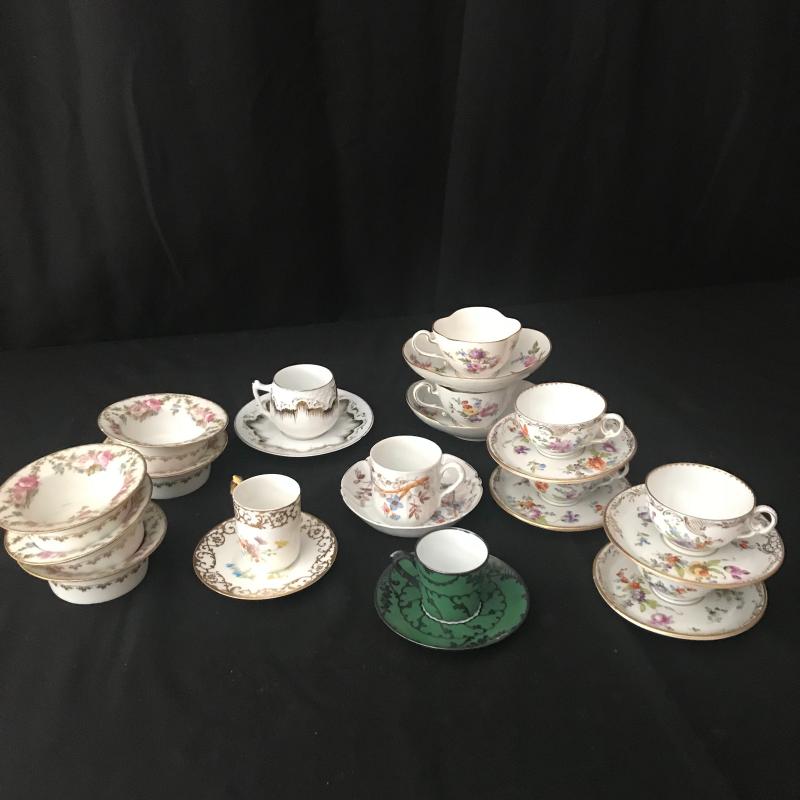 Various tea cups and saucers by French and unknown makers. 5 Limoge Dishes also included in this lot. Available for shipping or local pick up.