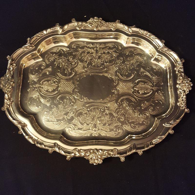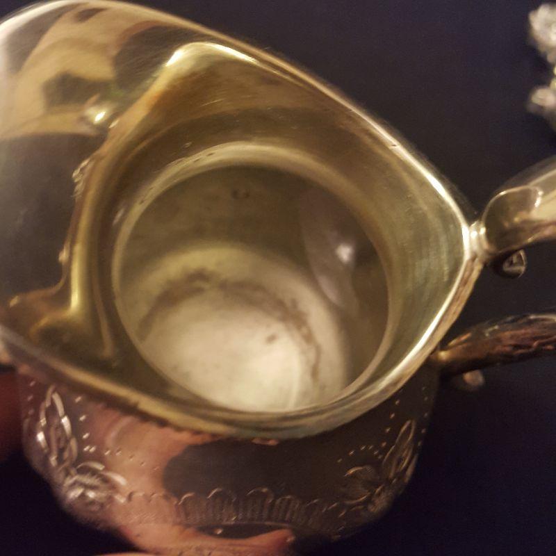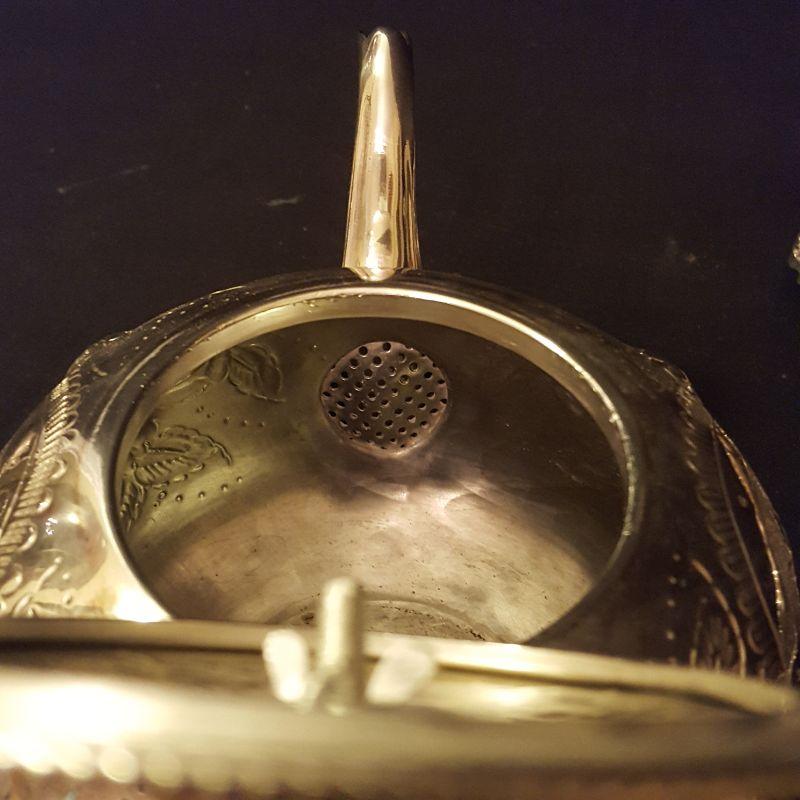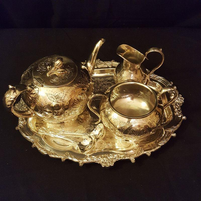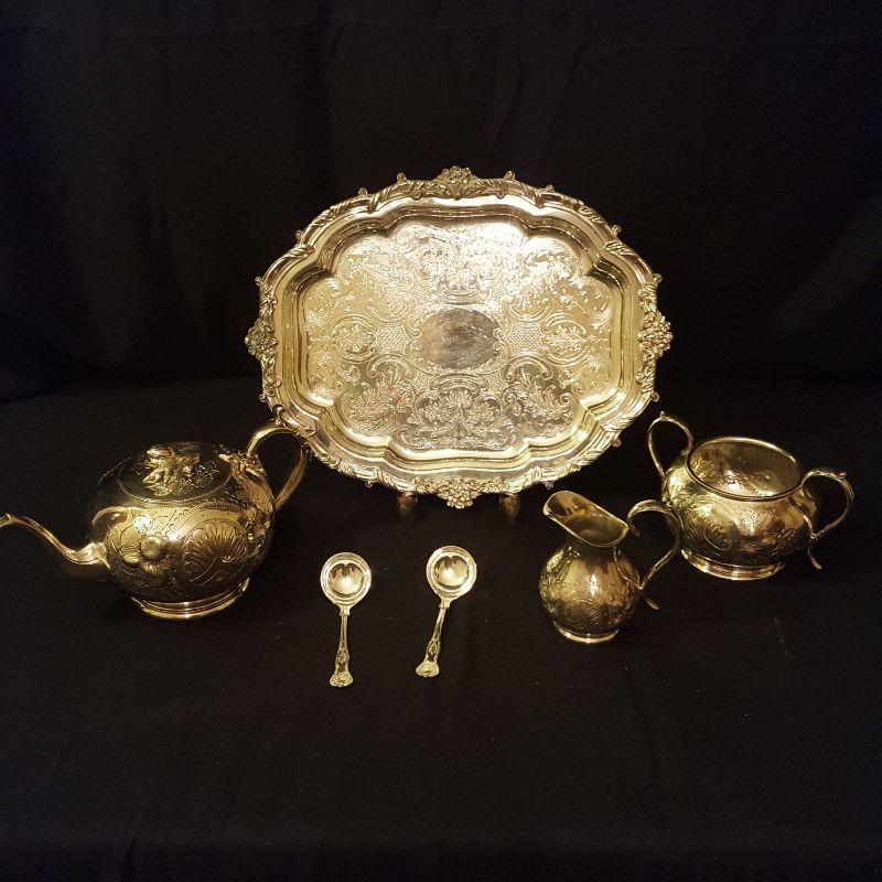 Tea is on! This beautiful detailed tea set will bring you joy to having afternoon tea. The ornate tray measures 14x12 inches, perfect for carrying the tea set. The tray is heavy to the touch. The tea pot is just gorgeous, from the engravings on the side to the plant and leaves on the top. The pot measures 10x6 inches. The matching creamer and sugar bowl have plenty of room for those who need that added extra to their tea. The matching spoons appear to be in great condition.