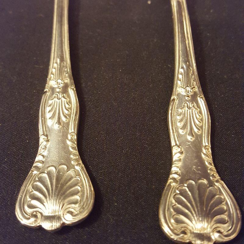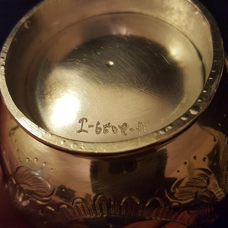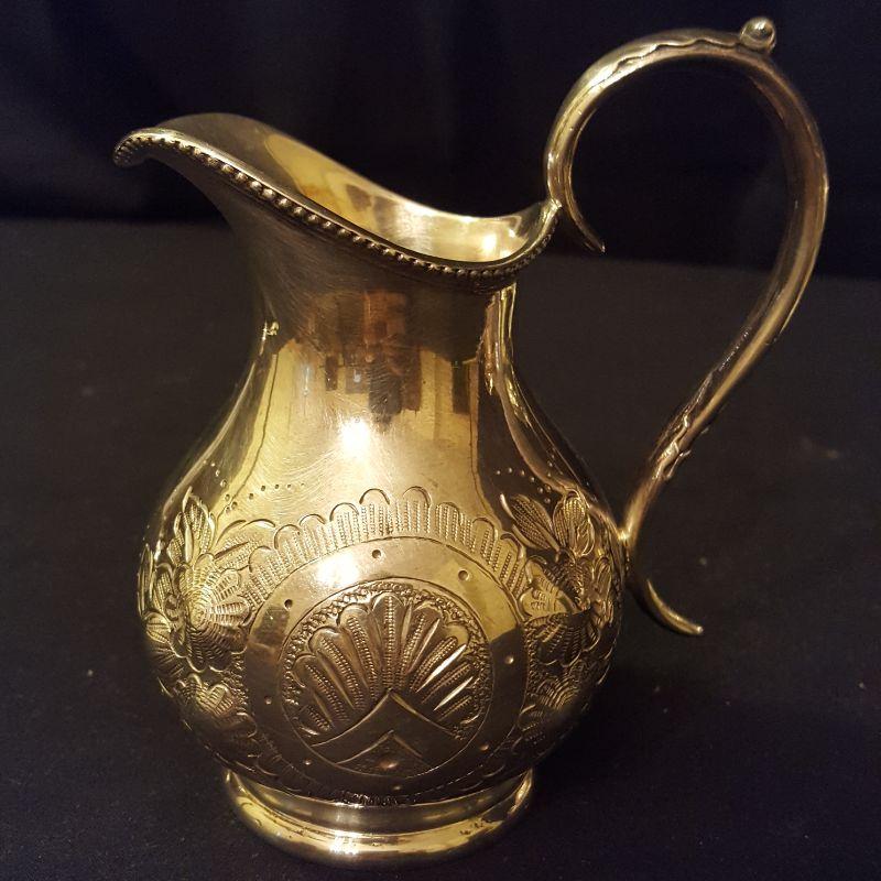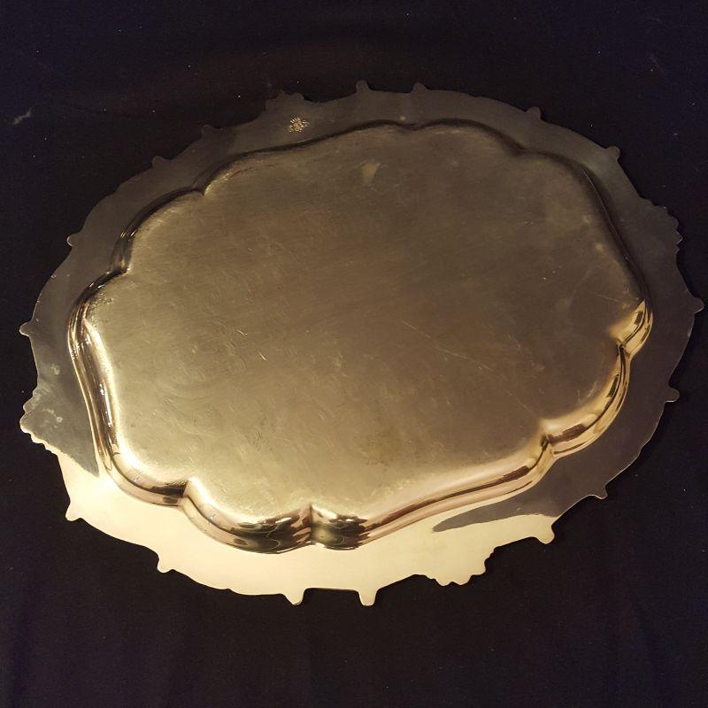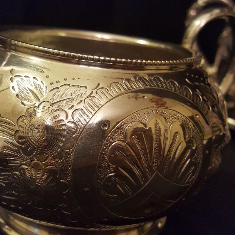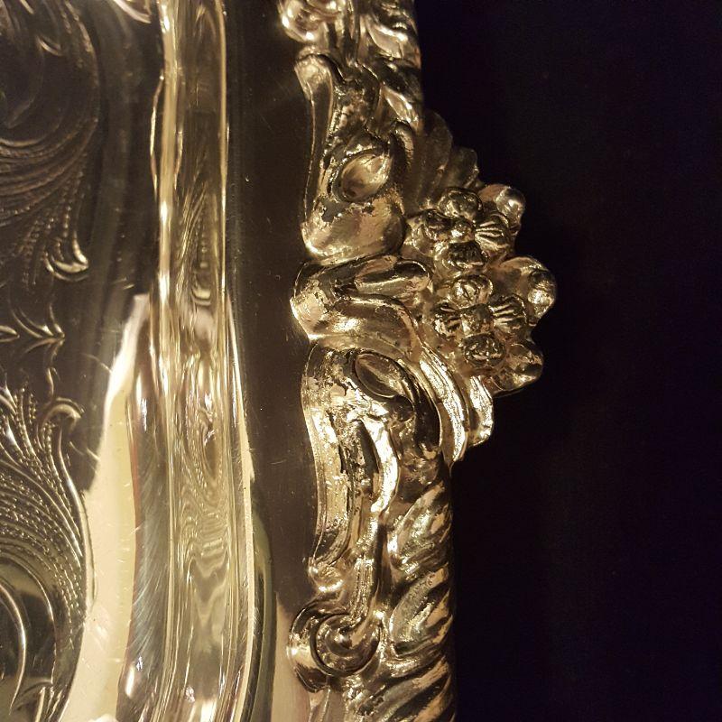 Tea is on! This beautiful detailed tea set will bring you joy to having afternoon tea. The ornate tray measures 14x12 inches, perfect for carrying the tea set. The tray is heavy to the touch. The tea pot is just gorgeous, from the engravings on the side to the plant and leaves on the top. The pot measures 10x6 inches. The matching creamer and sugar bowl have plenty of room for those who need that added extra to their tea. The matching spoons appear to be in great condition.