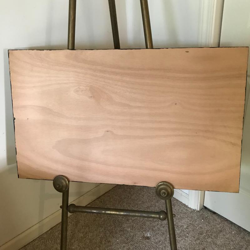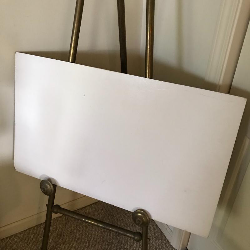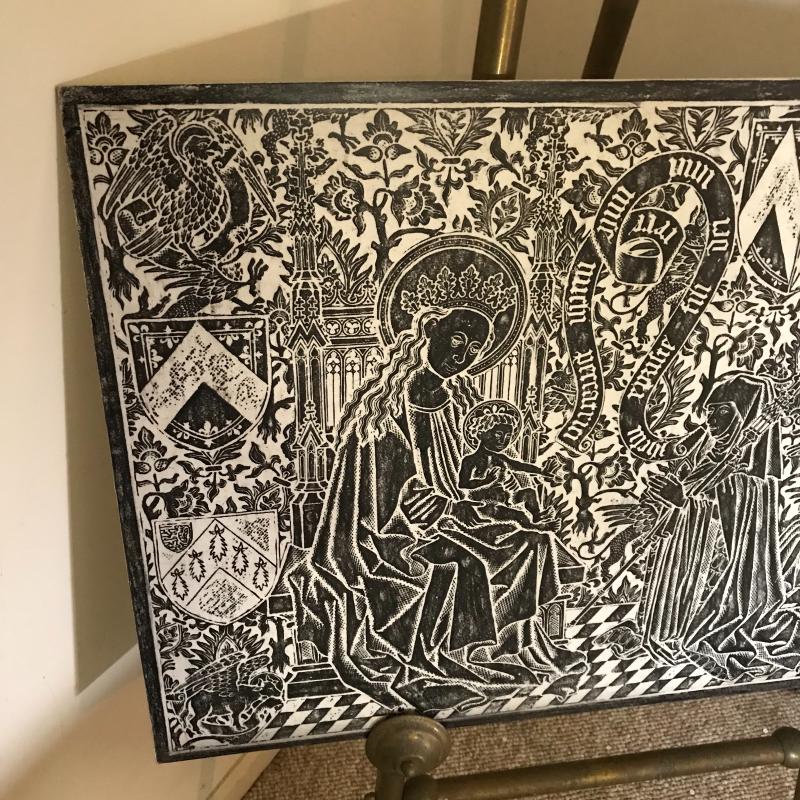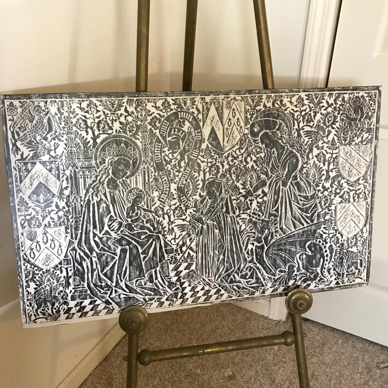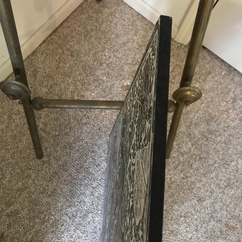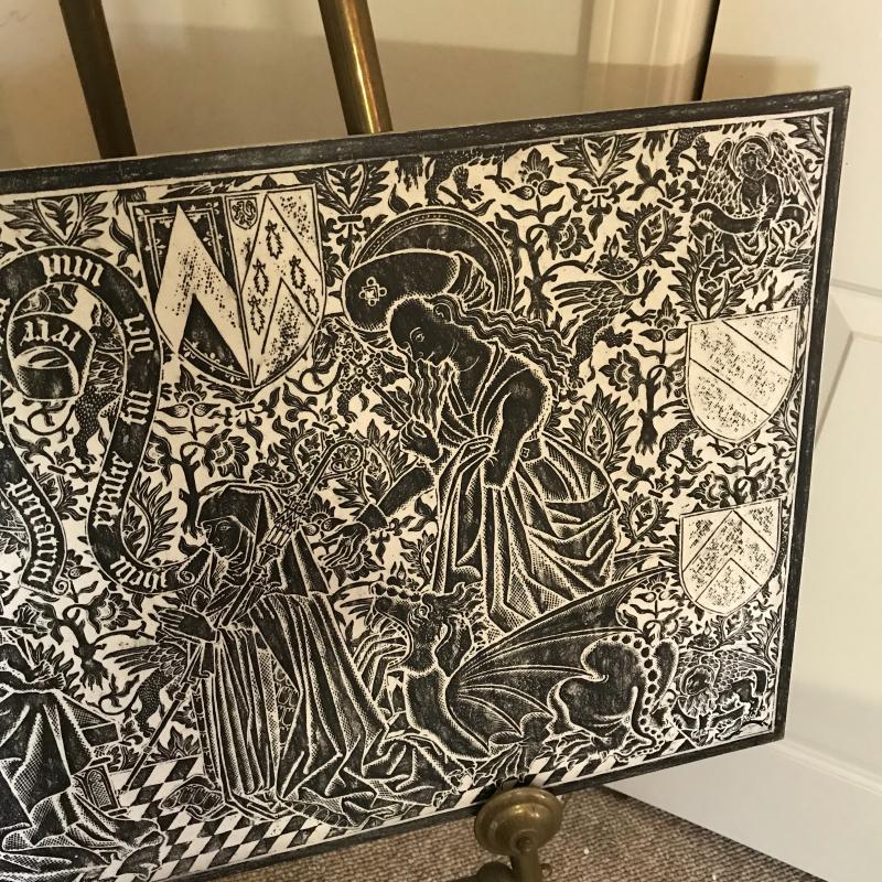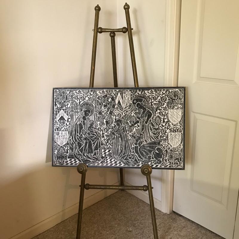 Tall brass easel with a pair of ornate mythical themed rubbings one pressed on particle board and the other appears to be tag board. Amazing details including feathers, talons, a dragon, a queen with child. Zoom in to catch all the details. Brass rubbings are done by stretching a linen rag paper over the deeply etched monumental brass that is usually found at the gravesite. After securing the paper, heelball (a very hard wax) is rubbed vigorously over the paper surface to get an exact copy of the brass plate. A single rubbing can take from 2 hours to 2 days to complete depending in it's size, condition, and complexity.(Description taken from google) The brass easel’s front legs stand 59” high with the handle 20” from base. Height is adjustable depending on angle between front and back legs. Use for the rubbings or for any nice art piece that you want to highlight. Rubbings are similar in size, the particle board rubbing is at 33” x 19.5” while the second rubbing is 32” x 19.5”. No shipping.